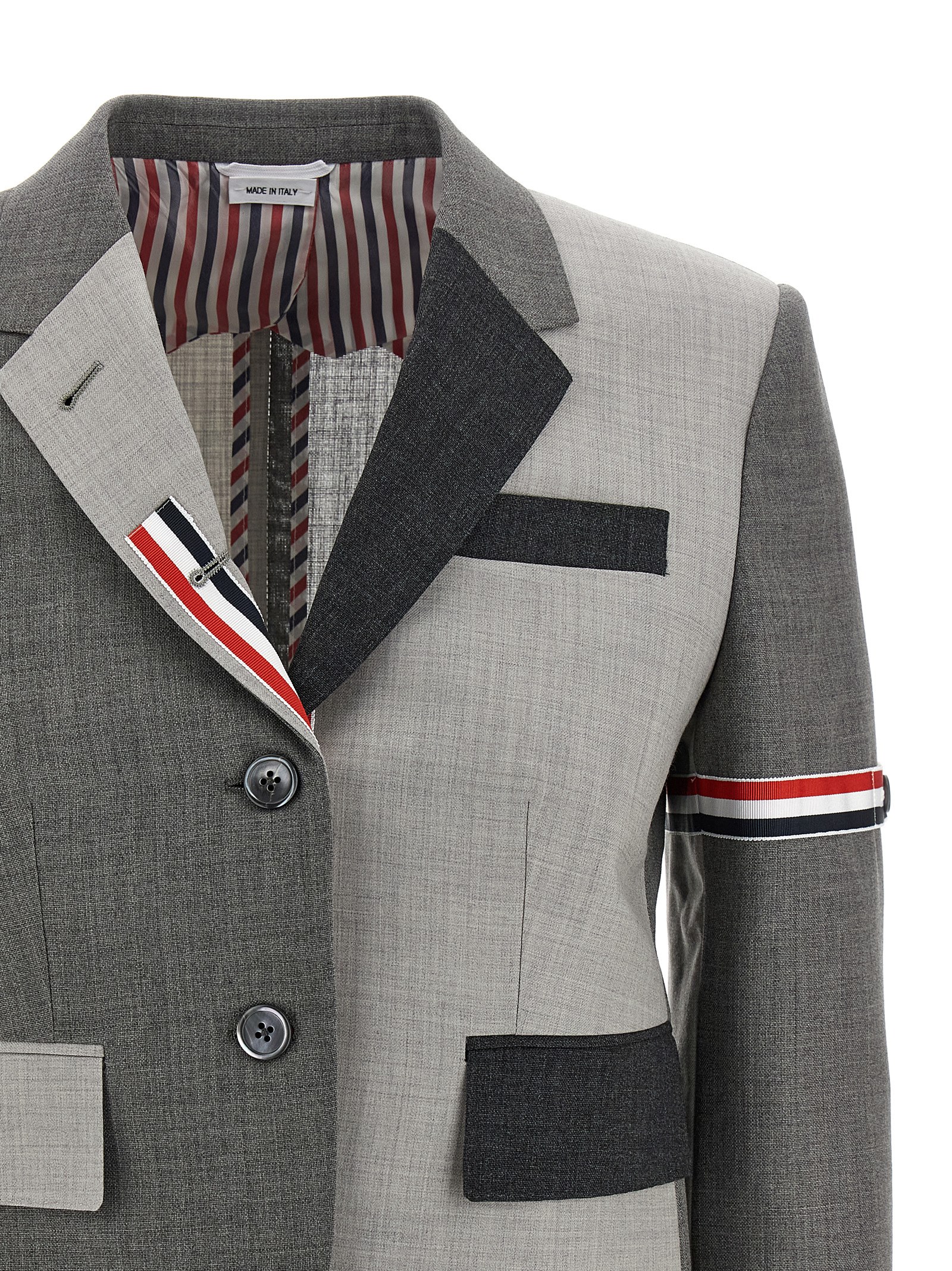 'Fun-Mix' single-breasted wool blazer with different color panels, front button closure, striped grosgrain tape details, breast pocket, flap pockets, striped lining, long sleeves, structured shoulder strap, side slits.