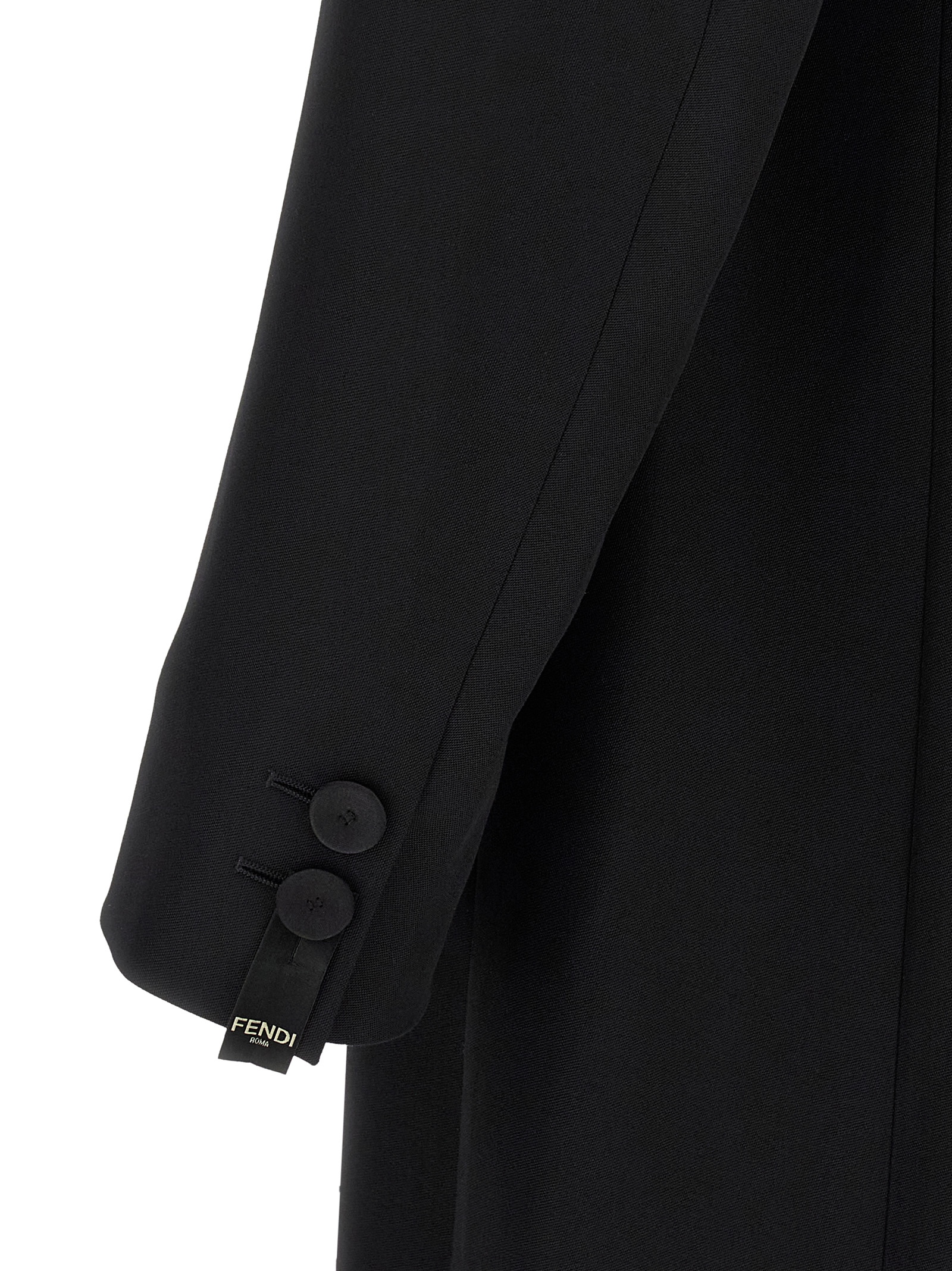 Single breasted crepe wool coat with double layer satin lapel with front button closure, mirror lapels, breast pocket, flap pockets, structured shoulder strap, long sleeves, back vent, cupro lining.