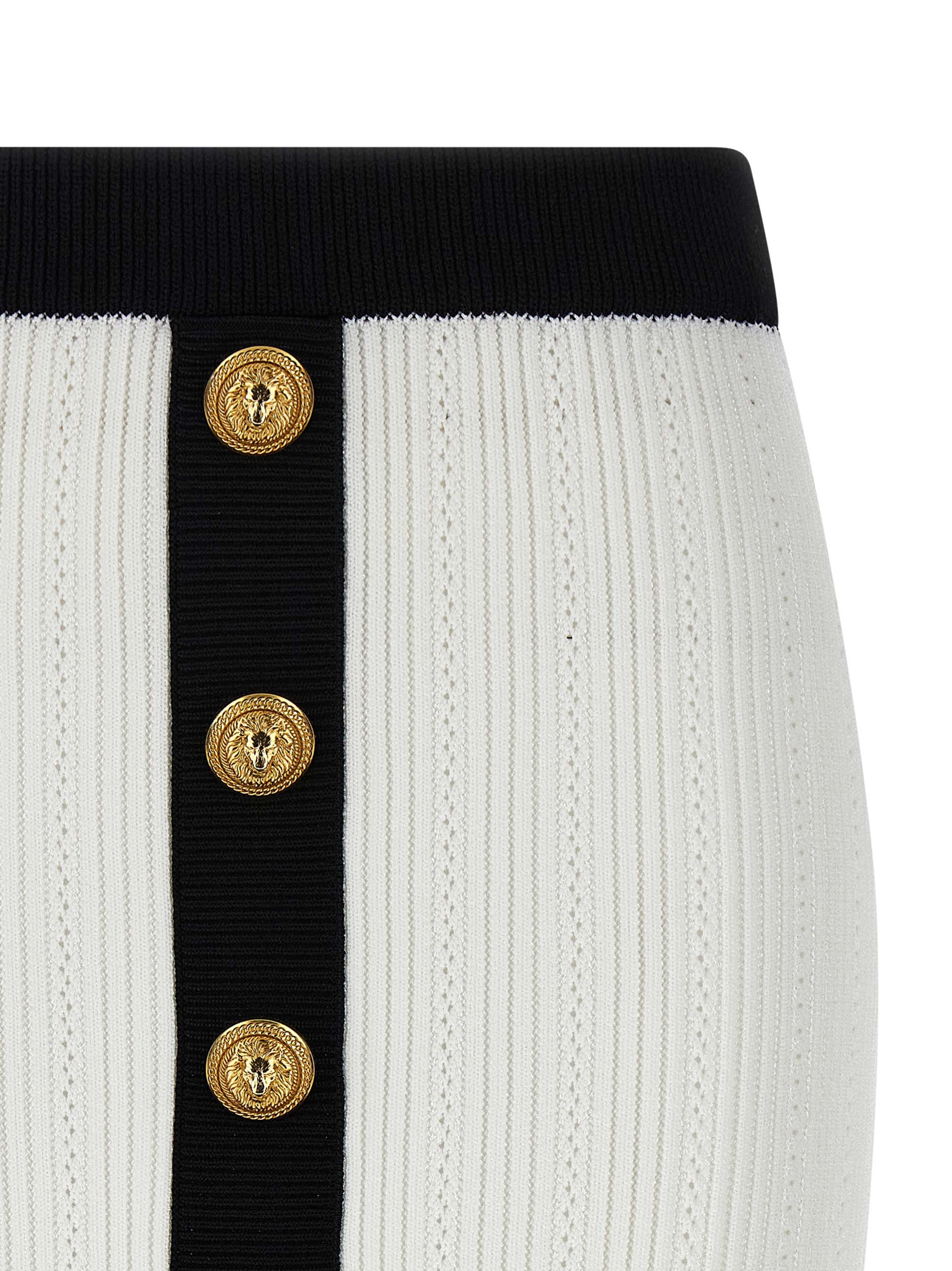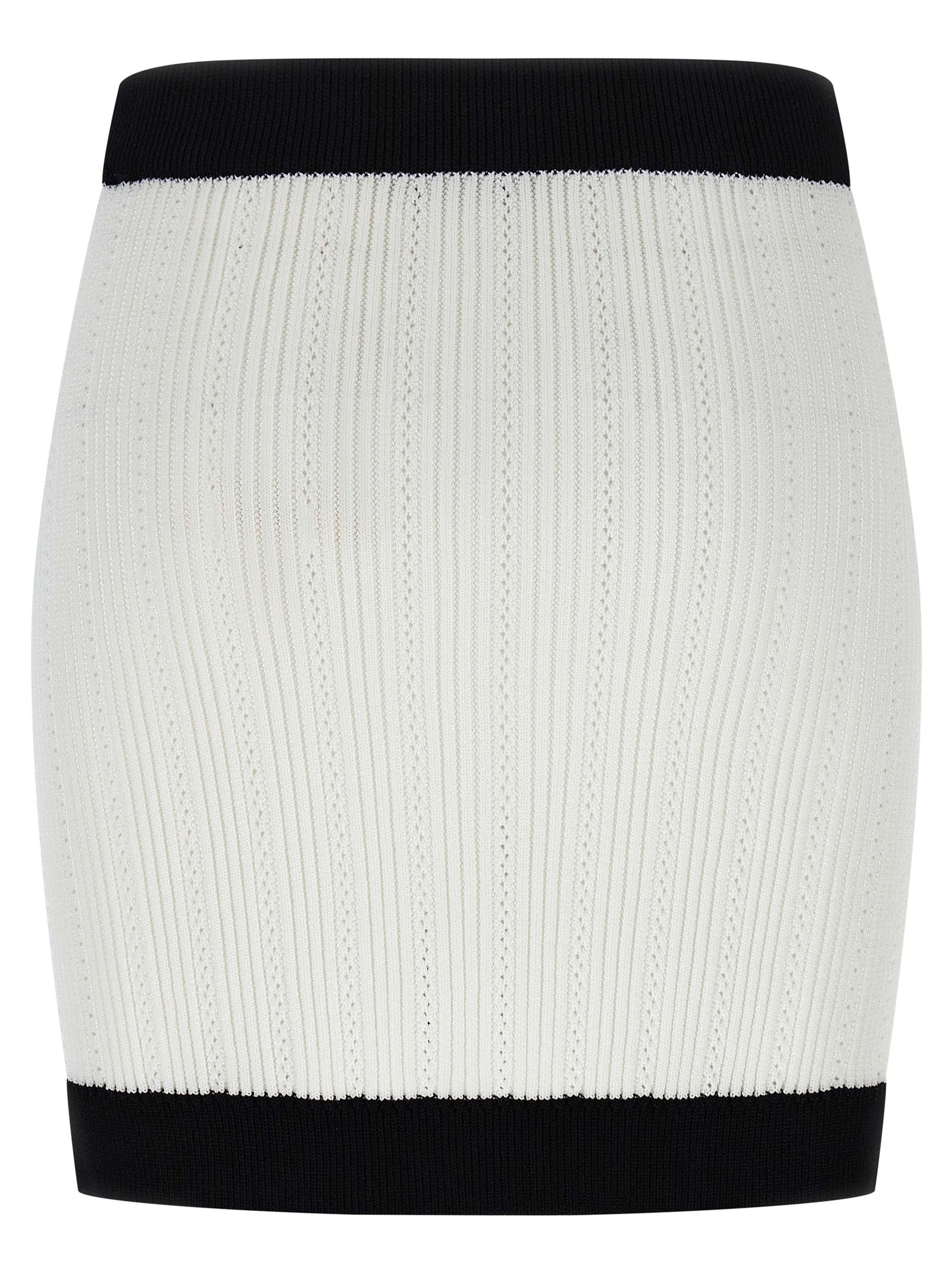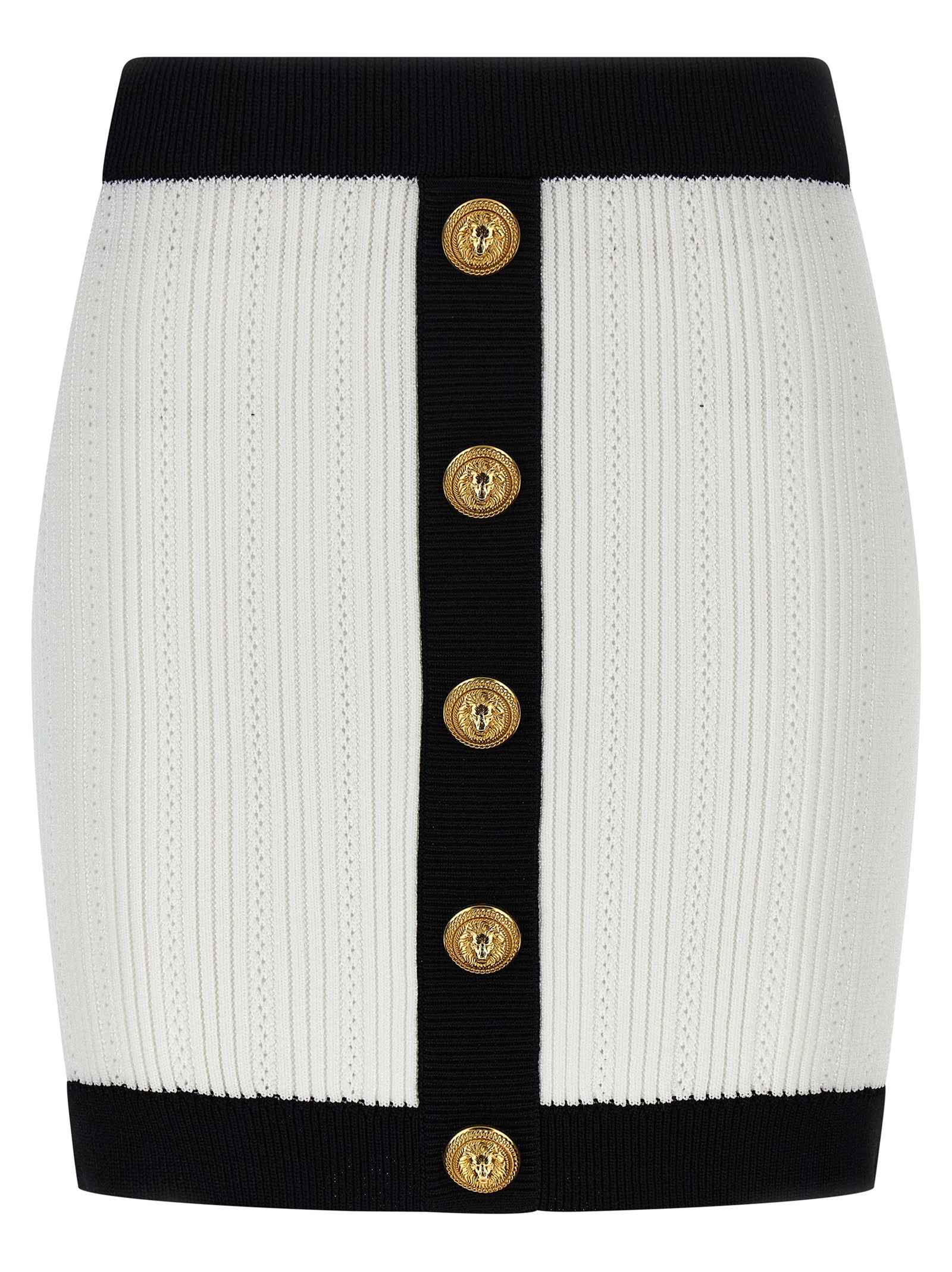 Mini skirt in two-tone stretch viscose crocheted, front metal buttons, elastic waistband.