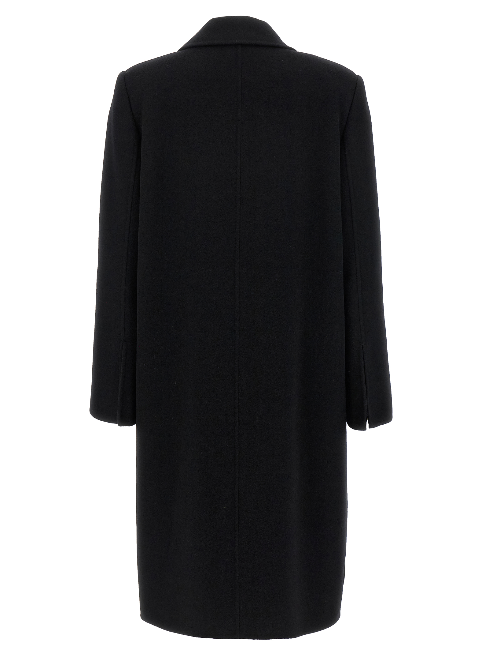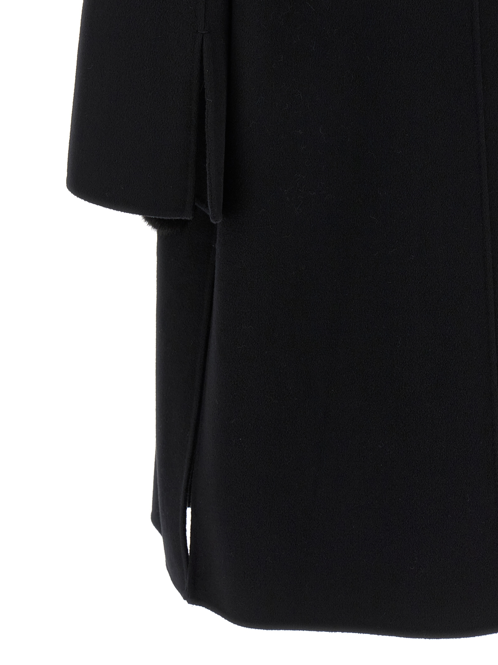 Двубортное шерстяное пальто Doble Wool с лацканами и застежкой на пуговицы с логотипом, глубокими боковыми разрезами, длинными и широкими рукавами с разрезами внизу, передними карманами с мехом лисы и логотипом.