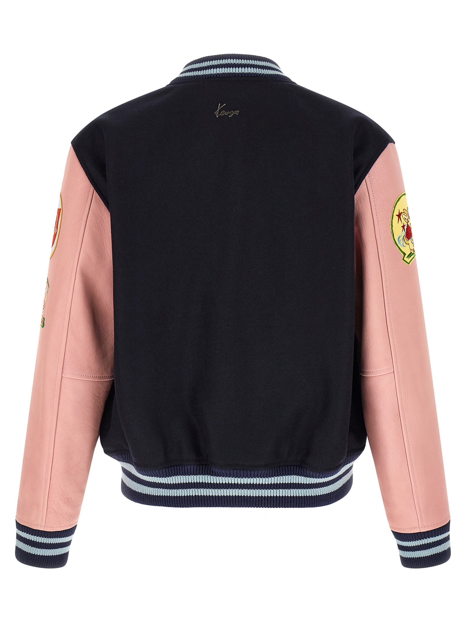 KENZO Badges' wool jacket with contrasting sleeves and leather details, varsity stretch ribbed knit details, front and sleeves, high neck, front snap button closure, pockets, long cuffed sleeves, headband, viscose lining.