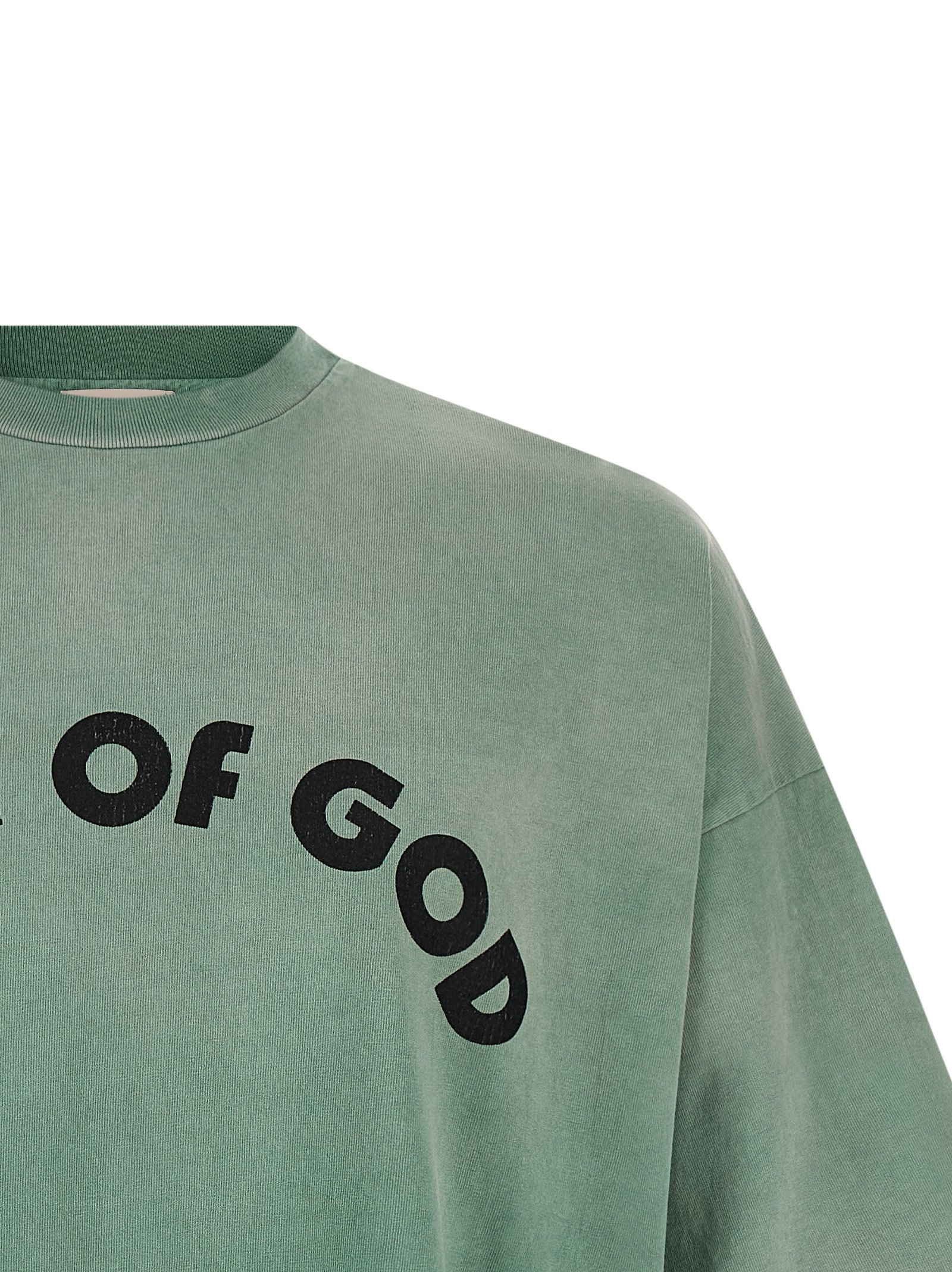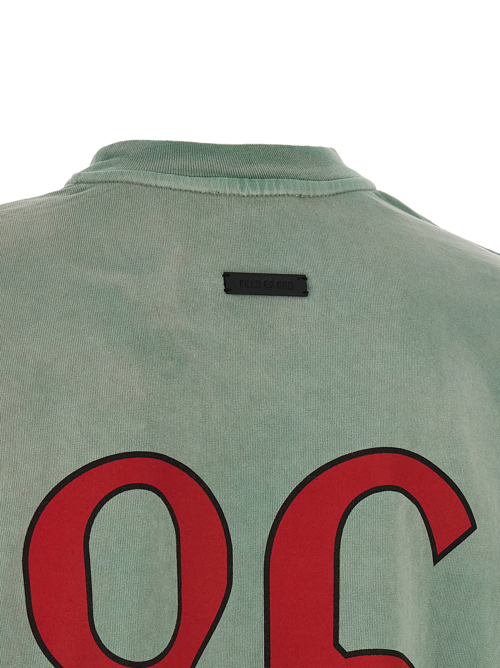 Футболка из плотного хлопкового трикотажа «Fear of God 26», прошедшая обработку для защиты от выцветания и воздействия солнечных лучей, с нанесенным вручную рисунком спереди и сзади, круглым вырезом, короткими рукавами и приспущенными плечами, кожаной нашивкой с тисненым логотипом на спине.Характеристики товара