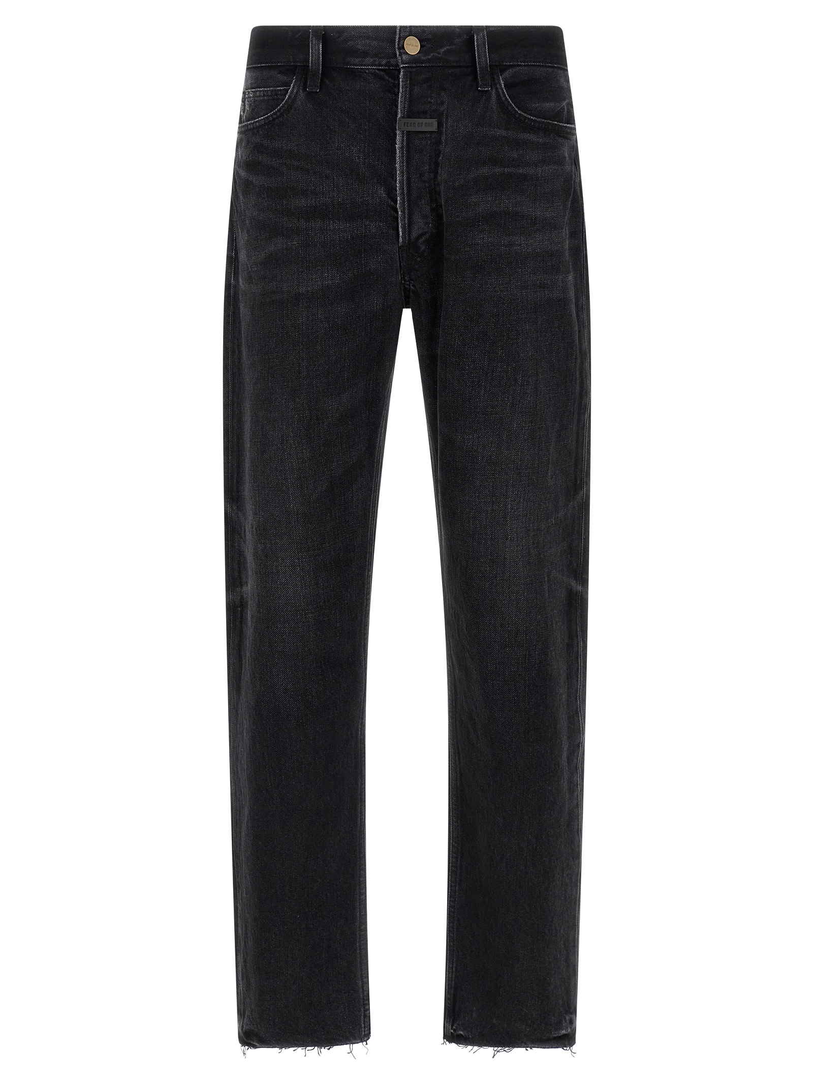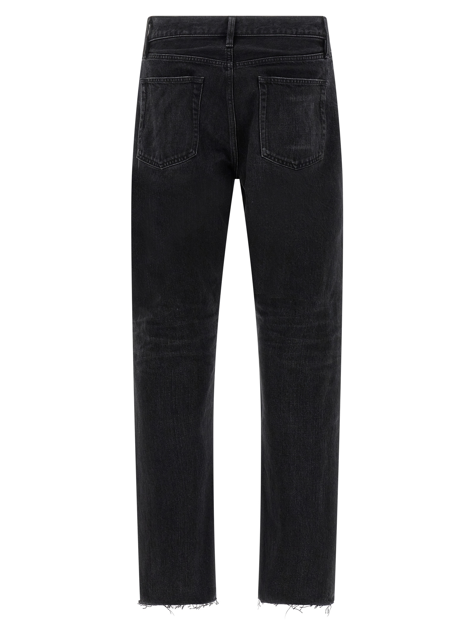 'Classic 5 Pocket' jeans in used-effect delavé cotton denim, button closure with front logo patch, five pockets, straight leg with raw cut hem.