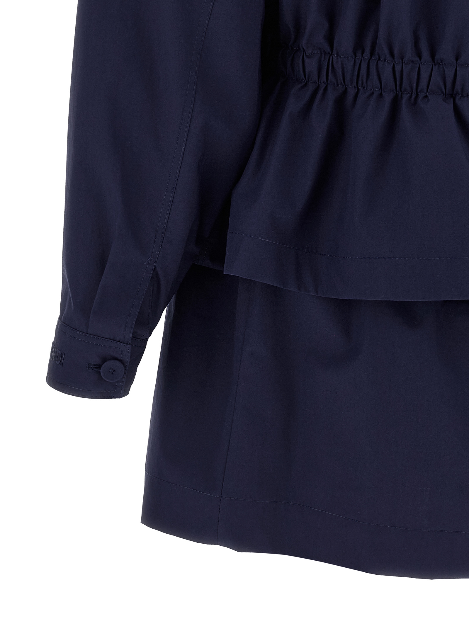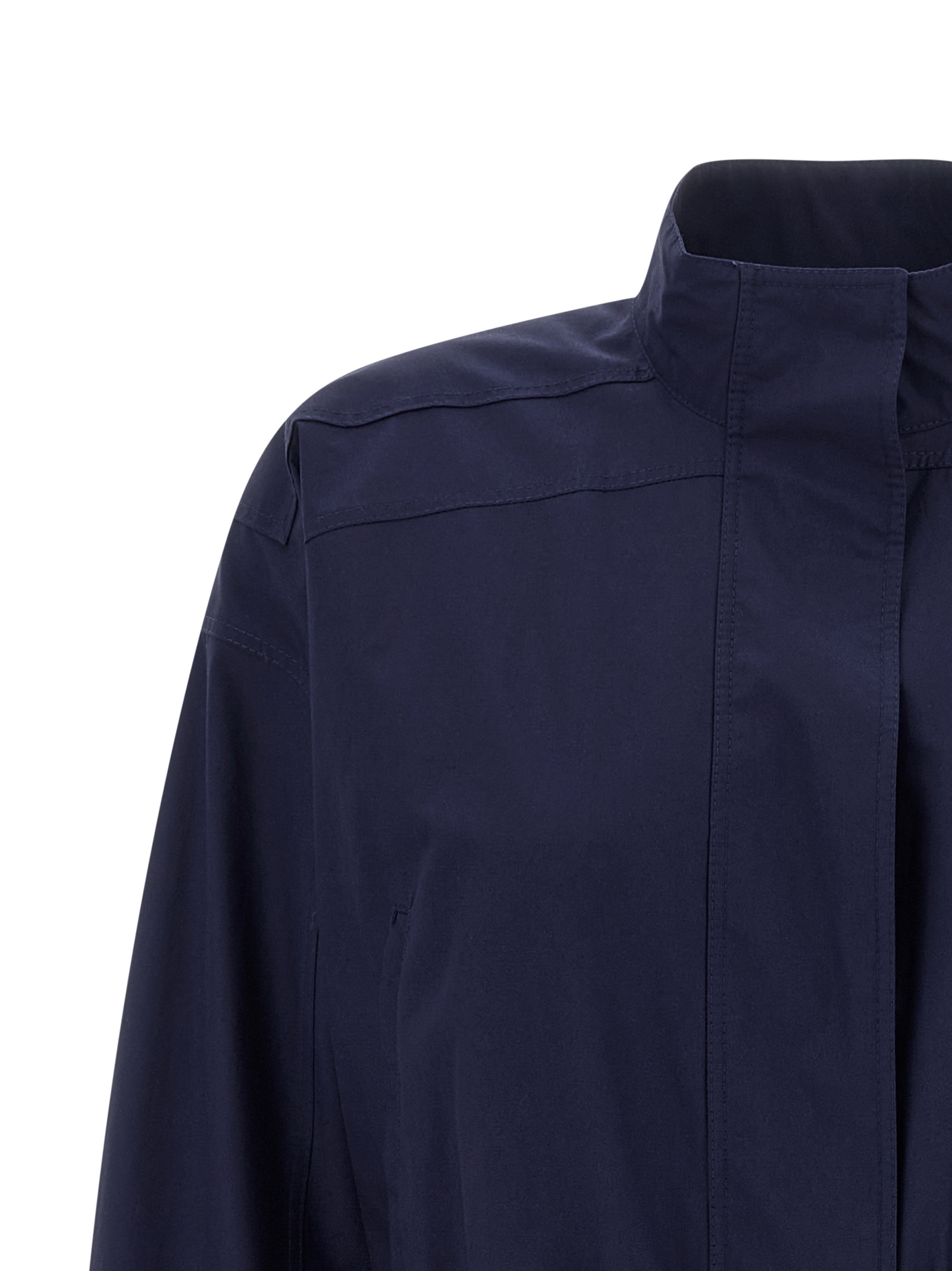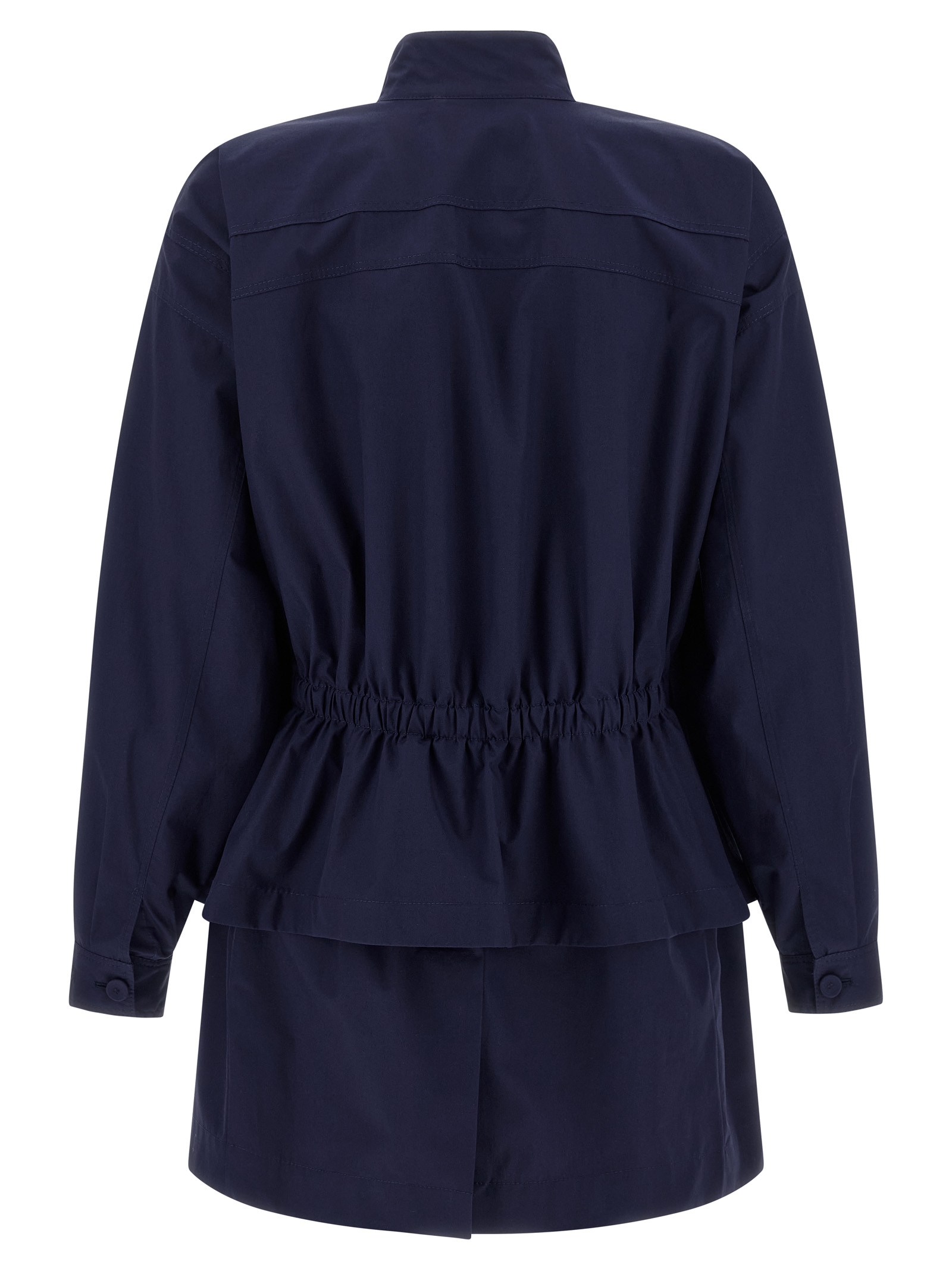 Cotton poplin jacket with Saharan lining, standing collar, front zip and snap button closure, pockets, peplos elastic waistband, long sleeves with cuffs and tone-on-tone embroidered logo, and back slit with button.
