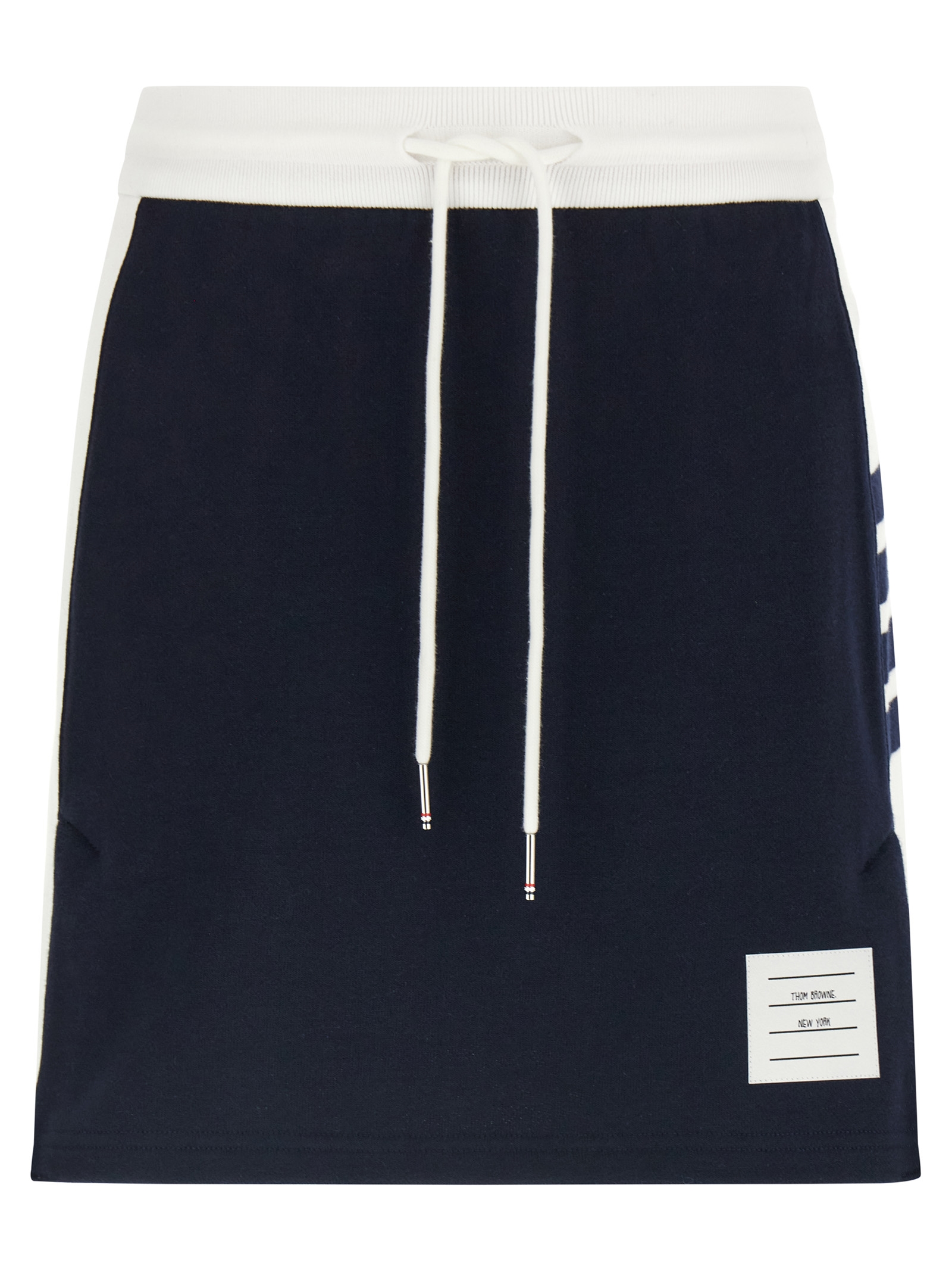 Two-tone cotton jersey mini skirt, side 'Classic 4-Bar' detail, adjustable drawstring elastic at the waist, logo patch and front slits with grosgrain RWB tape.