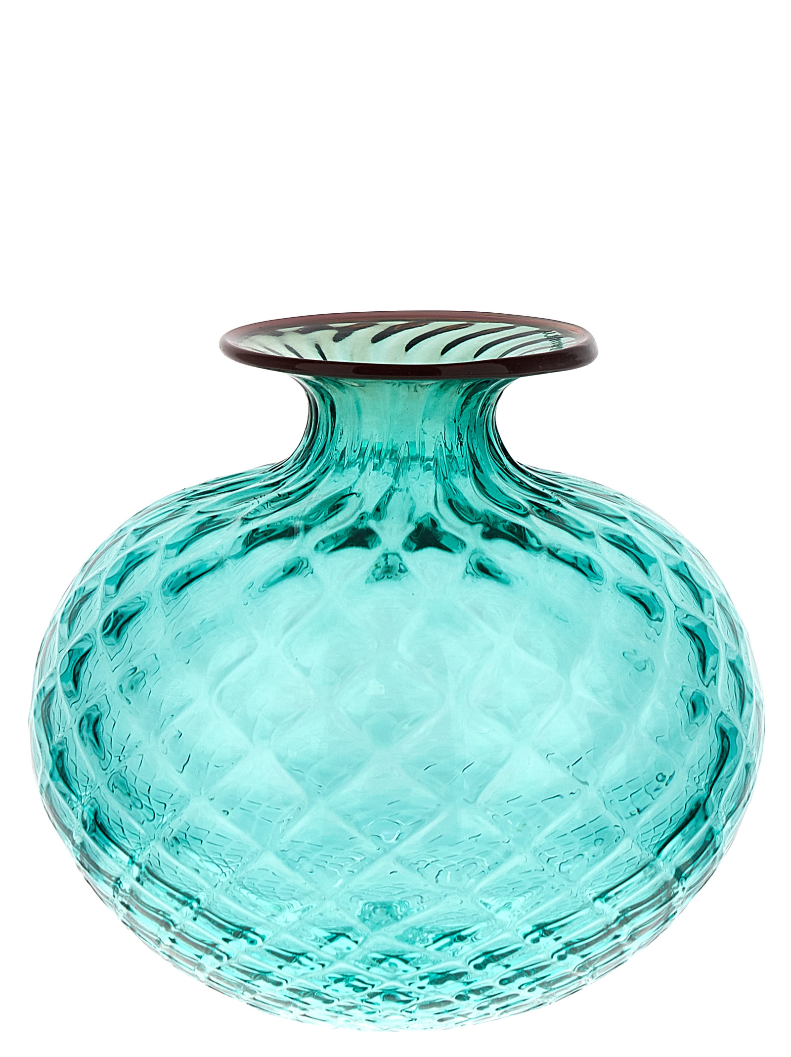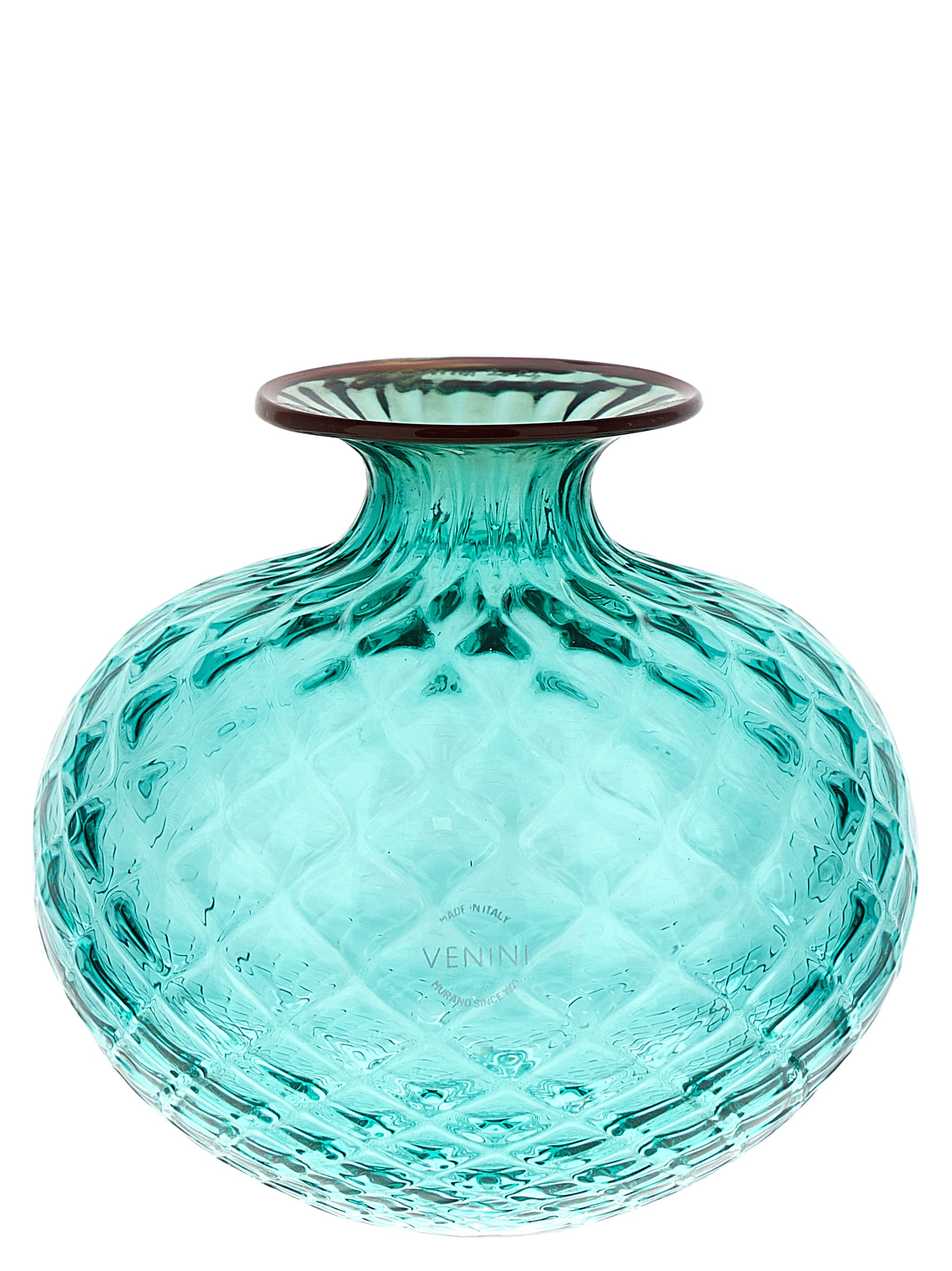 It looks soft, yet it is glass. The optical illusion of the VENINI Monofiori of 1970 is in its name: Balloton, the unique workmanship that recreates the matelassé effect on the surface. The work is handmade, blown into the characteristic metal mold and finished in the thin neck with a hot colored thread, which varies in color.