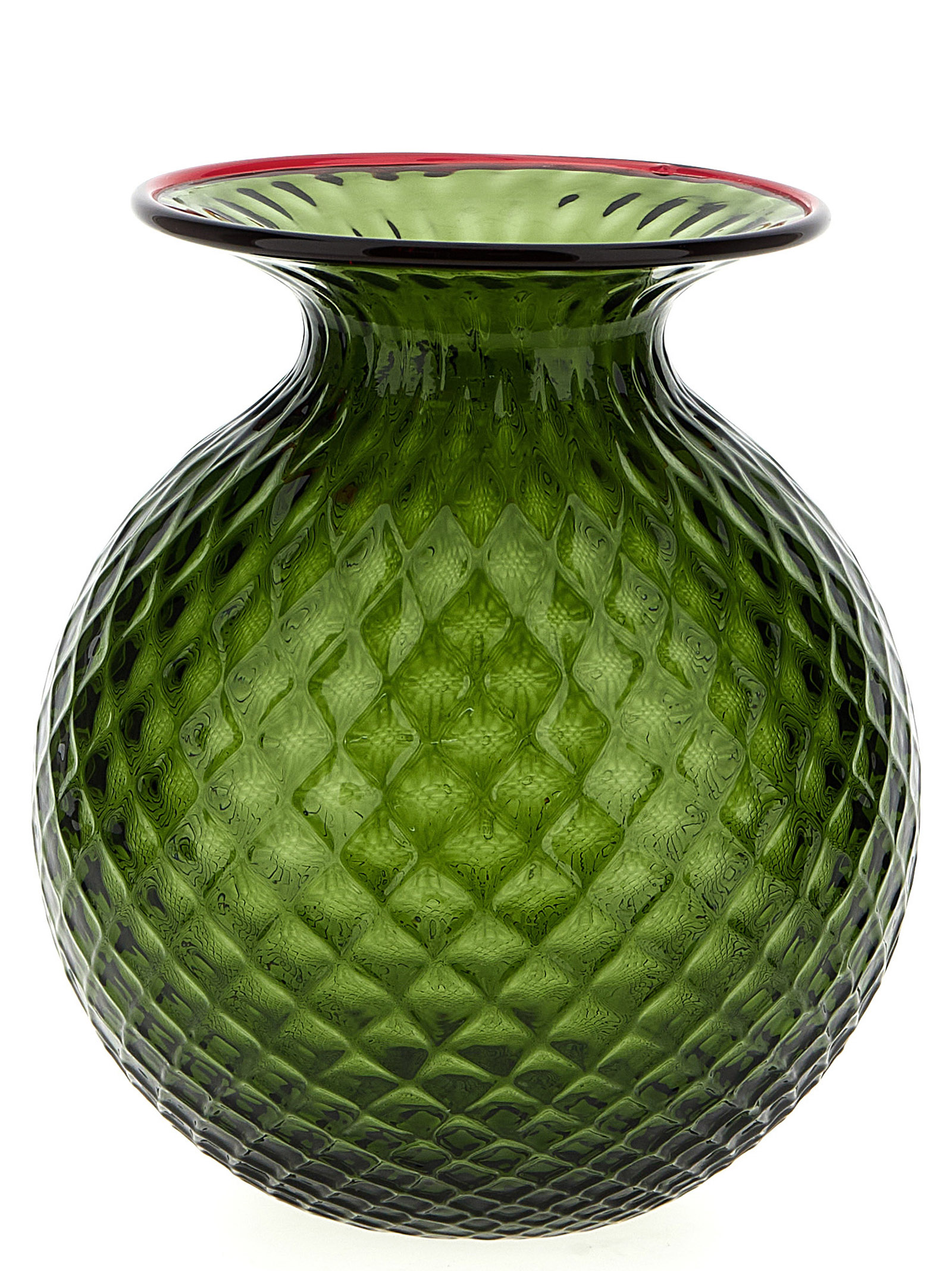 It looks soft, yet it is glass. The optical illusion of the 1970 Monofiori by VENINI is in its name: Balloton, the unique process that recreates the quilted effect on the surface. The work is handmade, blown in the characteristic metal mold and finished in the thin neck with a hot applied colored thread, which varies in color.