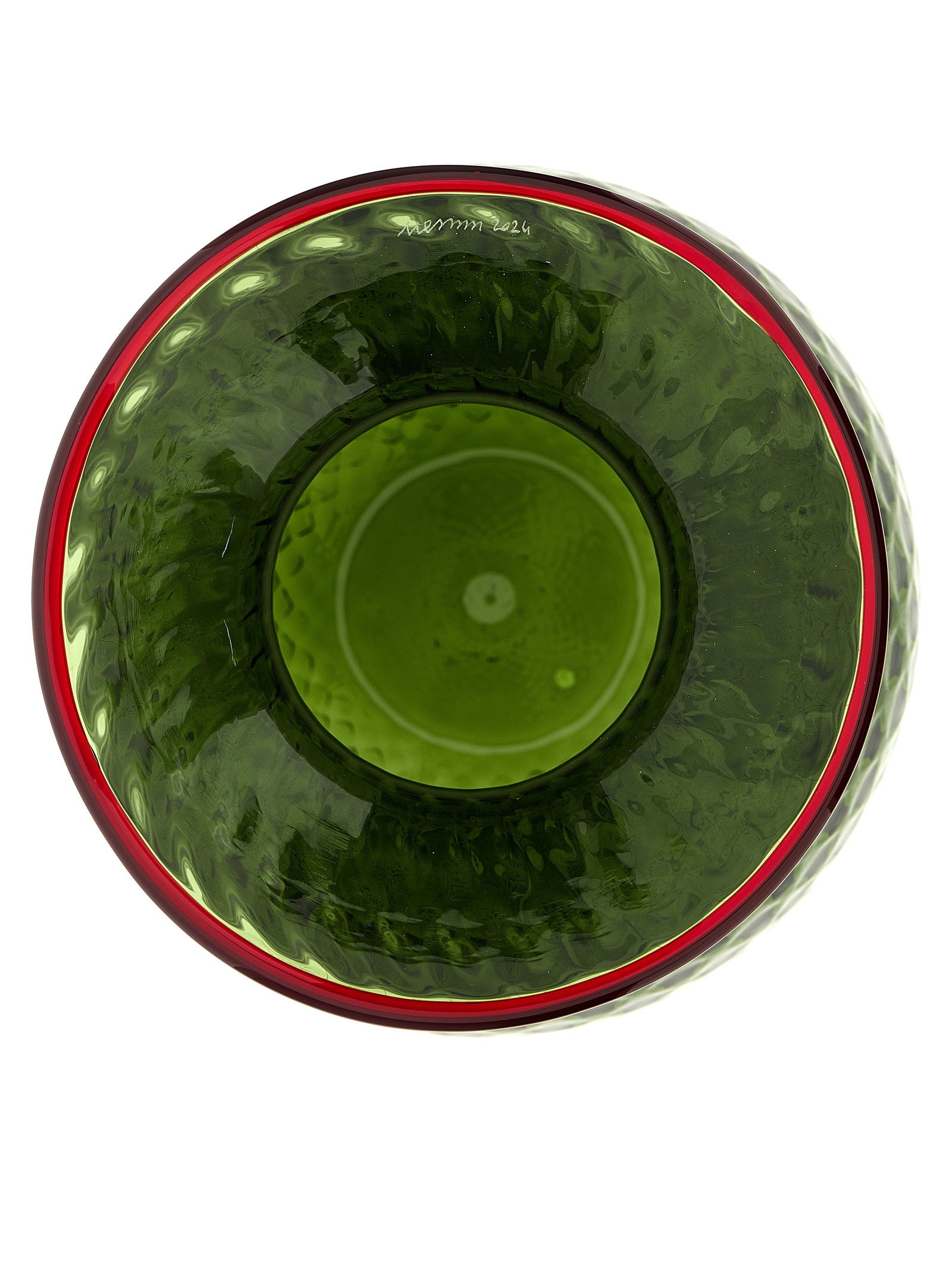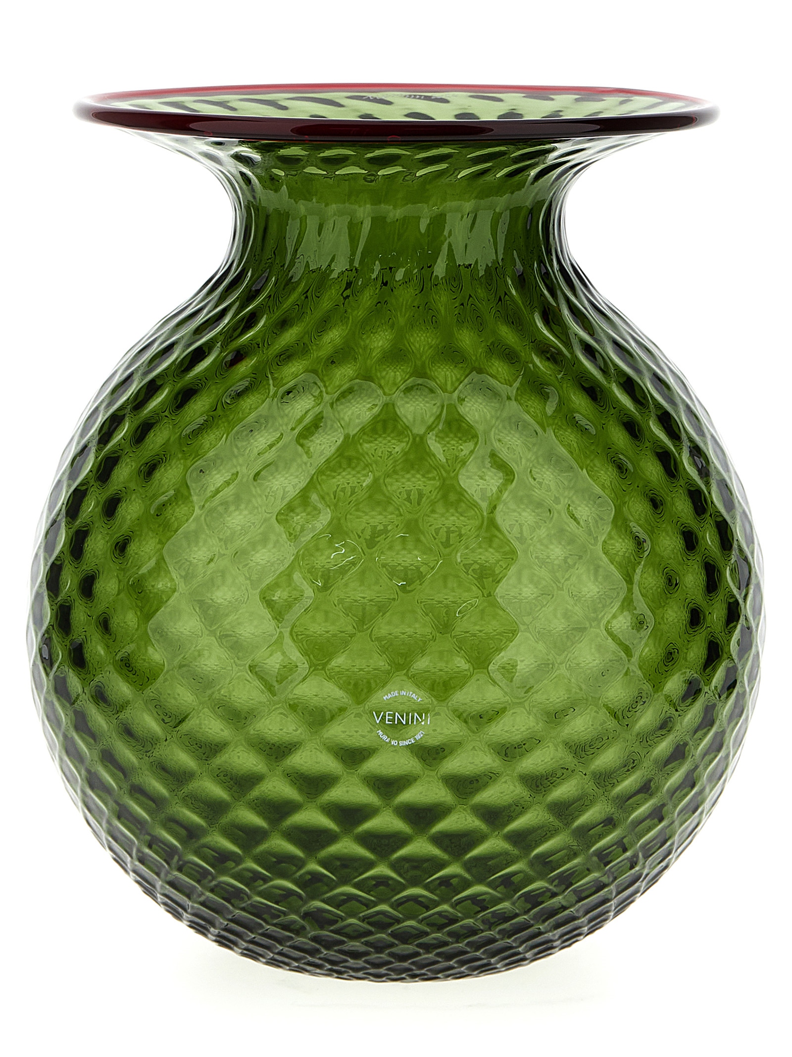 It looks soft, yet it is glass. The optical illusion of the 1970 Monofiori by VENINI is in its name: Balloton, the unique process that recreates the quilted effect on the surface. The work is handmade, blown in the characteristic metal mold and finished in the thin neck with a hot applied colored thread, which varies in color.