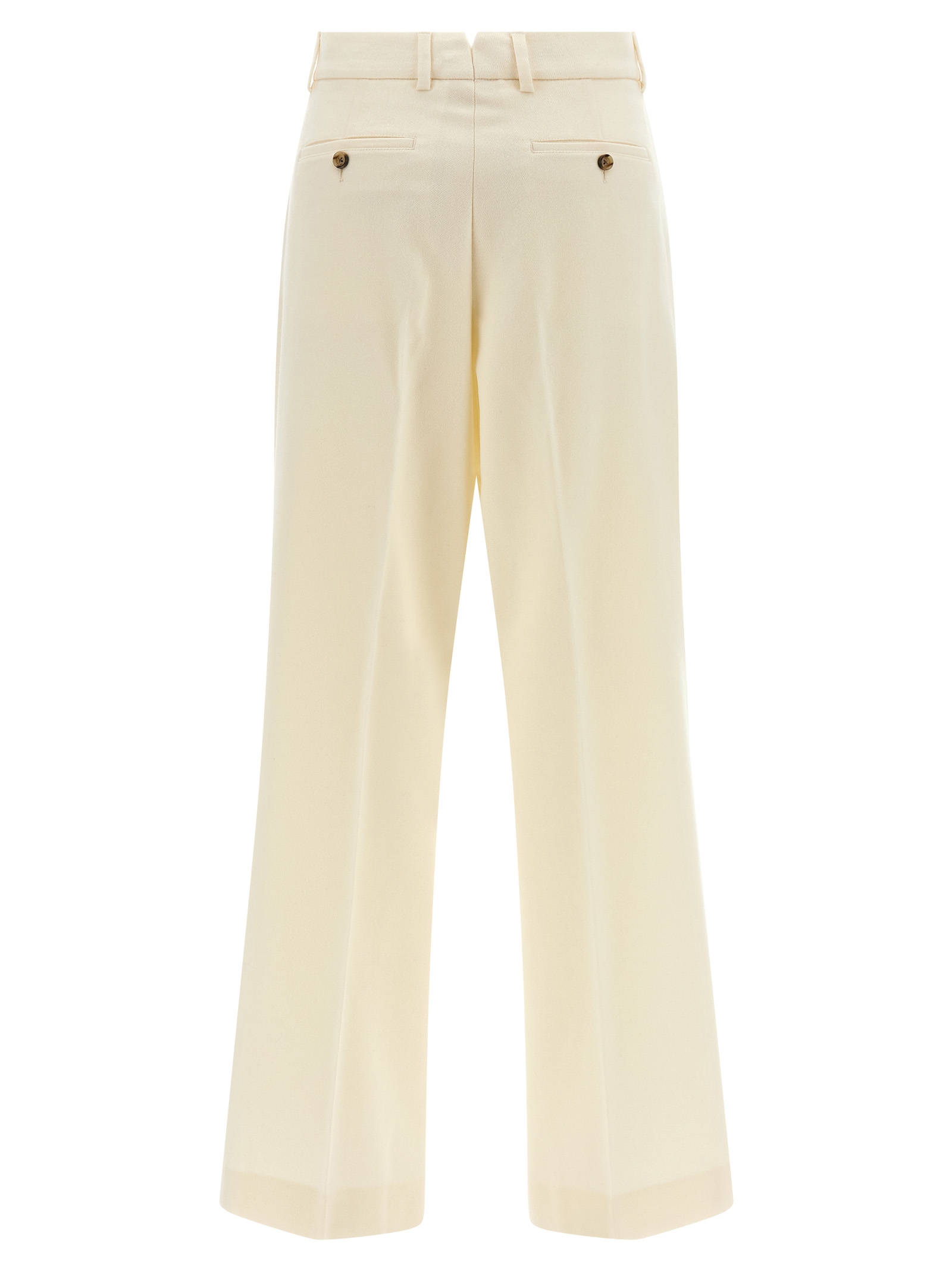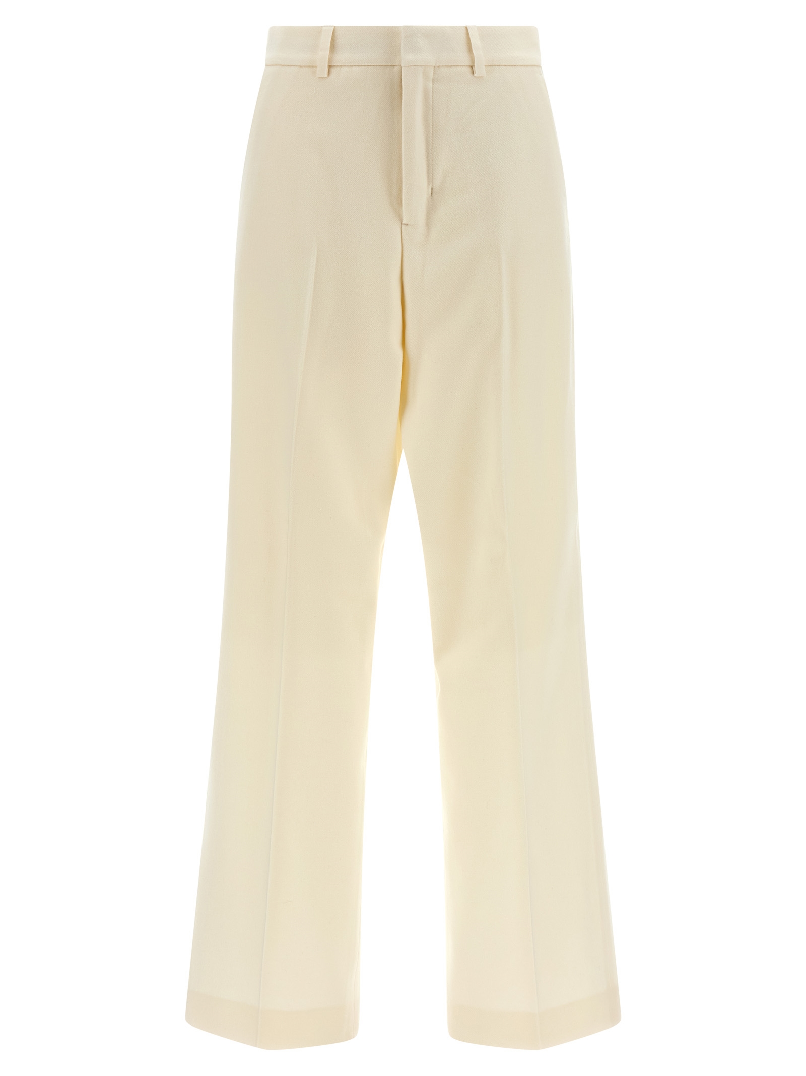 Wool trousers, straight leg, stretched pleat, zip, hook and front button closure, pockets.