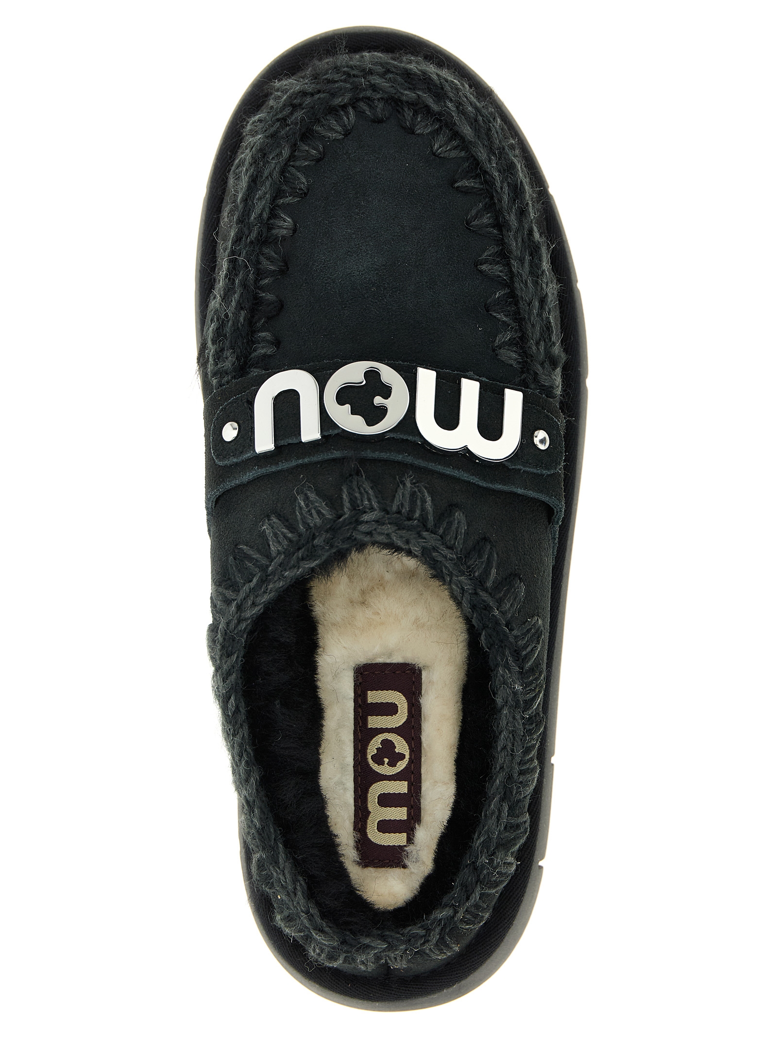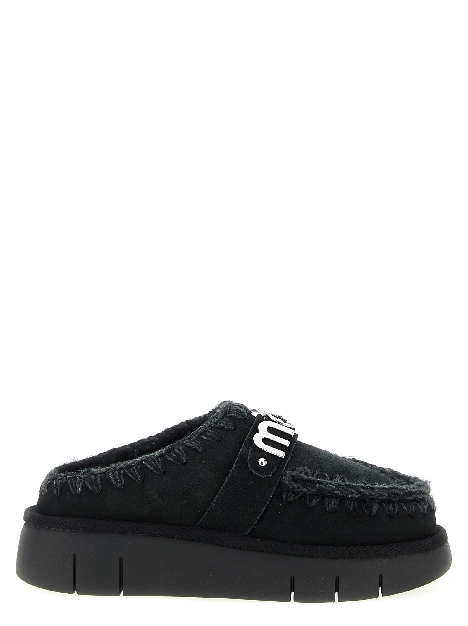 'Bounce clog' suede sabots with visible stitching, fur lining, rubber sole, front metal logo.