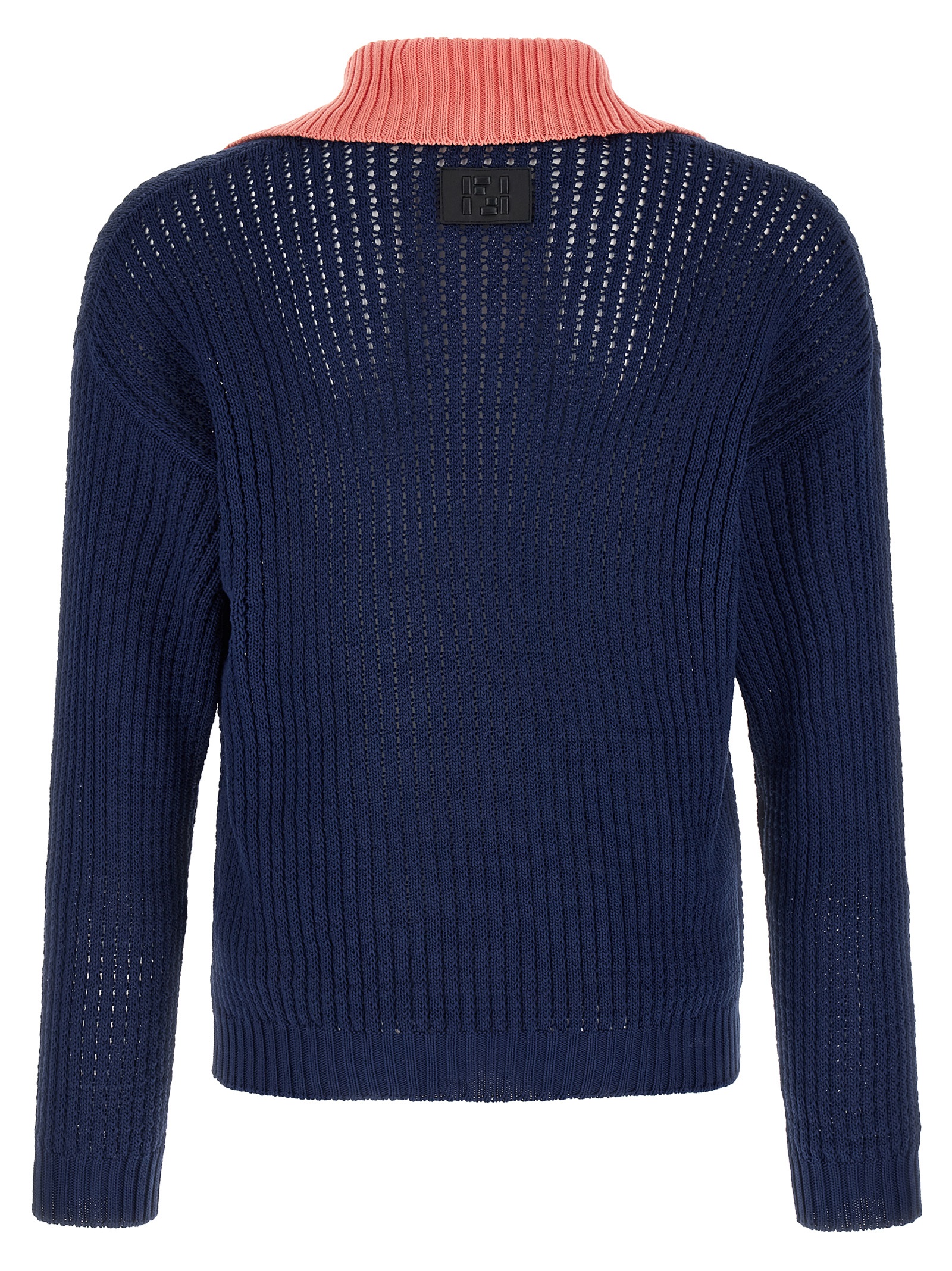 Cotton yarn sweater with see-through effect cablé braided pattern, contrast colorblock V-neck collar, long sleeves with cuffs and dropped shoulders, leather logo tag with 'FF Selleria' detail.