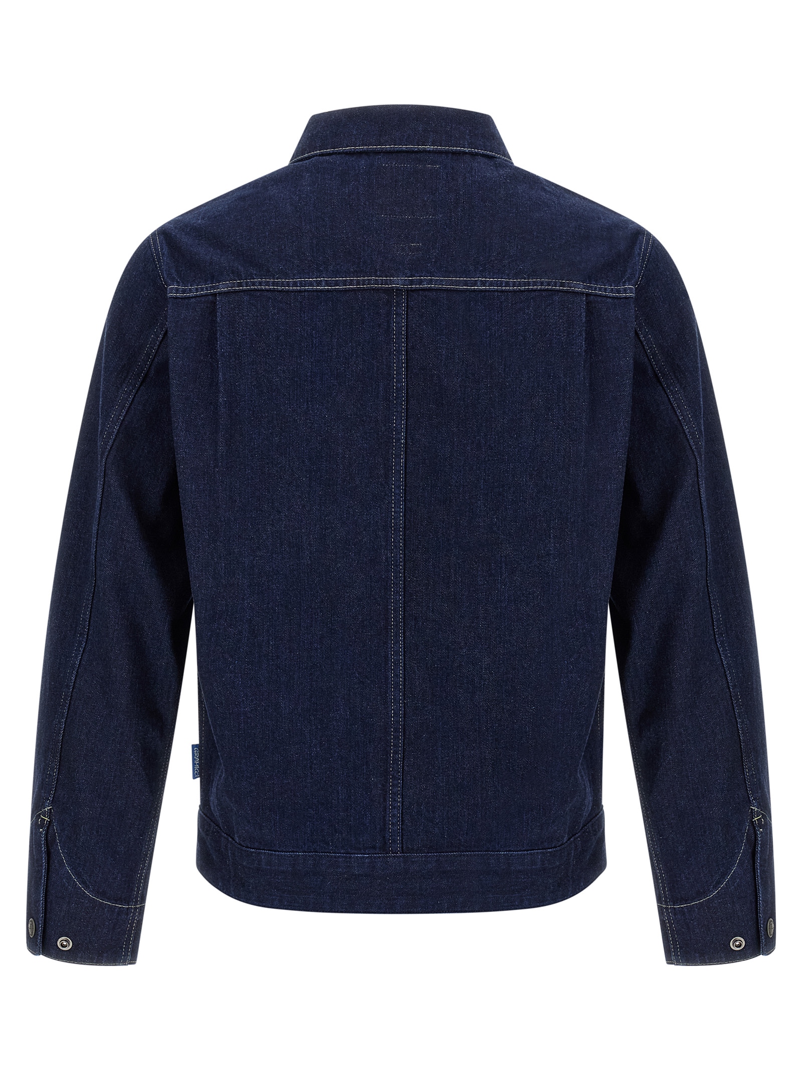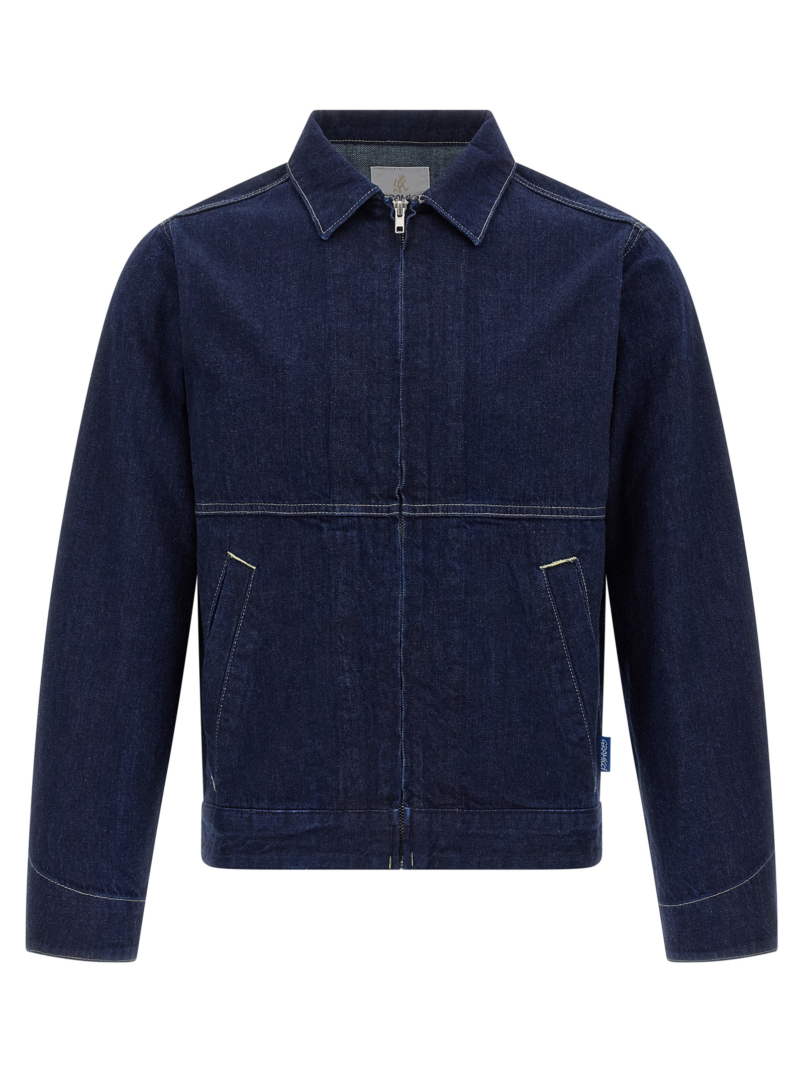 'Japanese Slub' jacket in Japanese Kaihara denim woven with Cordura® nylon, contrast stitching, shirt collar, front zip closure, pockets, long cuffed sleeves.
