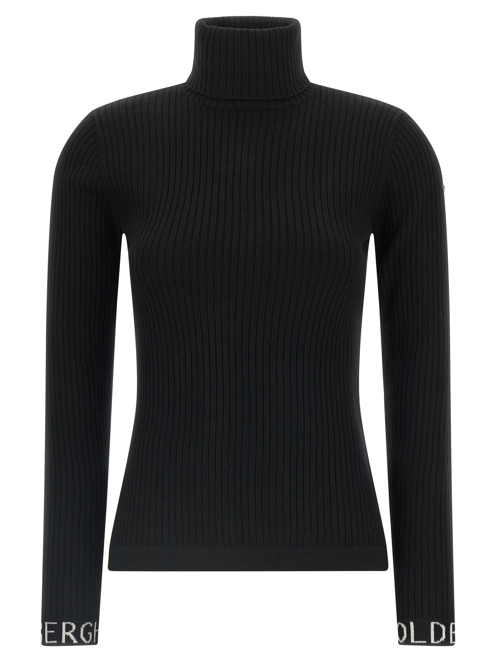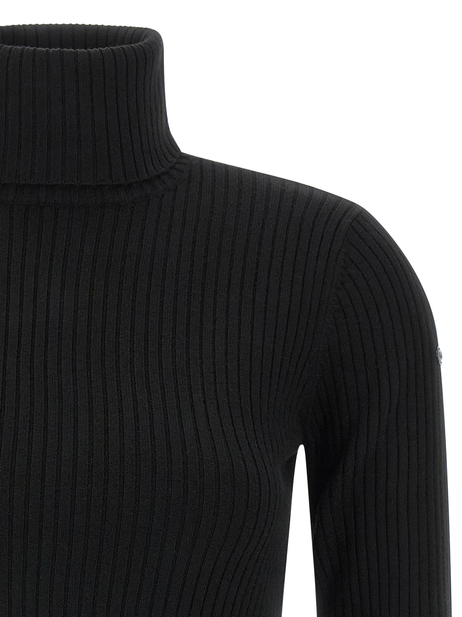 'Mira' turtleneck sweater in ribbed stretch merino wool blend with turned-up high neck, long sleeves with logo intarsia and tone-on-tone metal tag appliqué.
