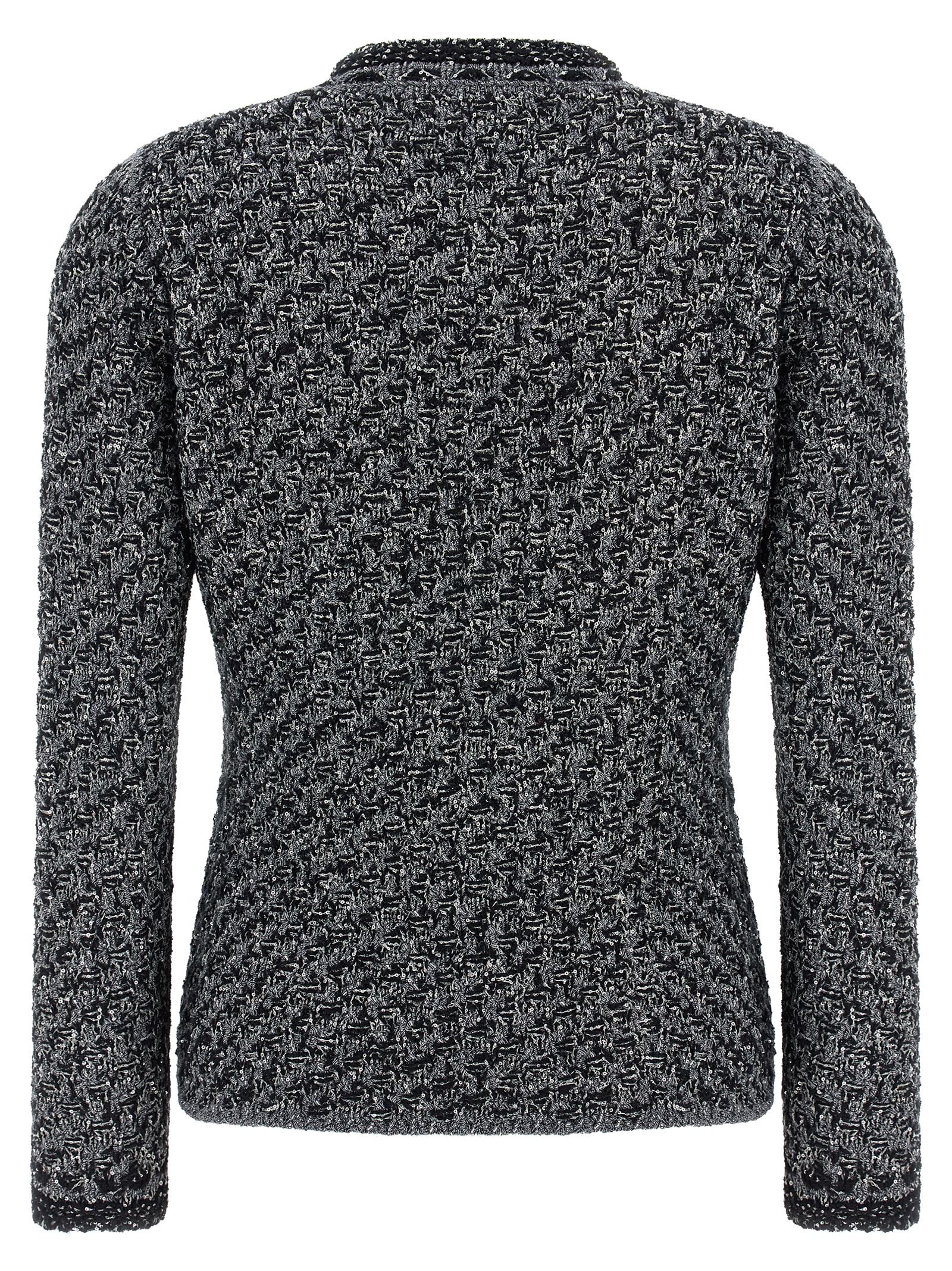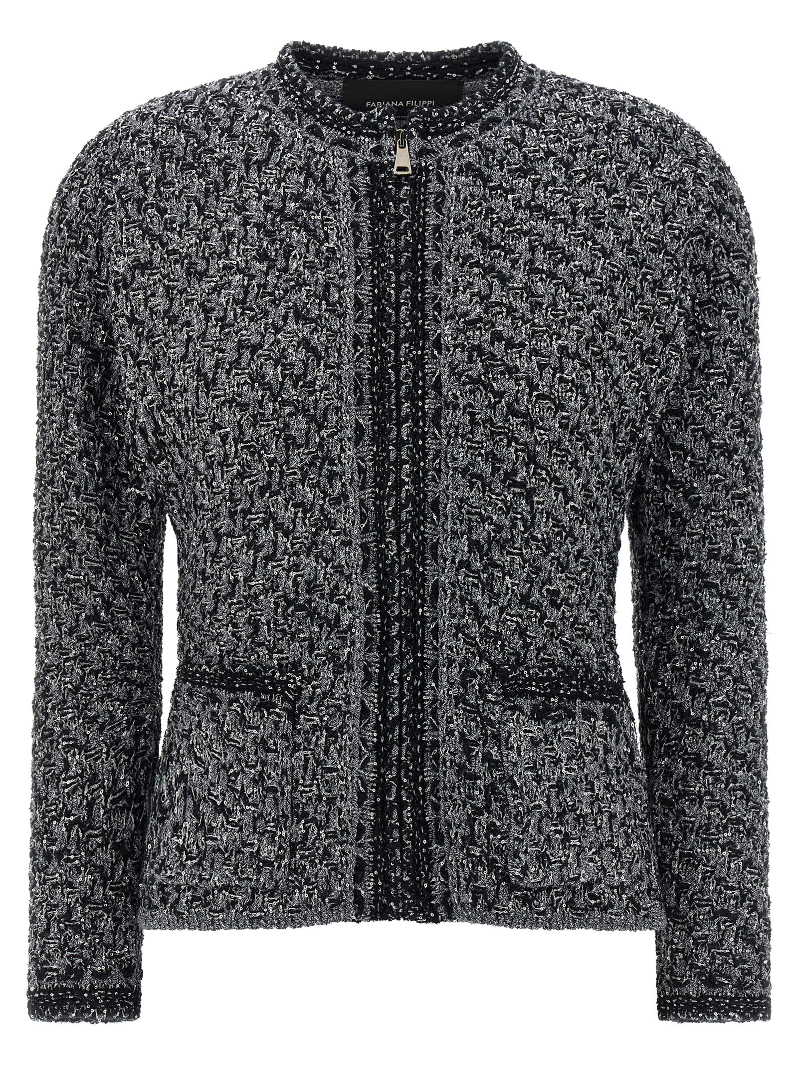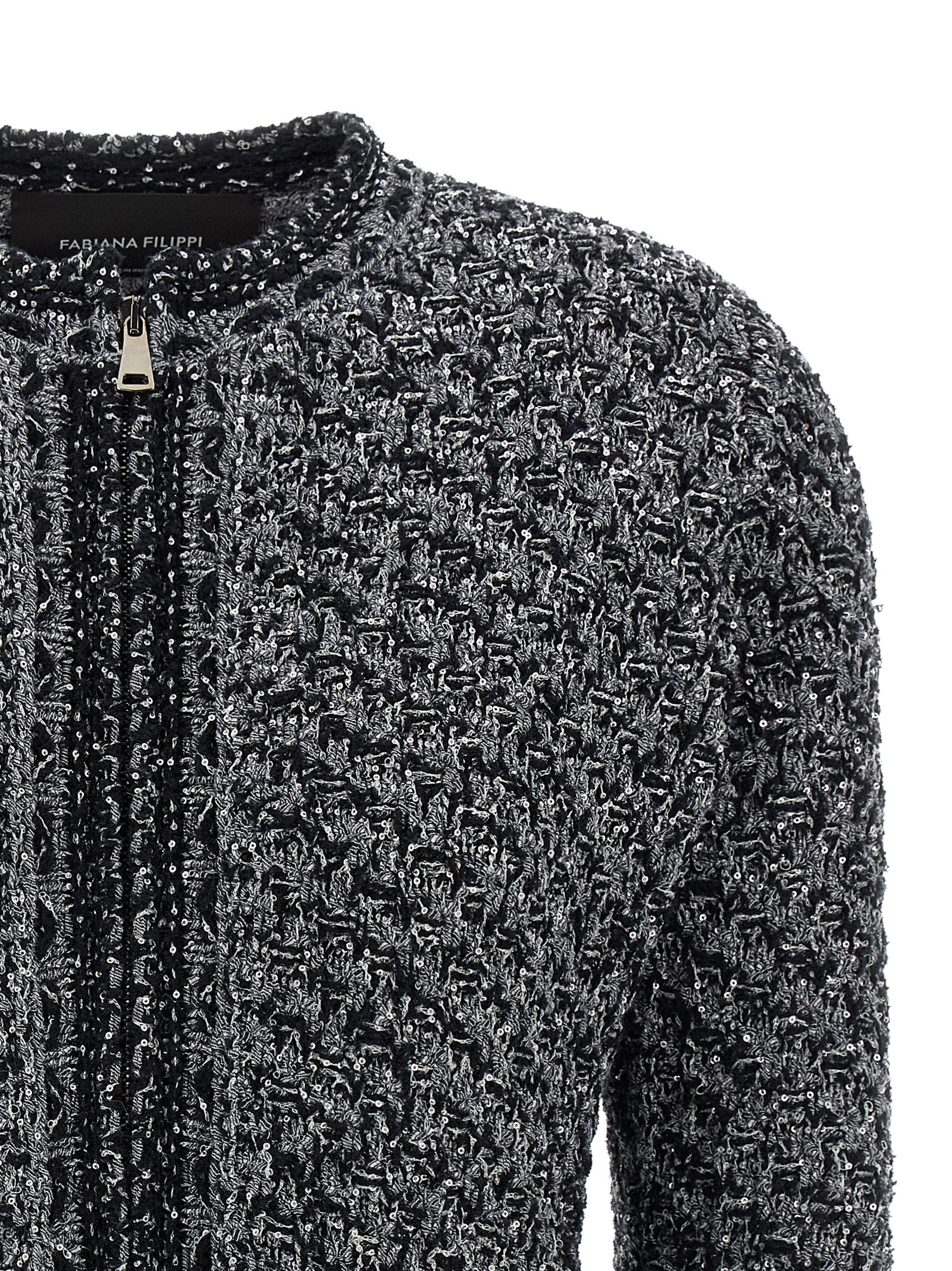 Micro sequin denim effect slightly stretch tweed jacket, crew neck, flared waist, front zip closure, front pocket pattern, and long sleeves.