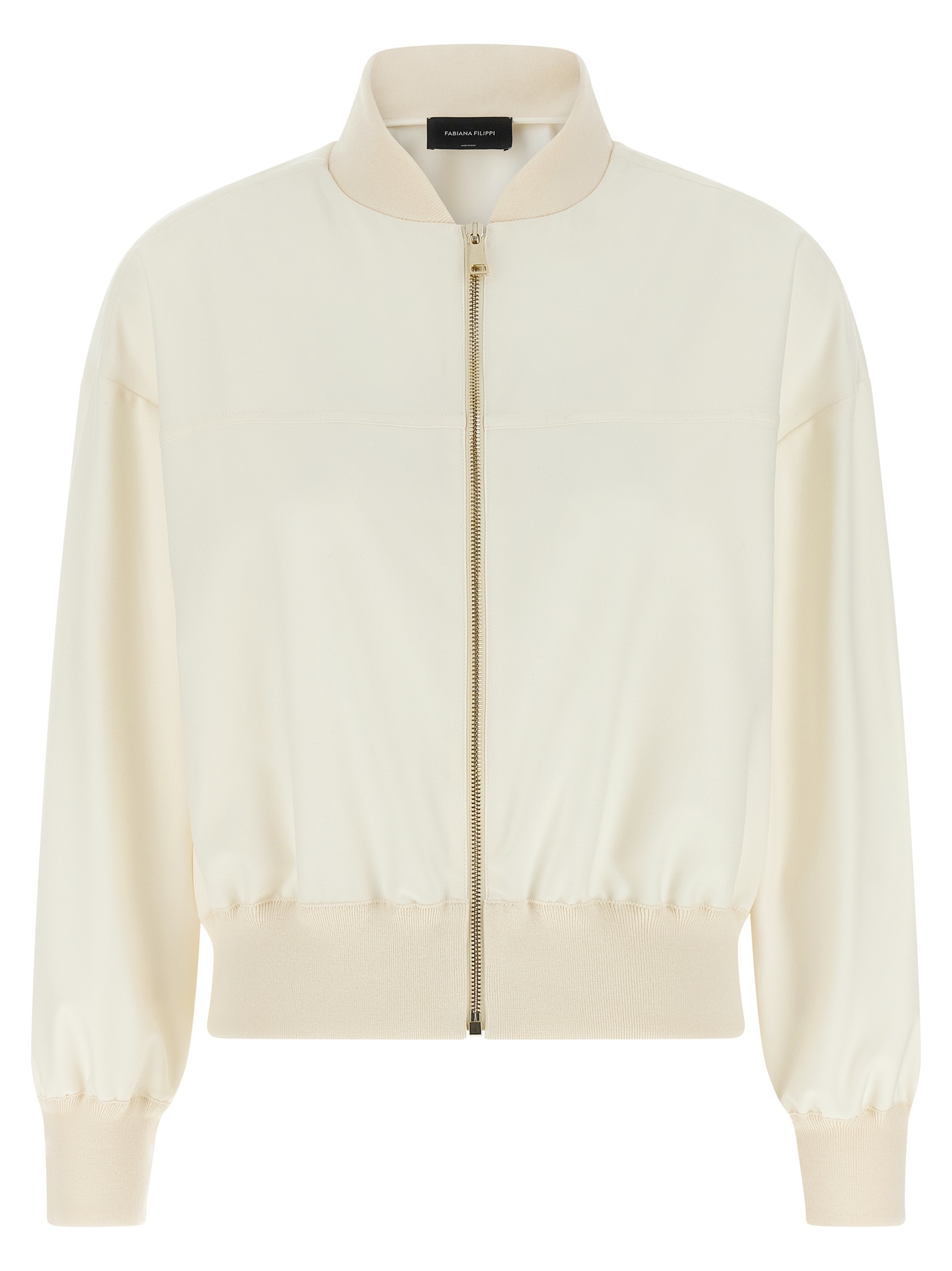 Bomber jacket in light fabric, lace insert with jewel detail at the back, ribbed elastic knit cuffs and bottom hem, and front zip closure.