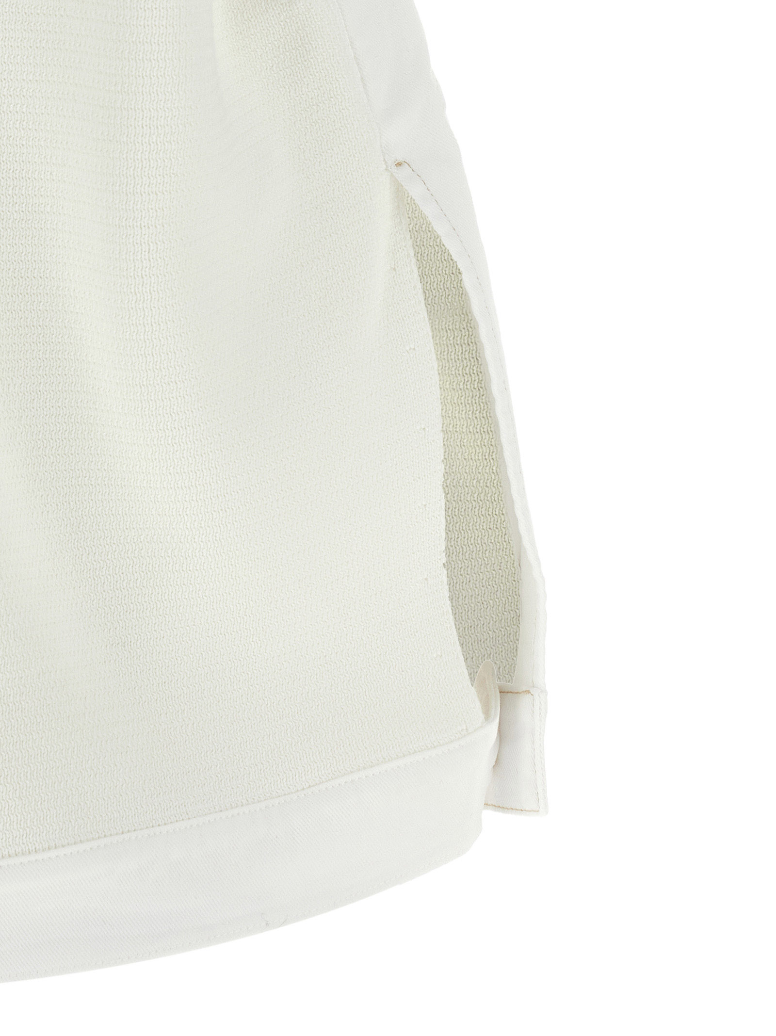 Cotton denim vest with knitted back panel, crew neck, front gold button closure, pockets, side slits with buttons.