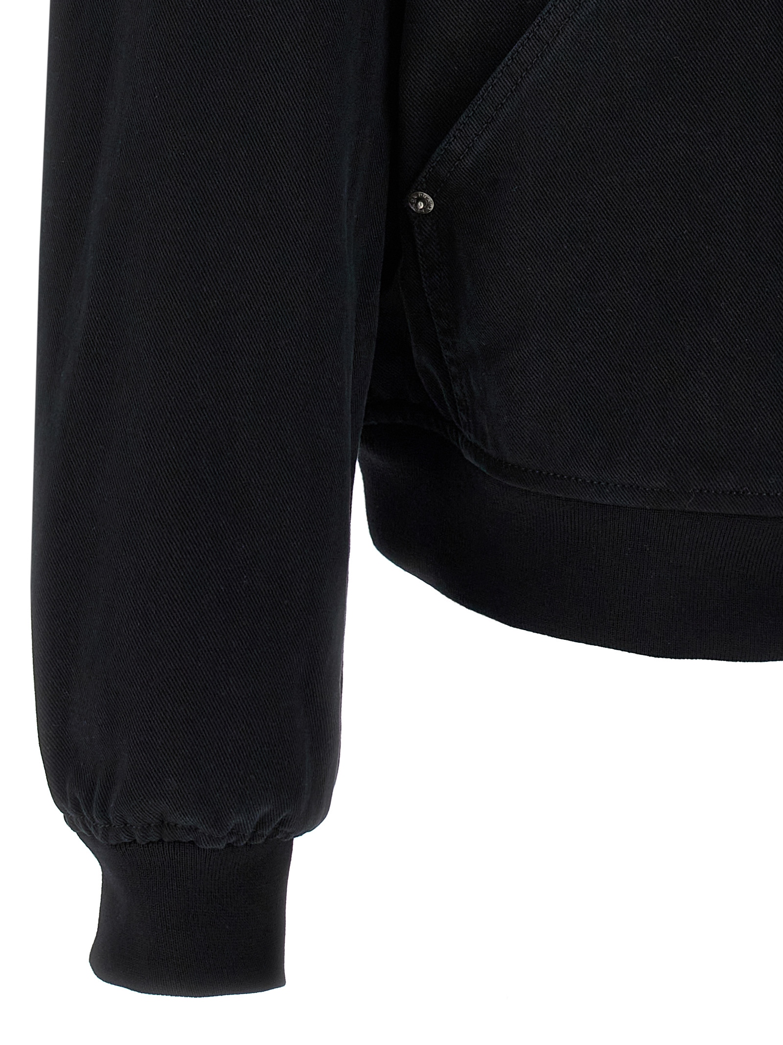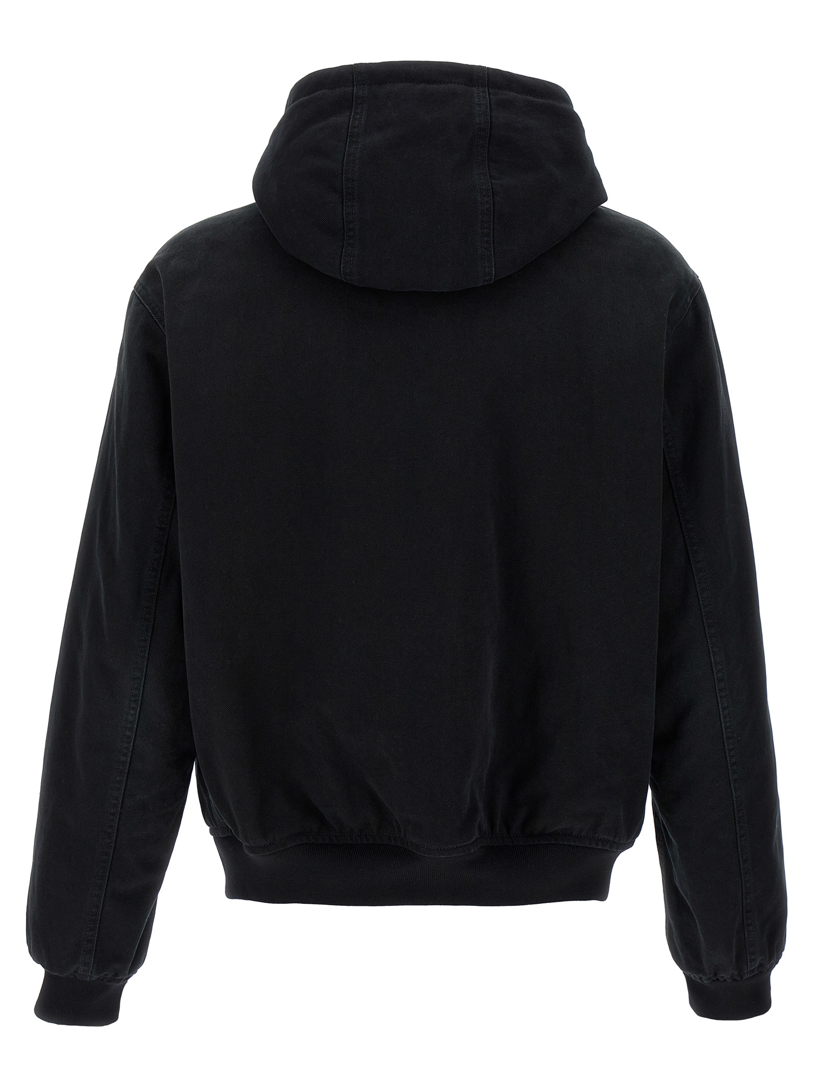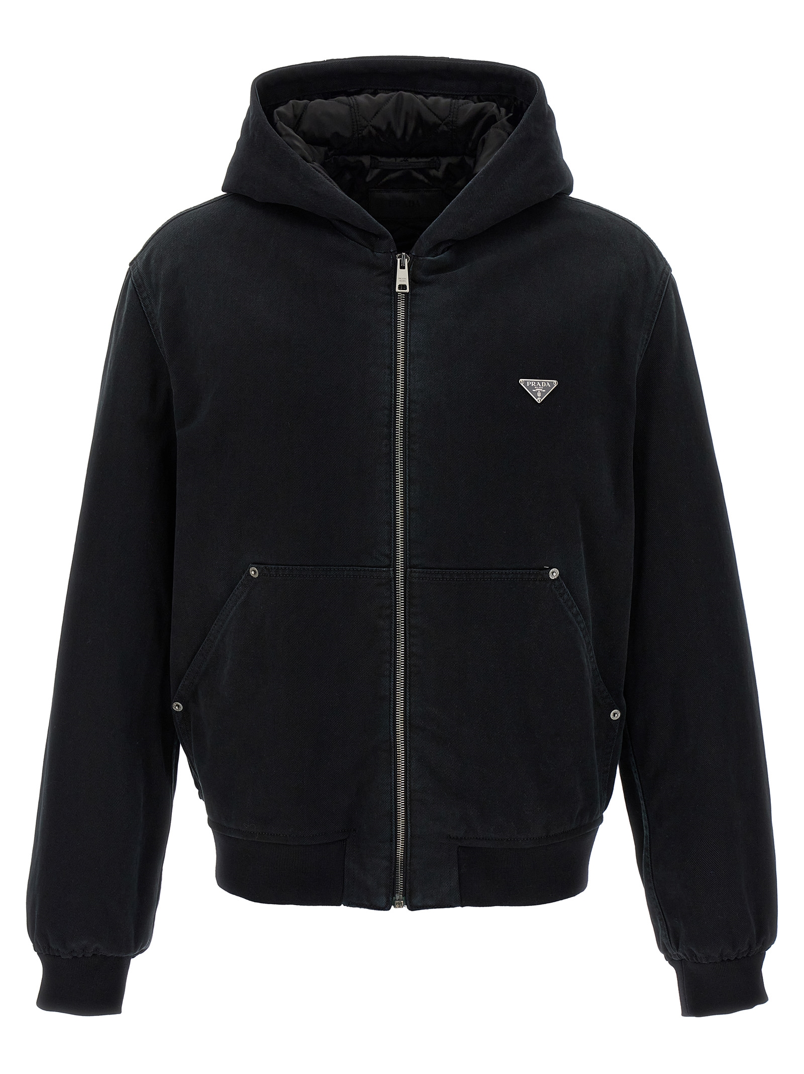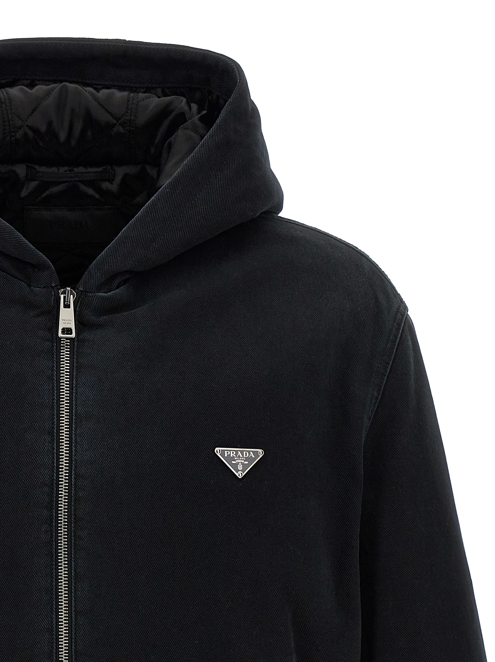 Padded washed cotton denim jacket, front enameled metal triangle logo, quilted viscose lining, hood with adjustable drawstring, front pockets with rivets, zip closure, long cuffed sleeves.
