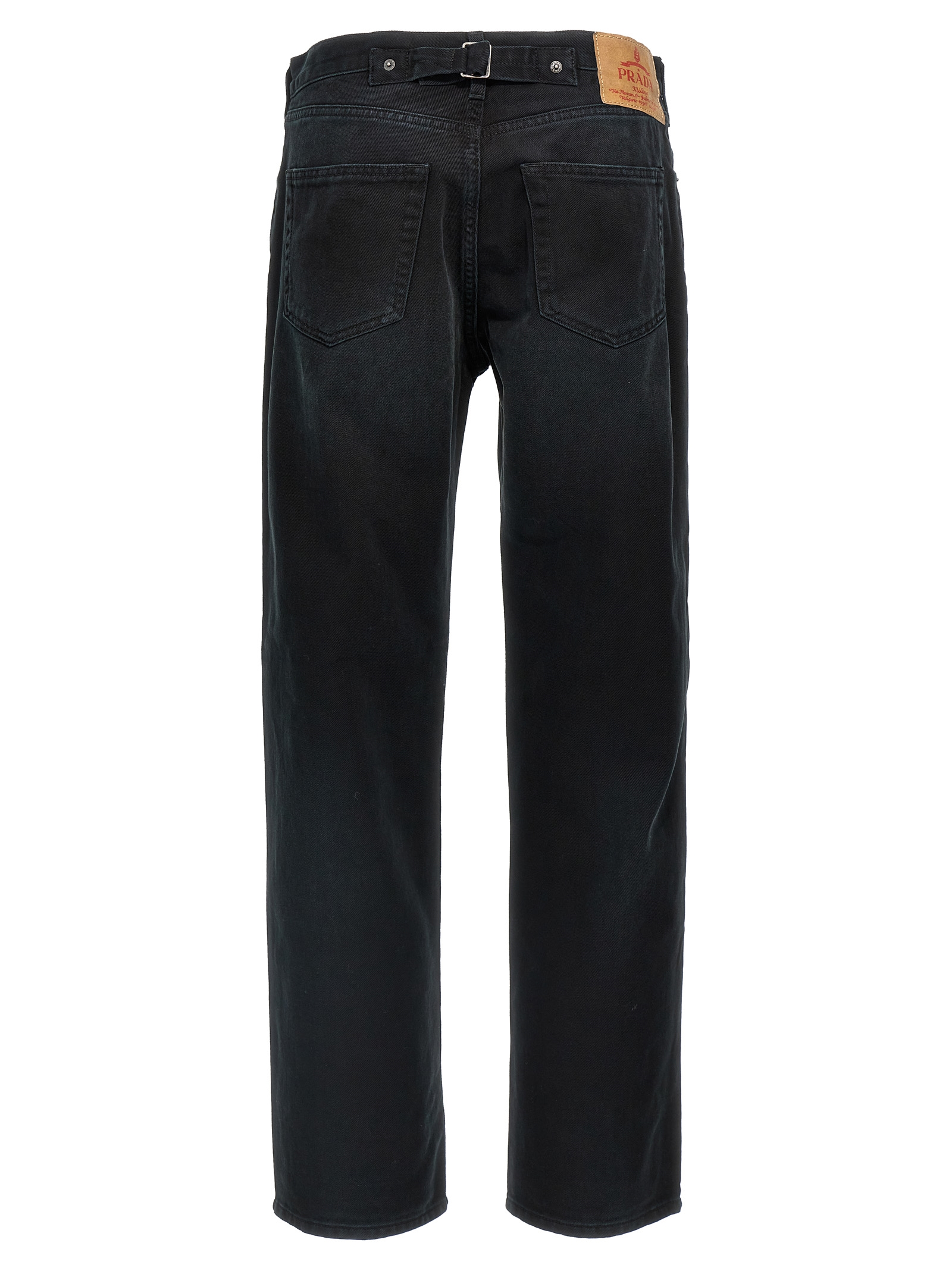 Garment-dyed cotton denim jeans, front enameled metal triangle logo, adjustable back strap, straight leg, button closure, five pockets, back logo tag.
