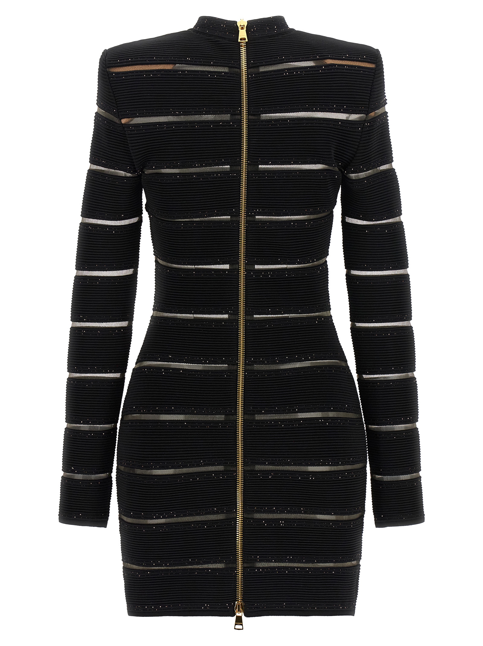 Bodycon mini dress in stretch viscose with transparent mesh inserts and micro sequin appliqué, crew neck, padded shoulders, long sleeves, and full-height zip closure at the back.