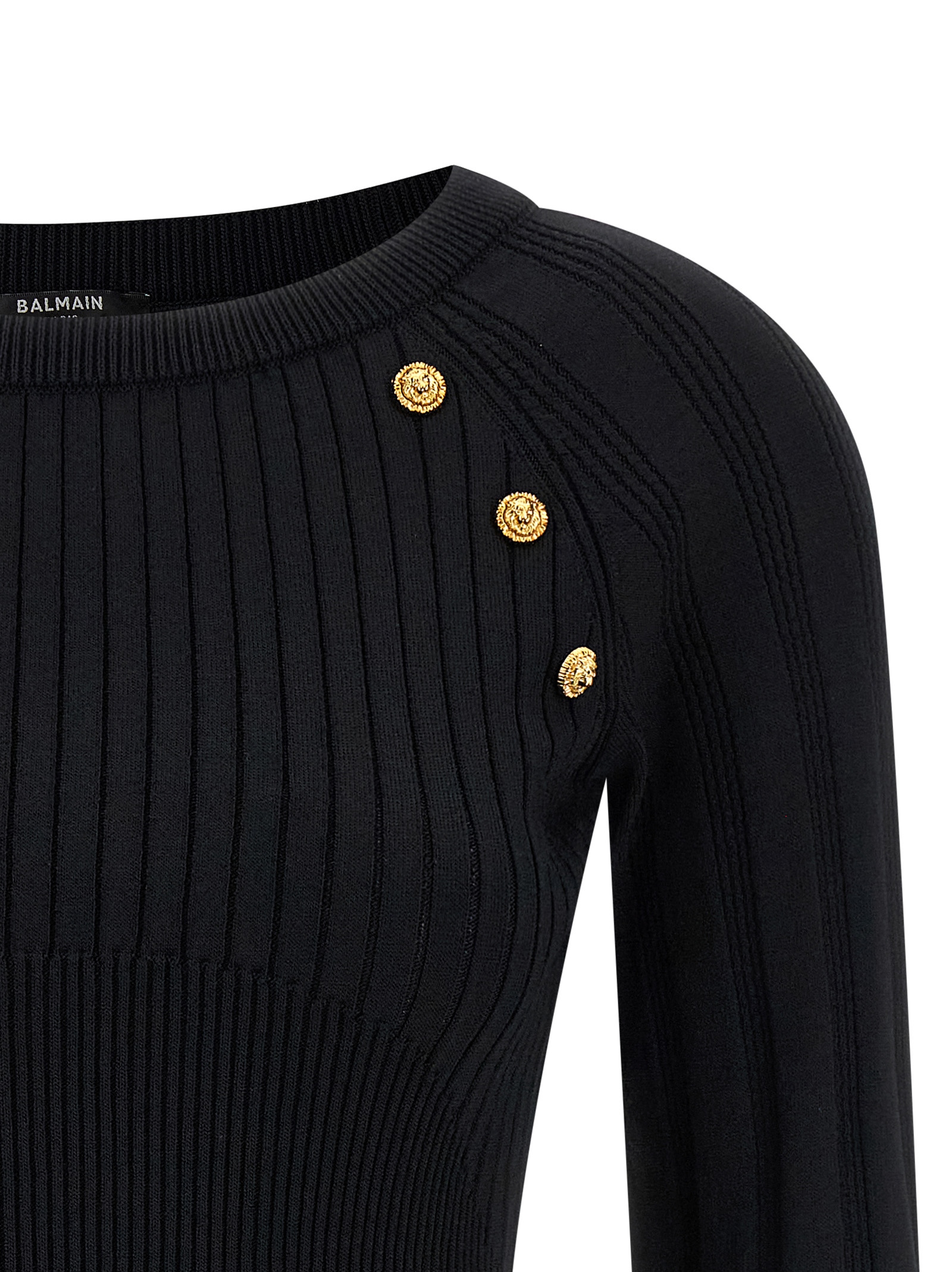 Stretch viscose sweater, crew neck, 3 symmetrical side 'Testa di leone' buttons, long sleeves.