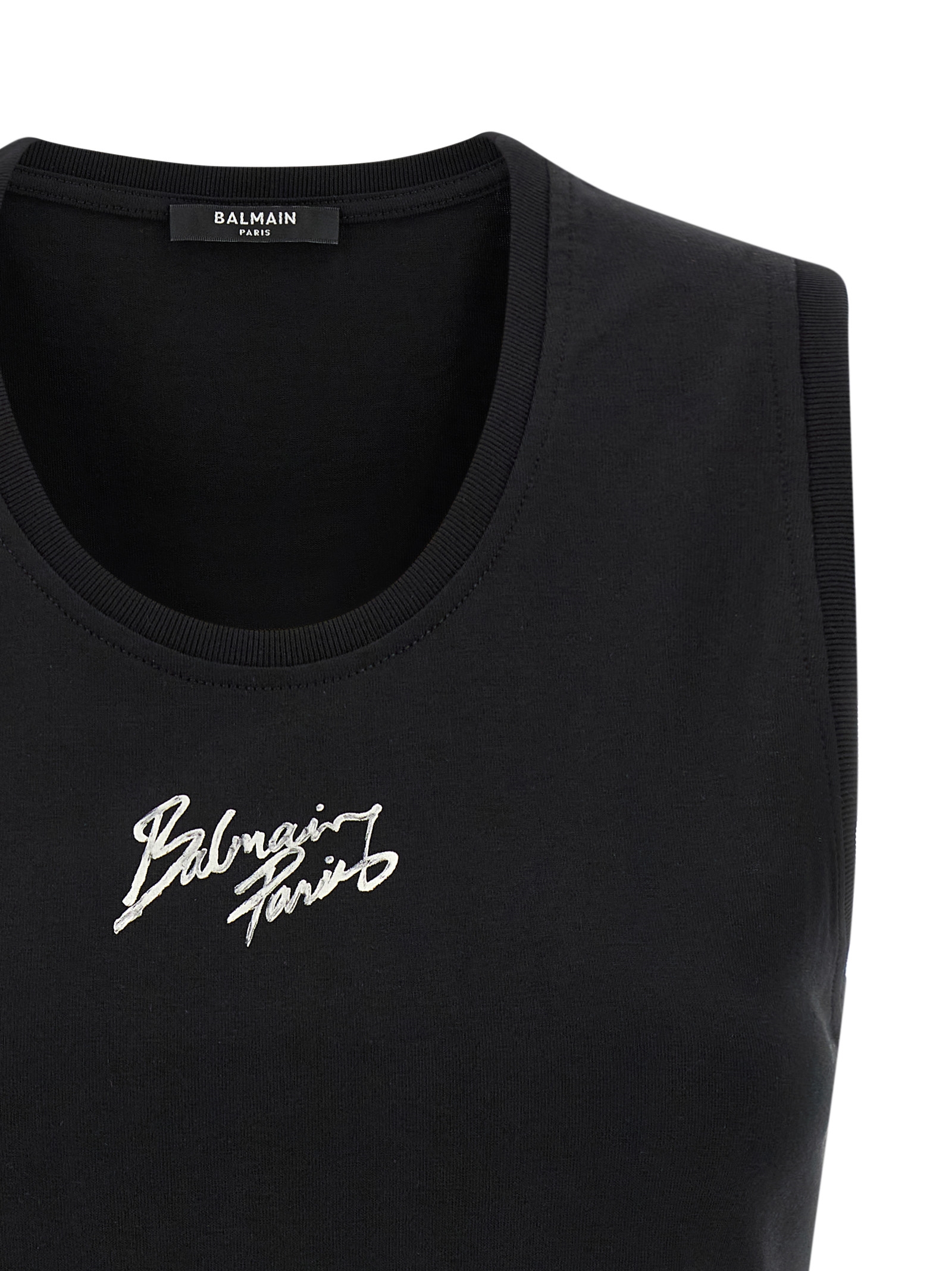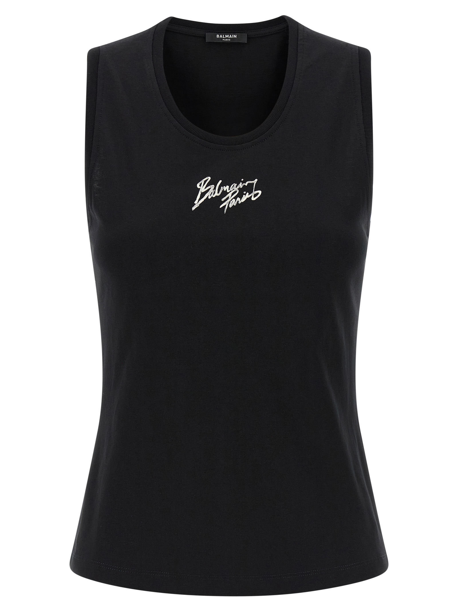 Cotton top with round neckline, front 'Balmain Paris' print, sleeveless.