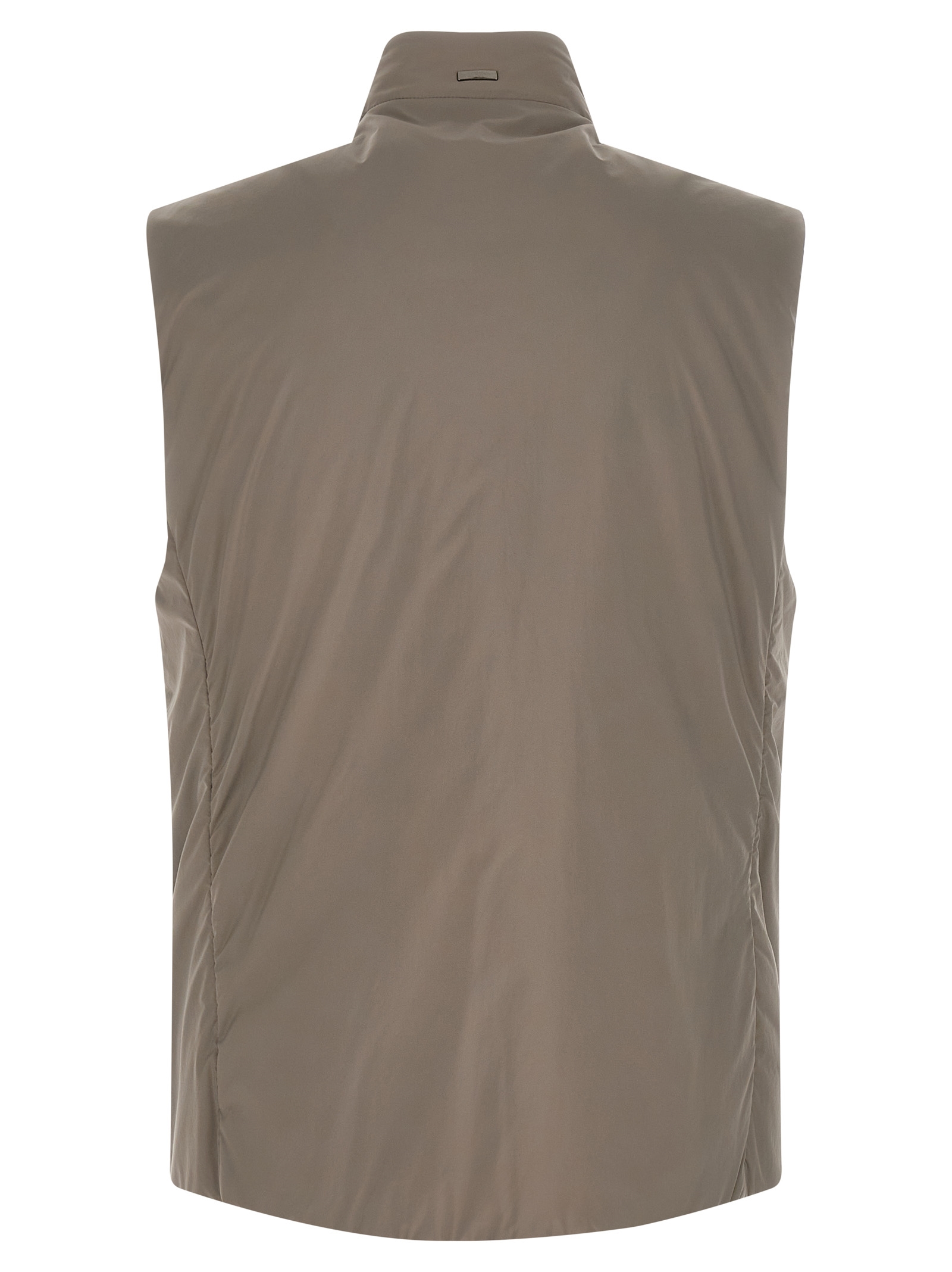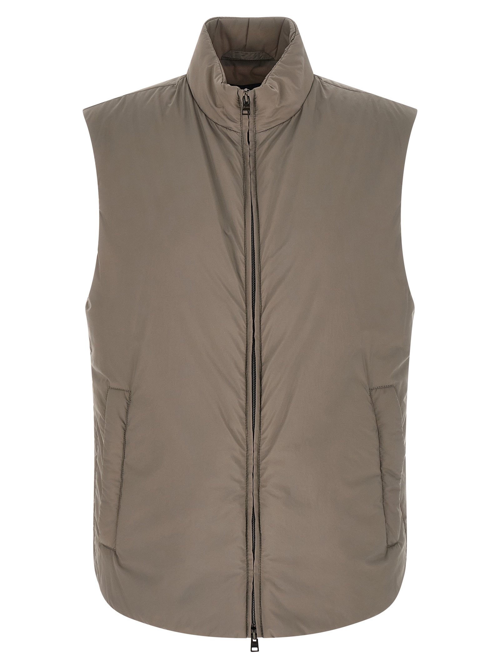 Lightly padded 'Ecoage' vest, high neck, front zip closure, pockets.