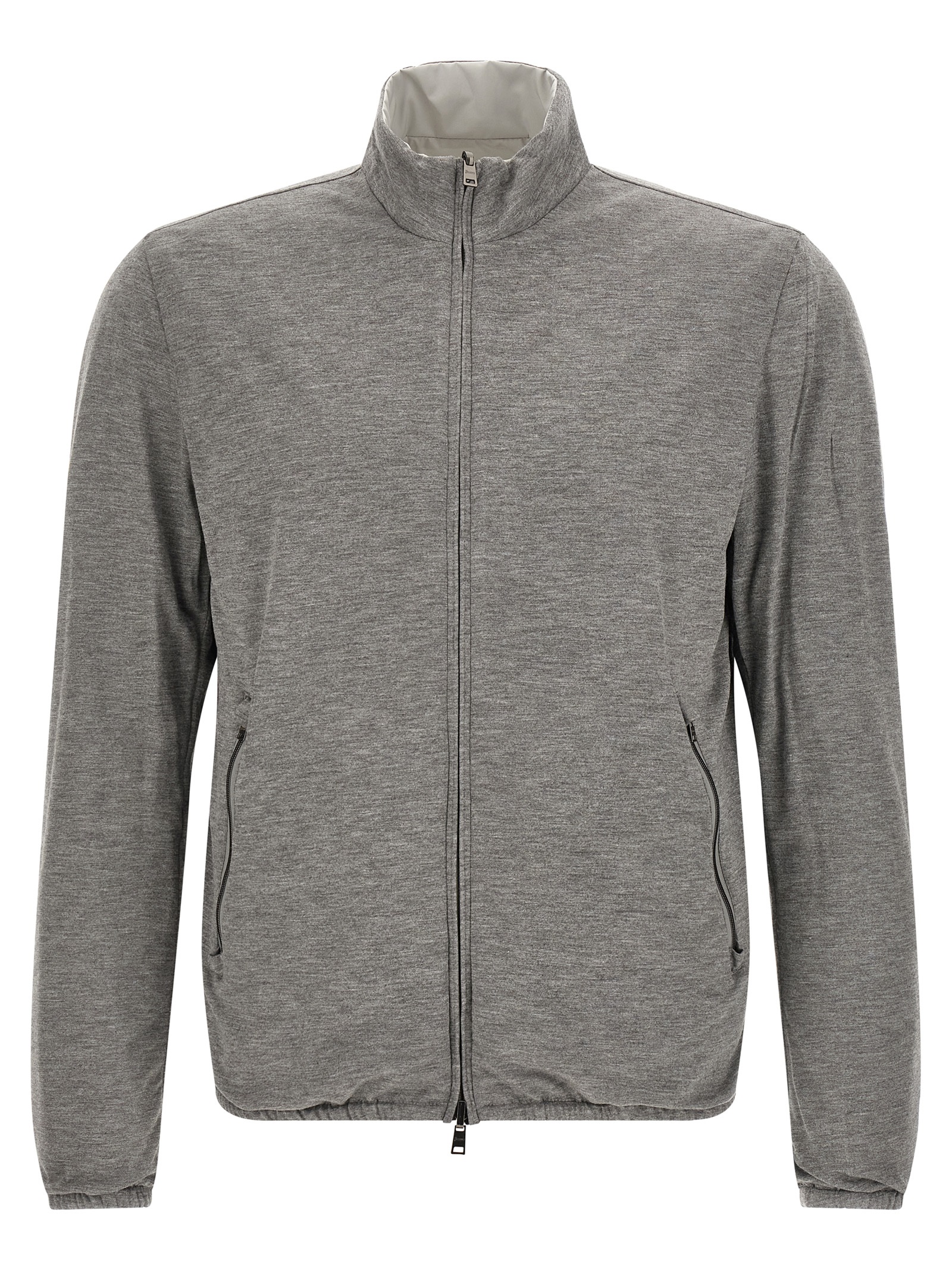 Reversible light bomber jacket in technical fabric and viscose mélange, high neck, front zip closure, pockets, long sleeves with elastic cuffs, elastic hem.