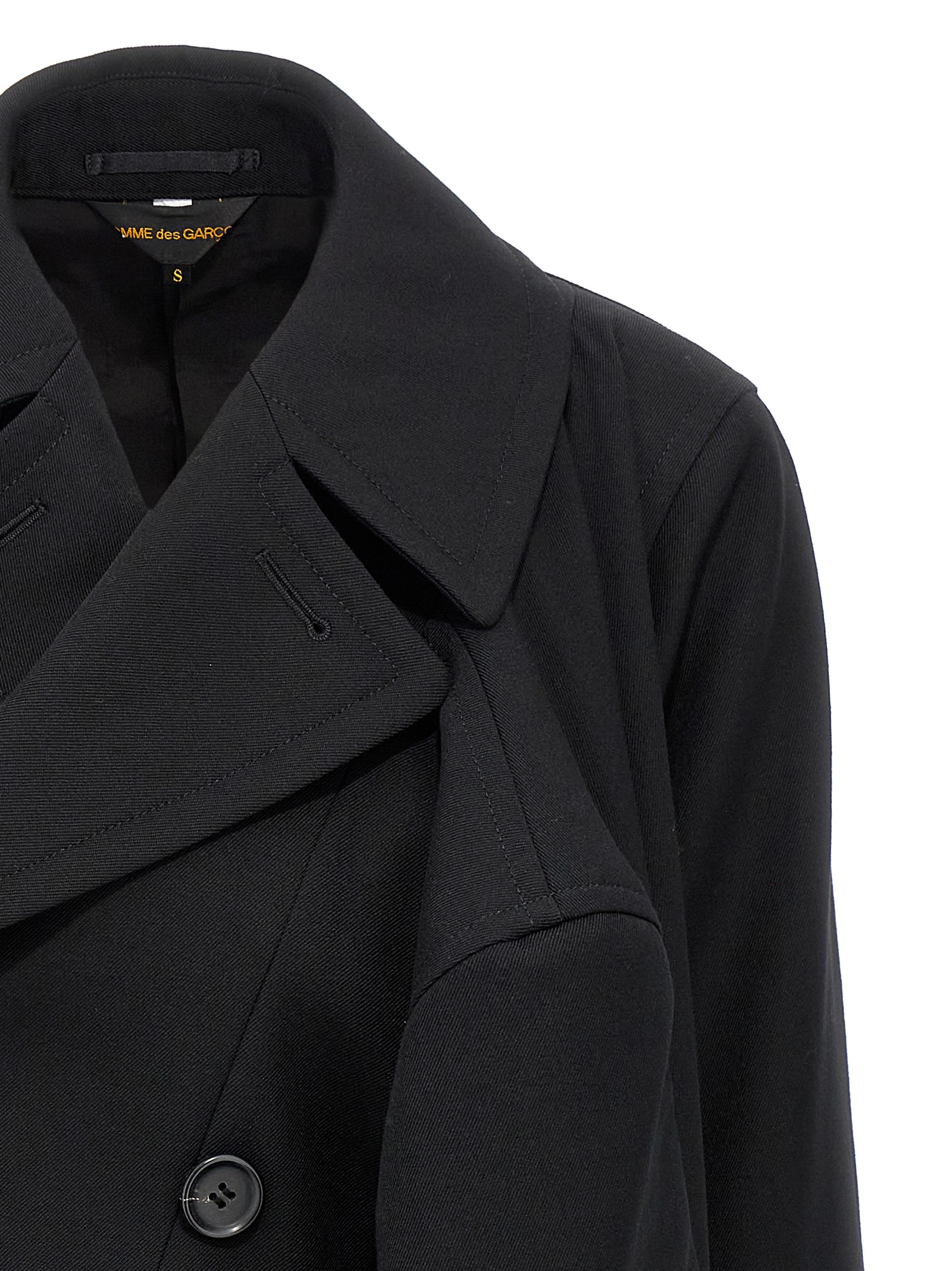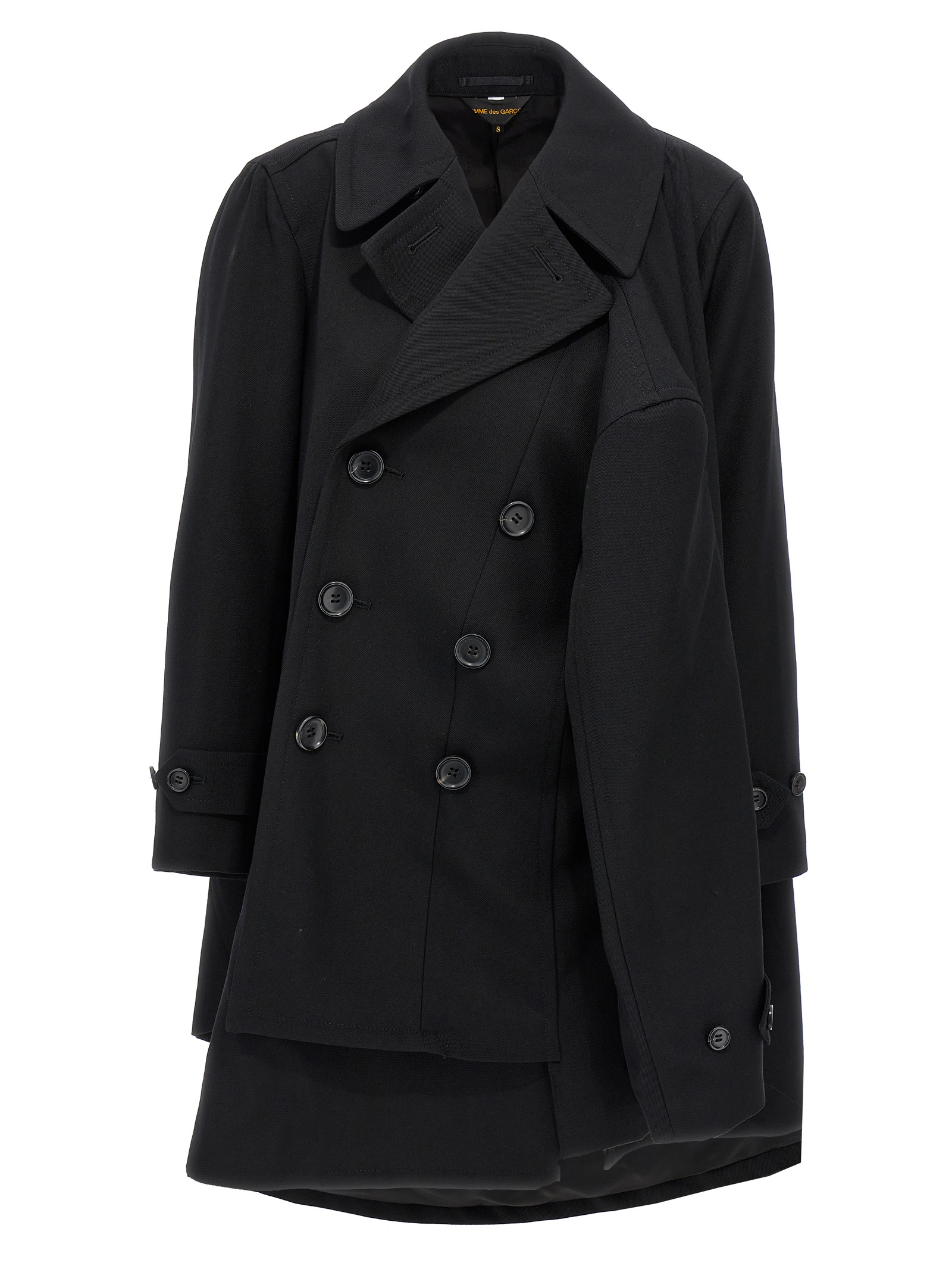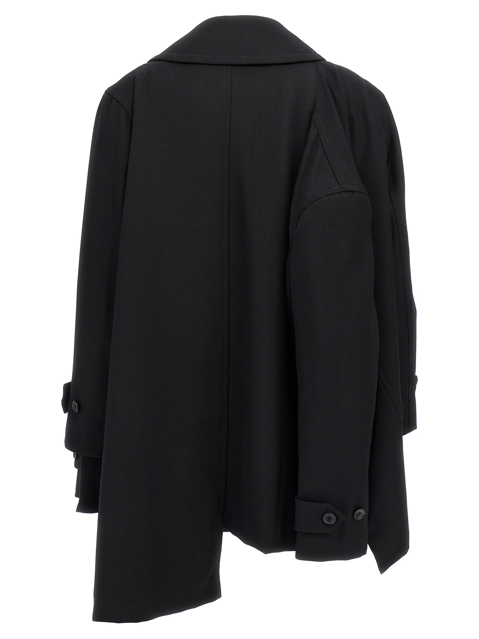 Double-breasted wool coat with button closure, 4 long sleeves, and asymmetric hem.