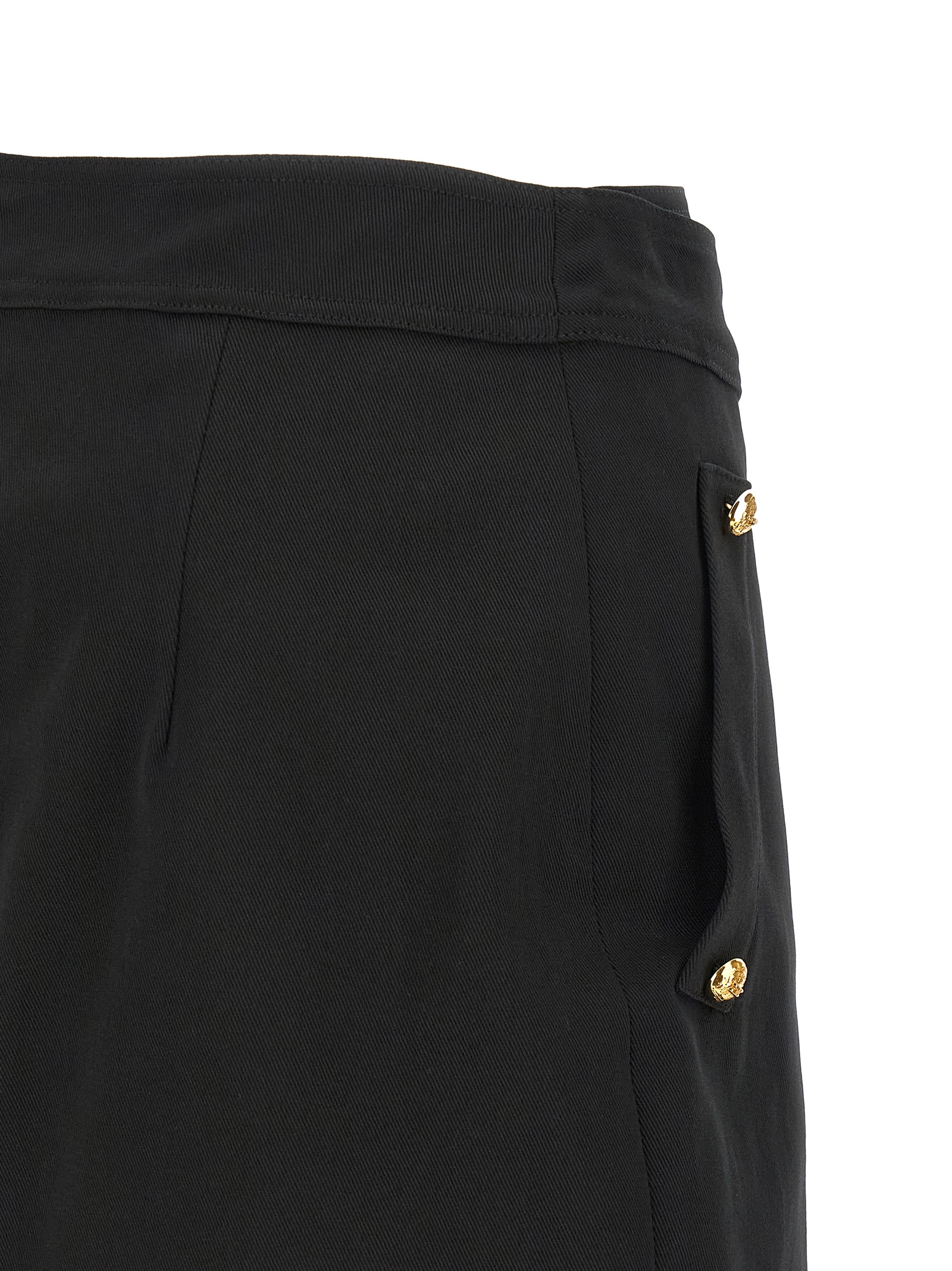 Cotton gabardine mini skirt, asymmetrical jewel button closure on the front, monogram satin lining.