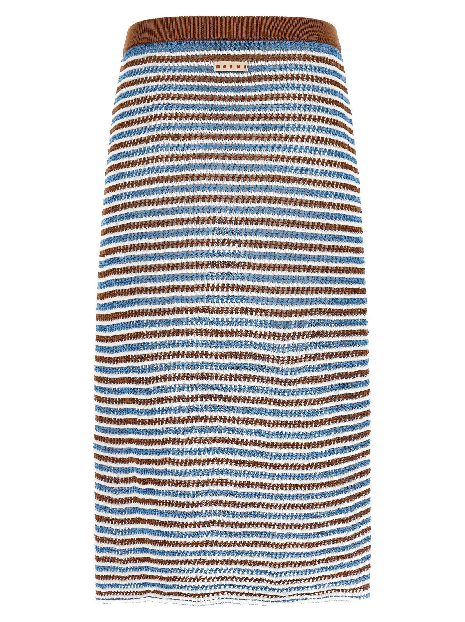 Midi skirt in openwork crochet yarn with horizontal stripe pattern, trapeze silhouette, back logo patch, elastic waistband.