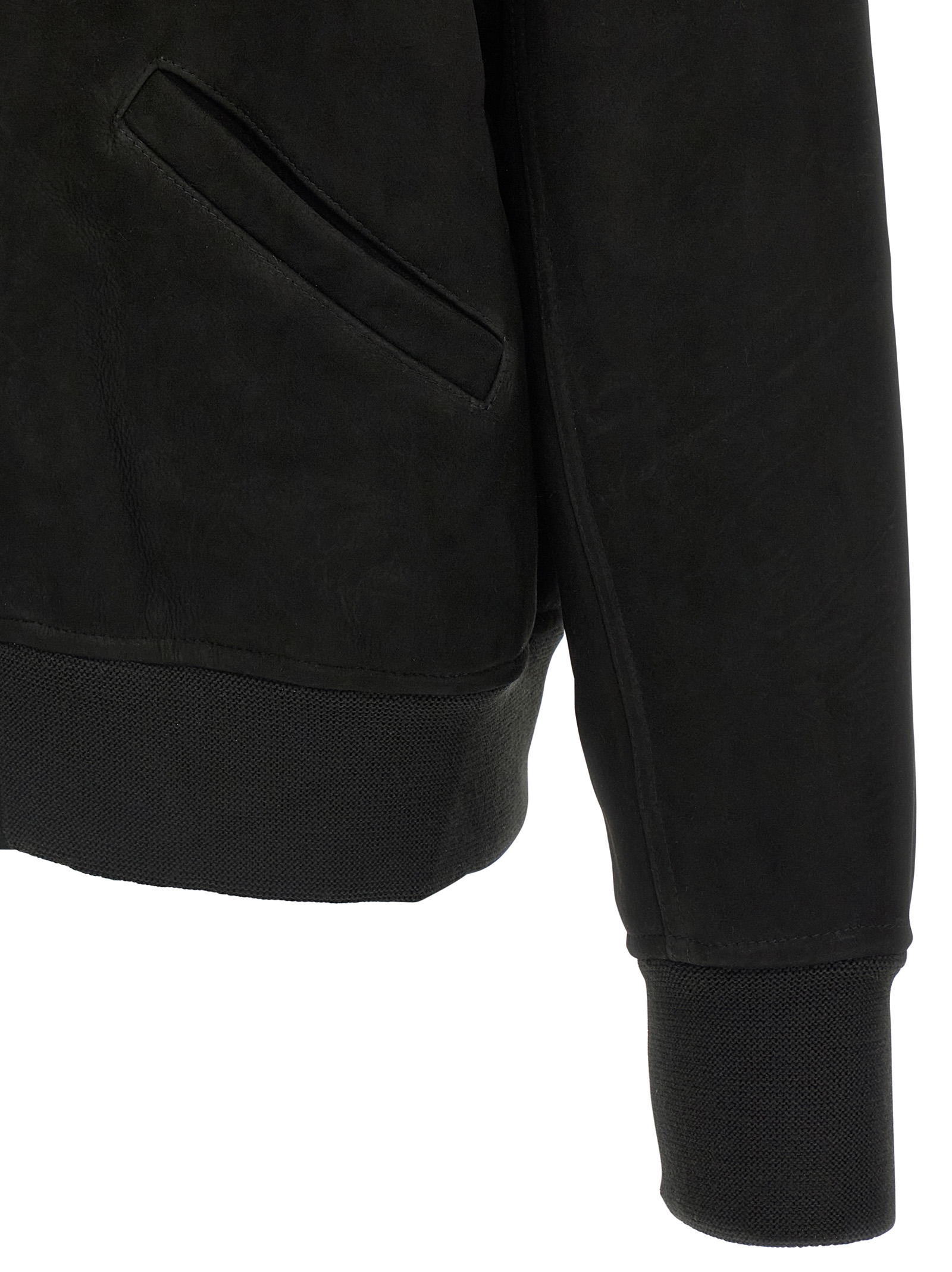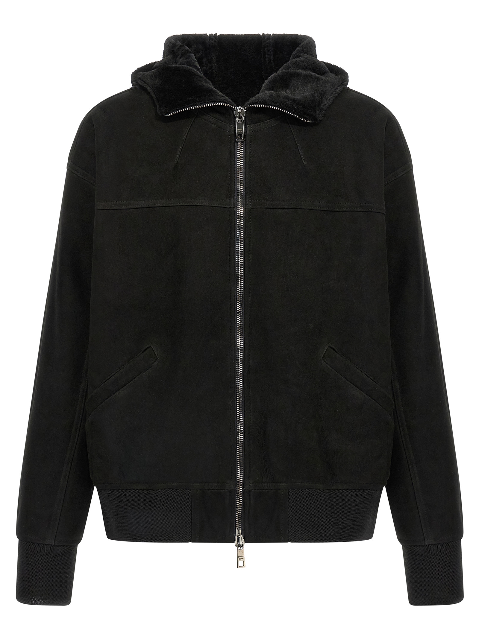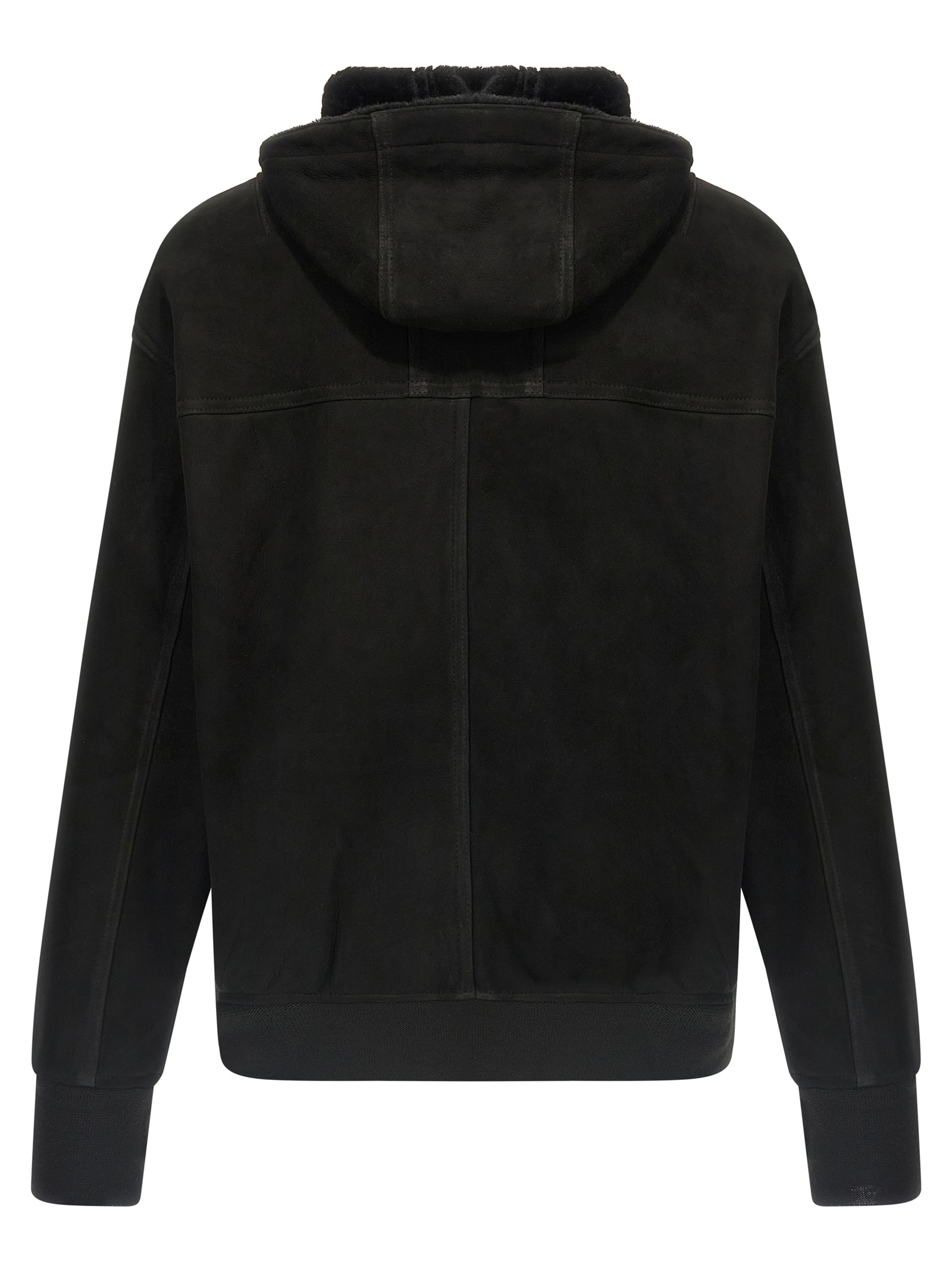 Sheepskin hooded jacket with piqué knit details, front zip closure, pockets, long cuffed sleeves.