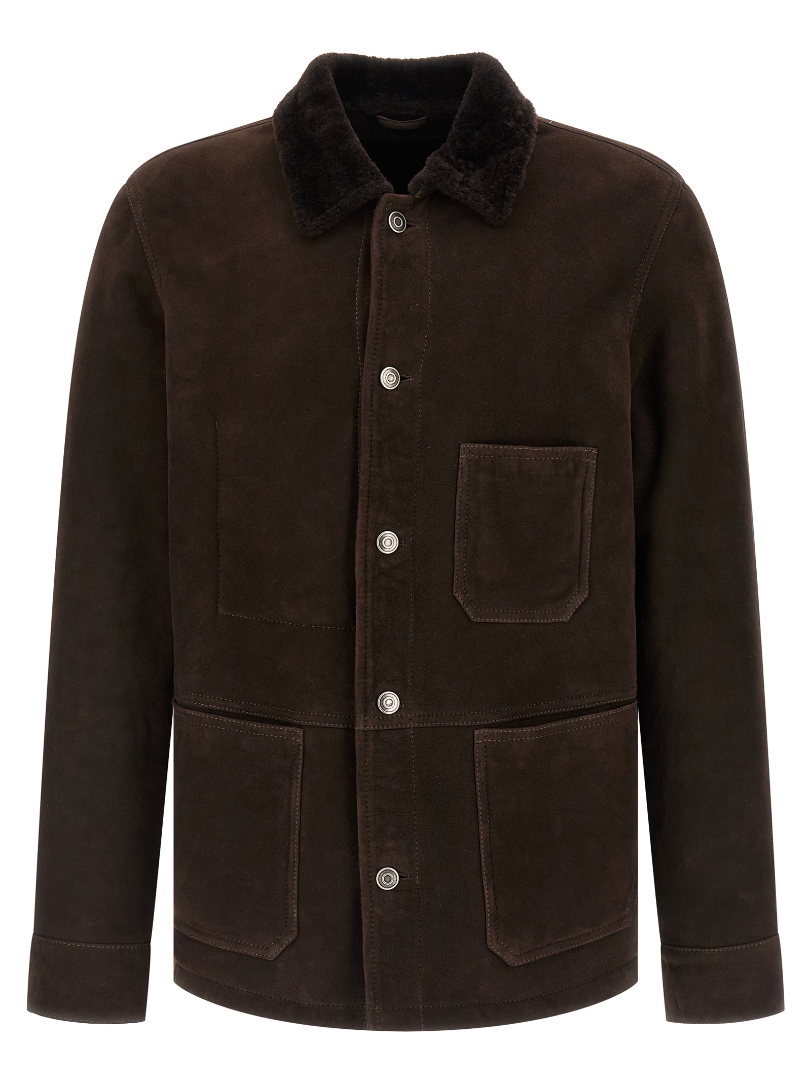 Suede sheepskin jacket with Sherling lining, collar, front button closure, pockets, long sleeves.