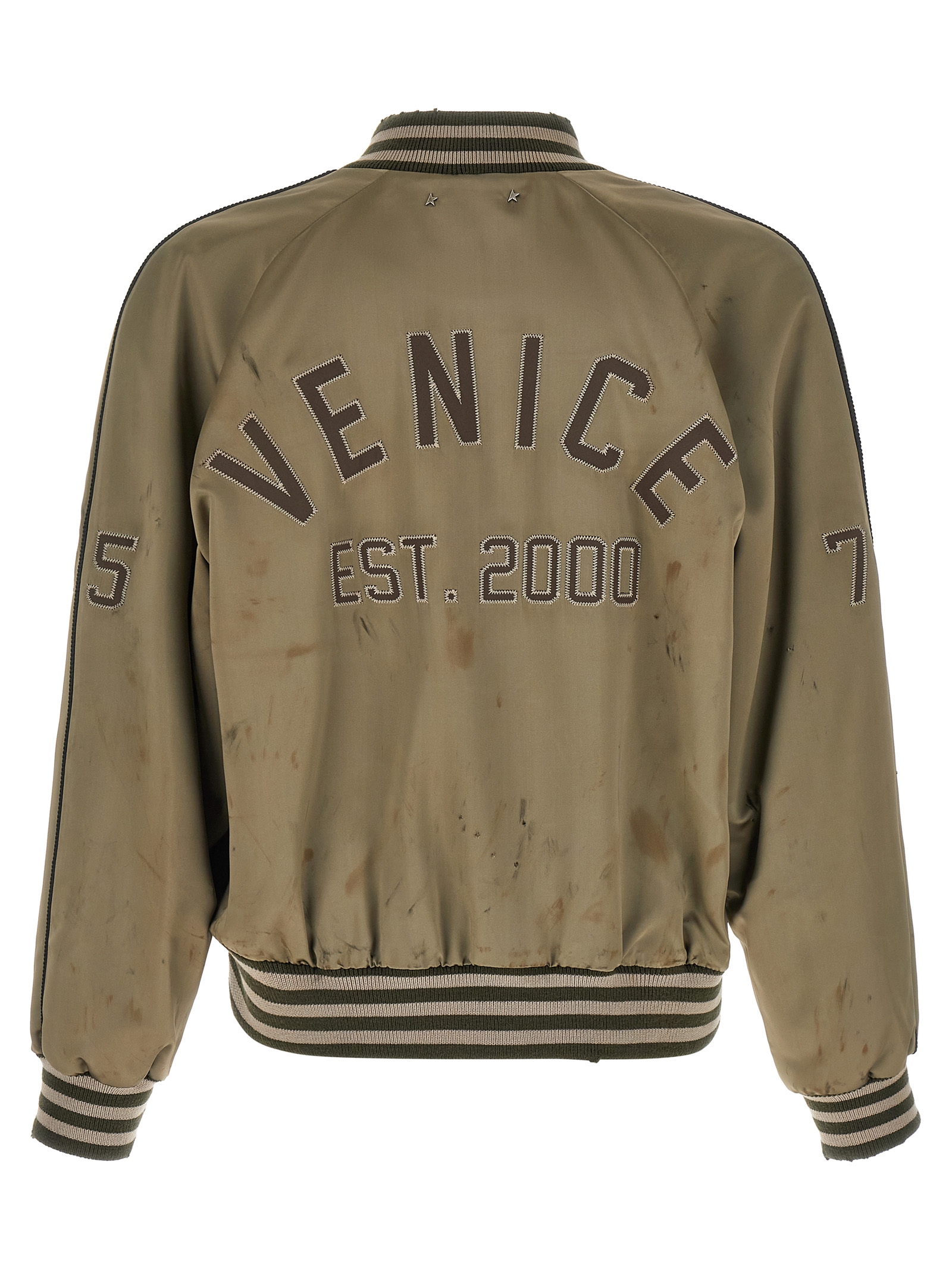 Journey' lived-in effect satin bomber jacket with striped pattern stretch wool knit details, patch on sleeves and back, front snap button closure, pockets, long raglan sleeves with cuffs, headband, lining.Характеристики товара