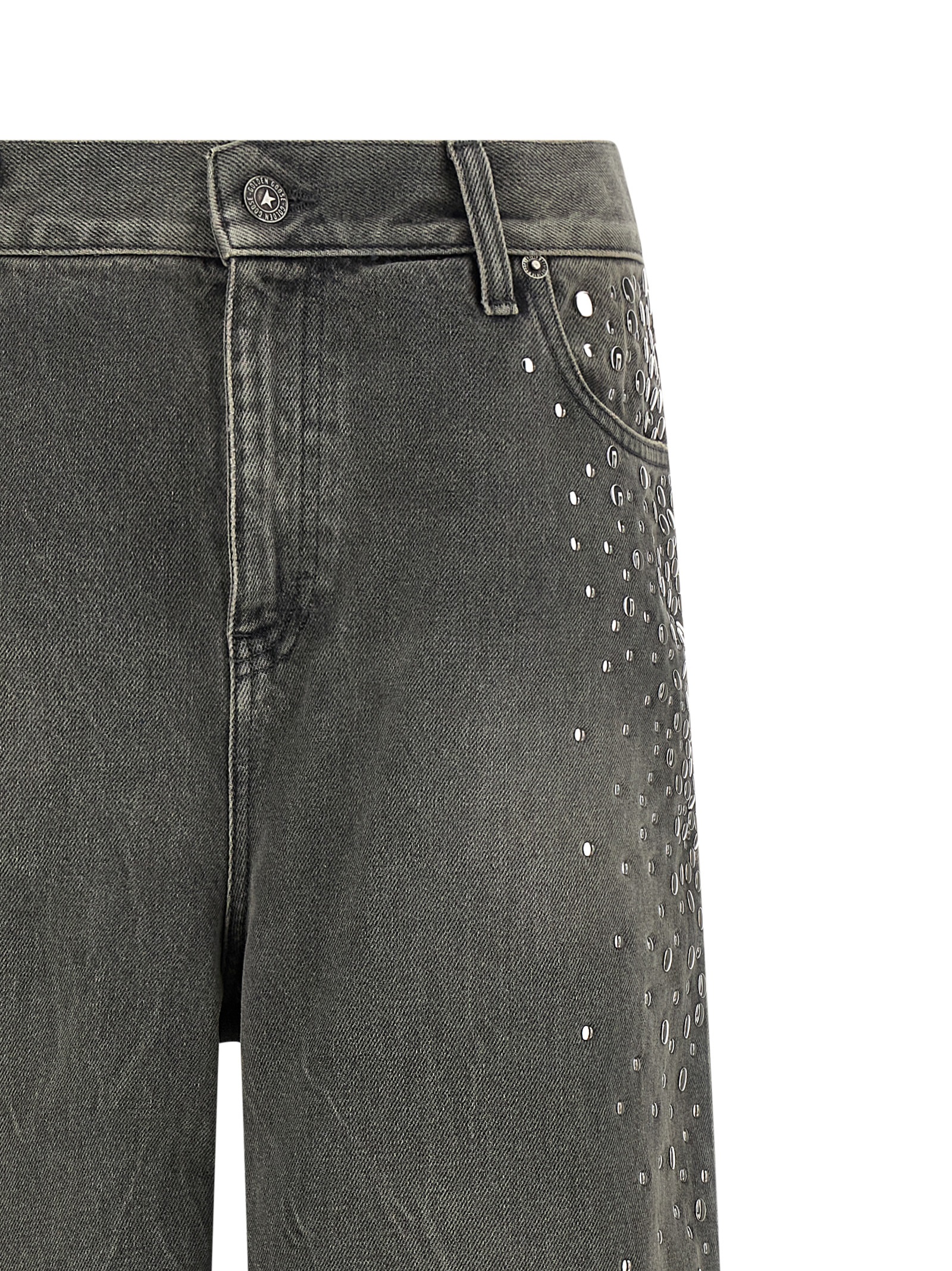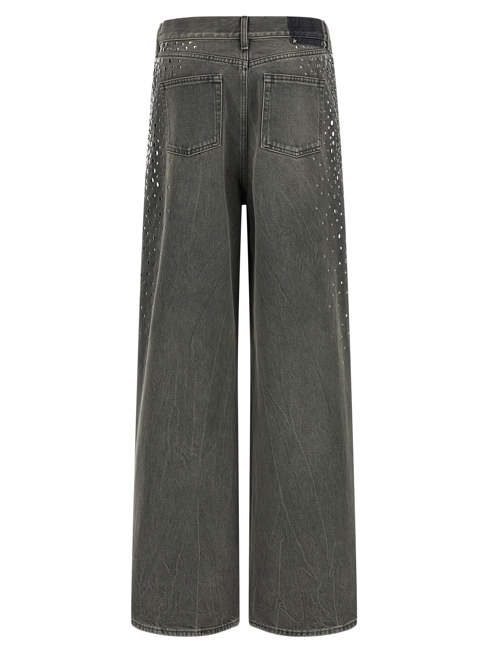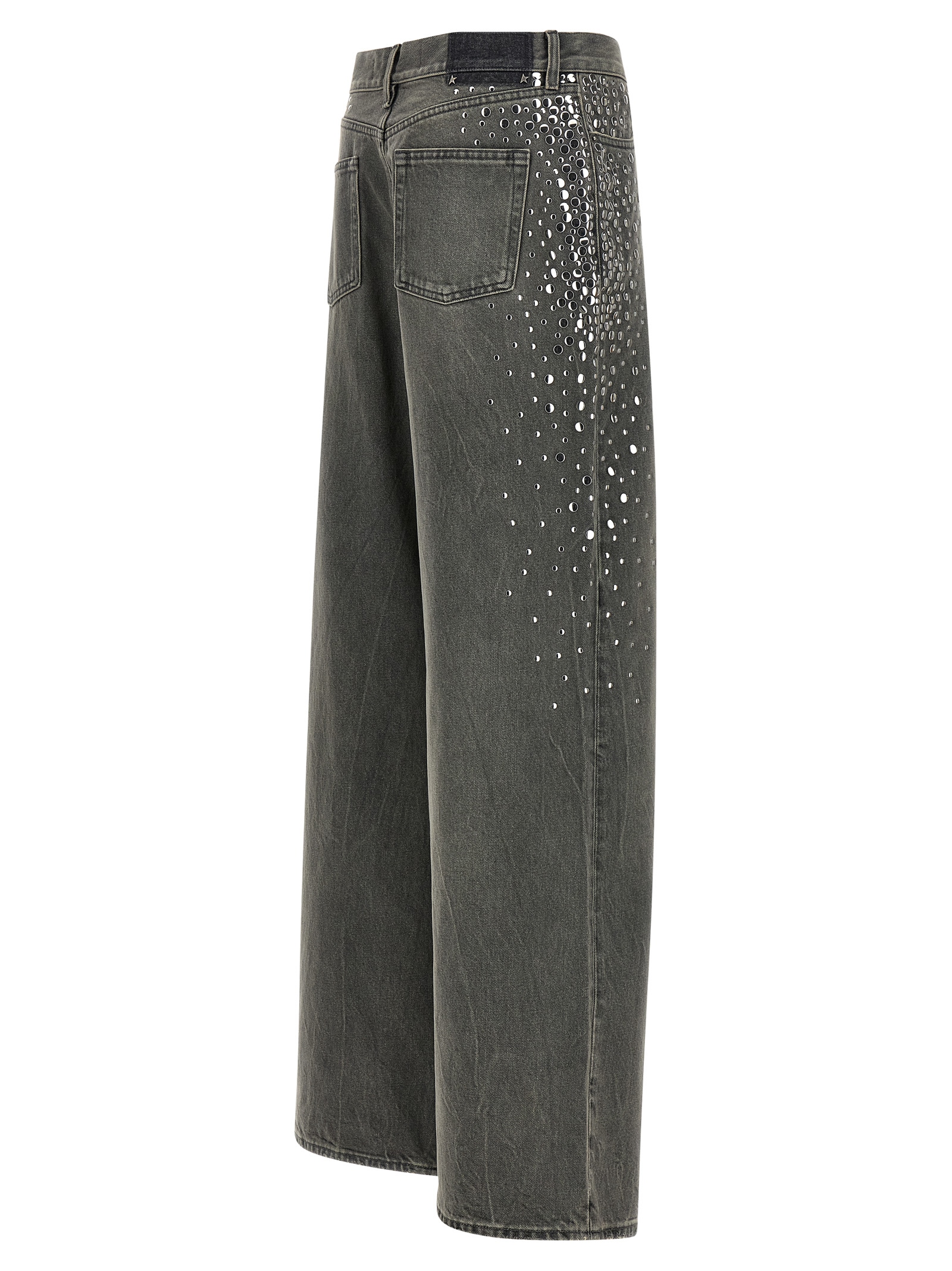 'Journey' Iron Wash cotton denim jeans with dégradé metal stud application, wide and straight leg, medium waist, zip and front button closure, five pockets.