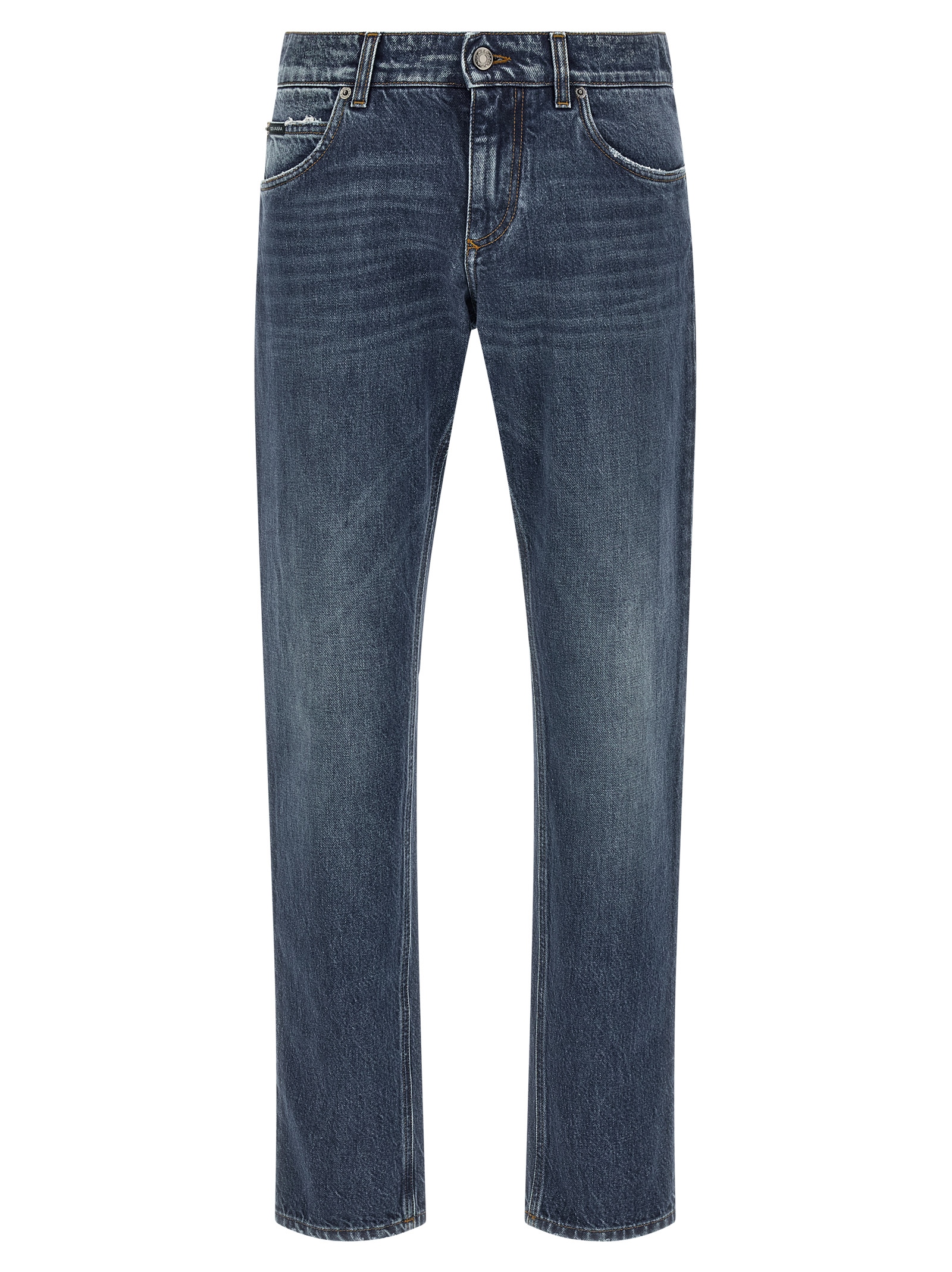 Used-effect stone washed cotton denim jeans, contrast stitching, front zip and button closure, five pockets, leather logo tag and galvanic tag with engraved logo on the back.