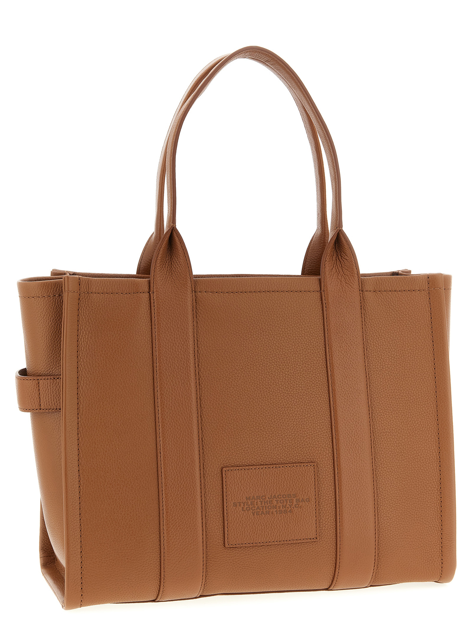 'The Leather Large Tote' full-grain leather shopping bag with front embossed logo, tone-on-tone logo patch at the back, double fixed handle, top zip closure.