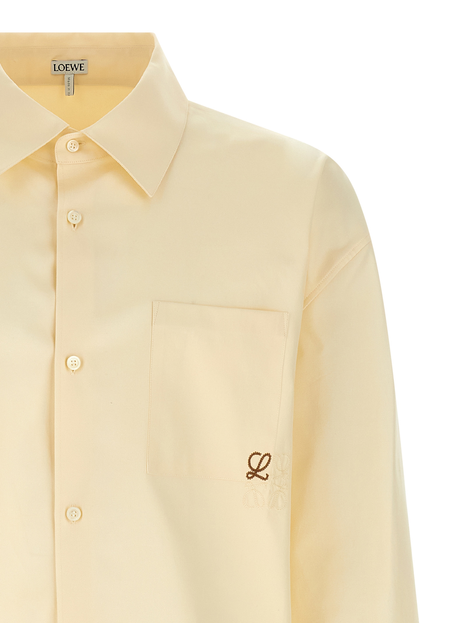 Medium weight cotton twill shirt, pocket with two-tone 'Anagram' embroidery, front button closure, long sleeves with cuffs and dropped shoulders.