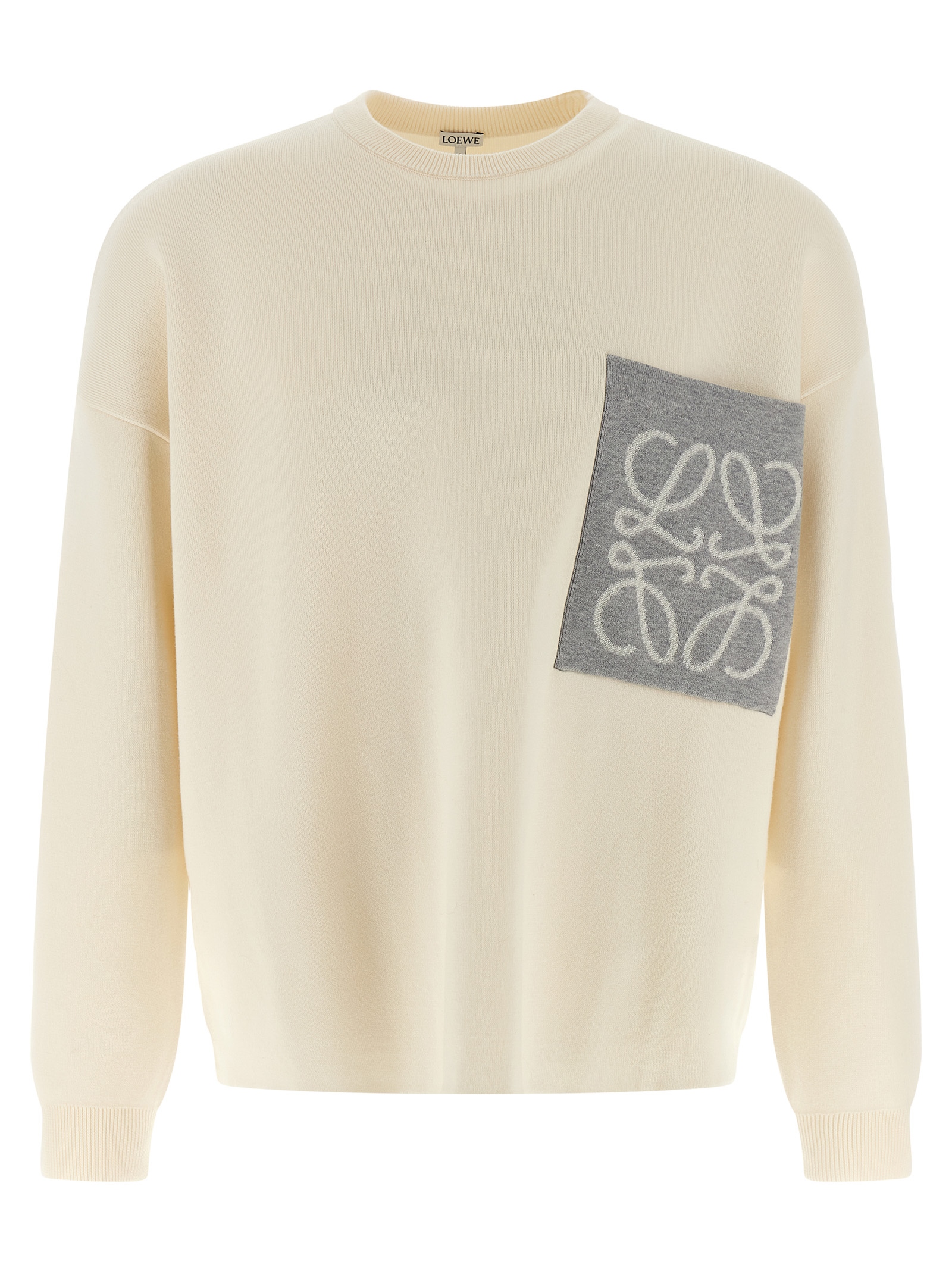 Double-sided knit medium weight cotton blend sweater, contrasting Anagram inlay pocket, round neckline, long sleeves with cuffs and dropped shoulders, and raw cut hem.
