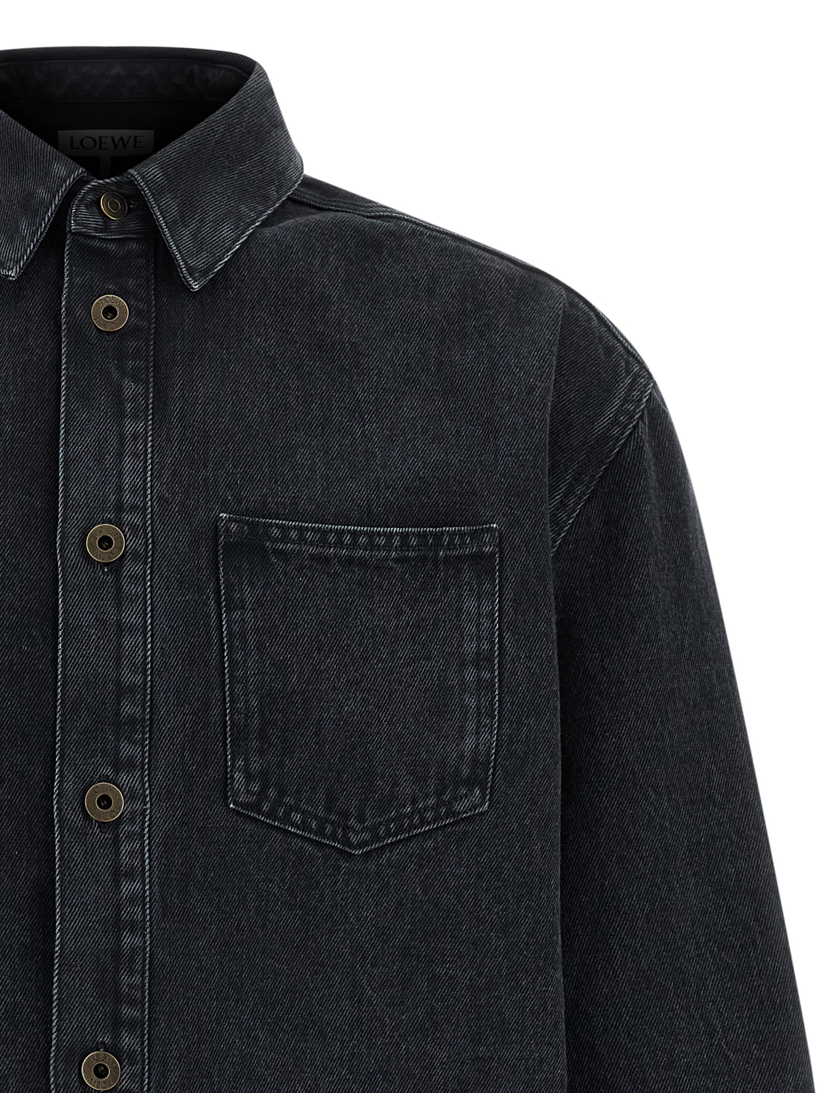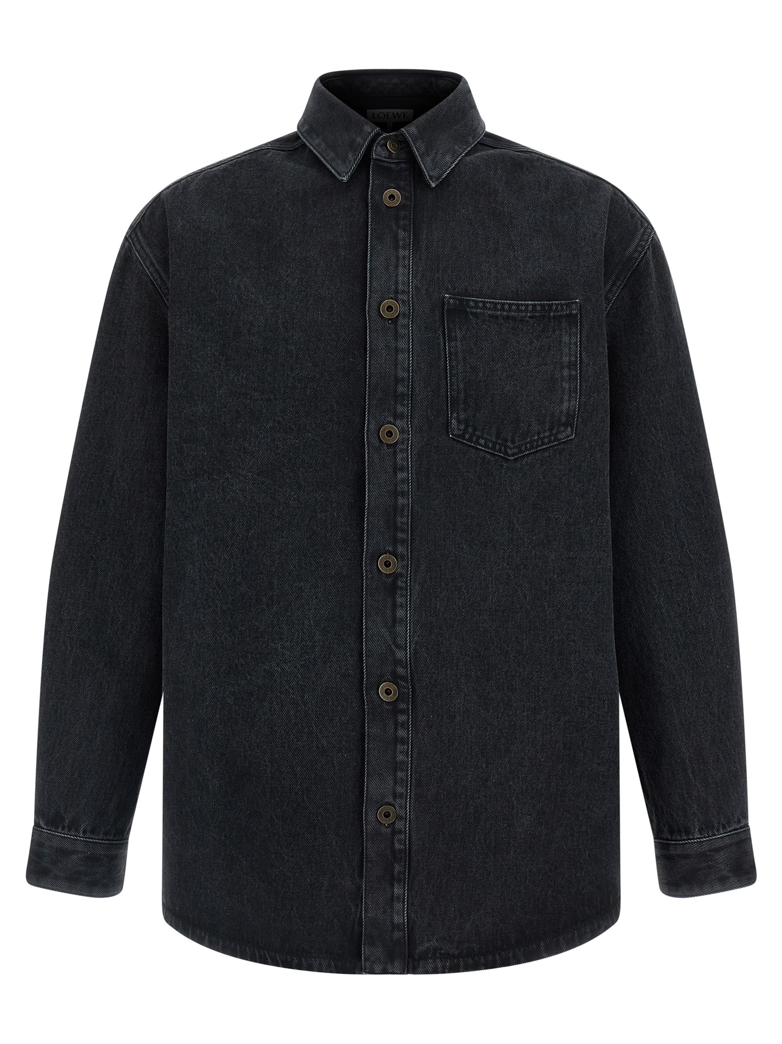 Medium weight cotton denim overshirt, chest pocket, front metal button closure, long cuffed sleeves and tone-on-tone 'Anagram' embroidery on the elbow.