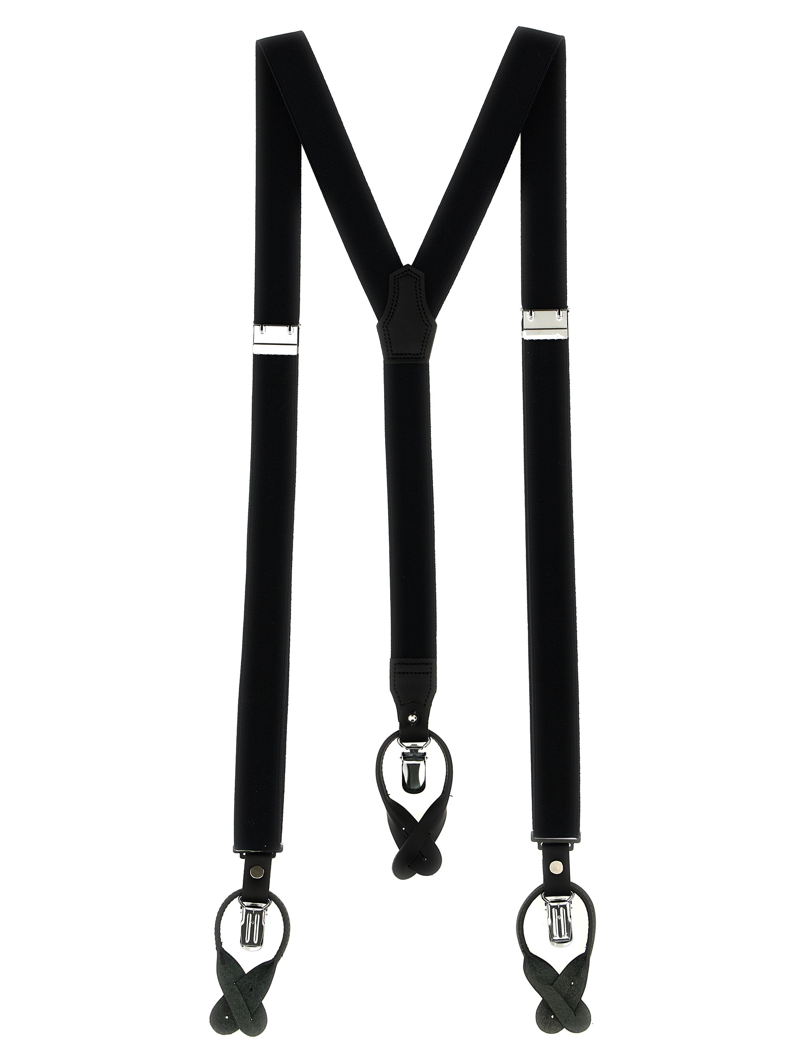 Stretch fabric braces with leather details, metal clip accessory and button accessory.