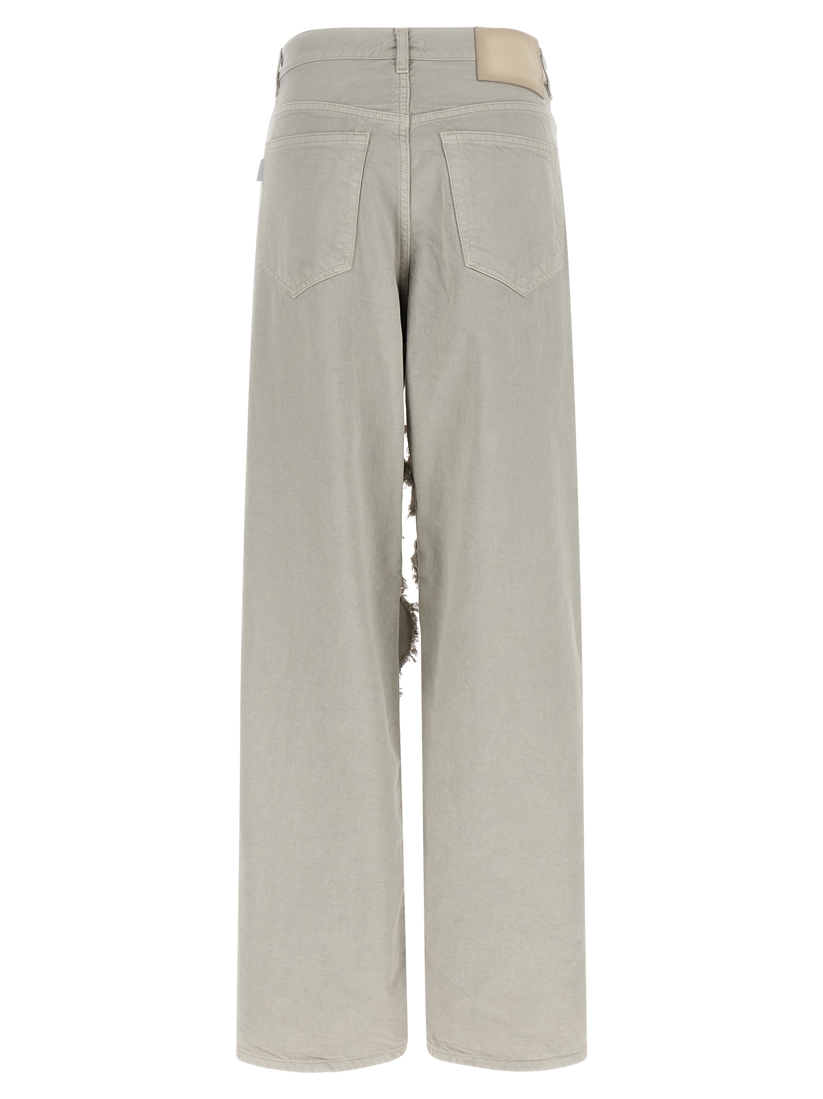 Bull 'Bonnie' cotton denim jeans, front breaks and rips with tonal satin insert, wide flared leg, front zip and button closure, five pockets, back logo tag, and asymmetric leg bottom.