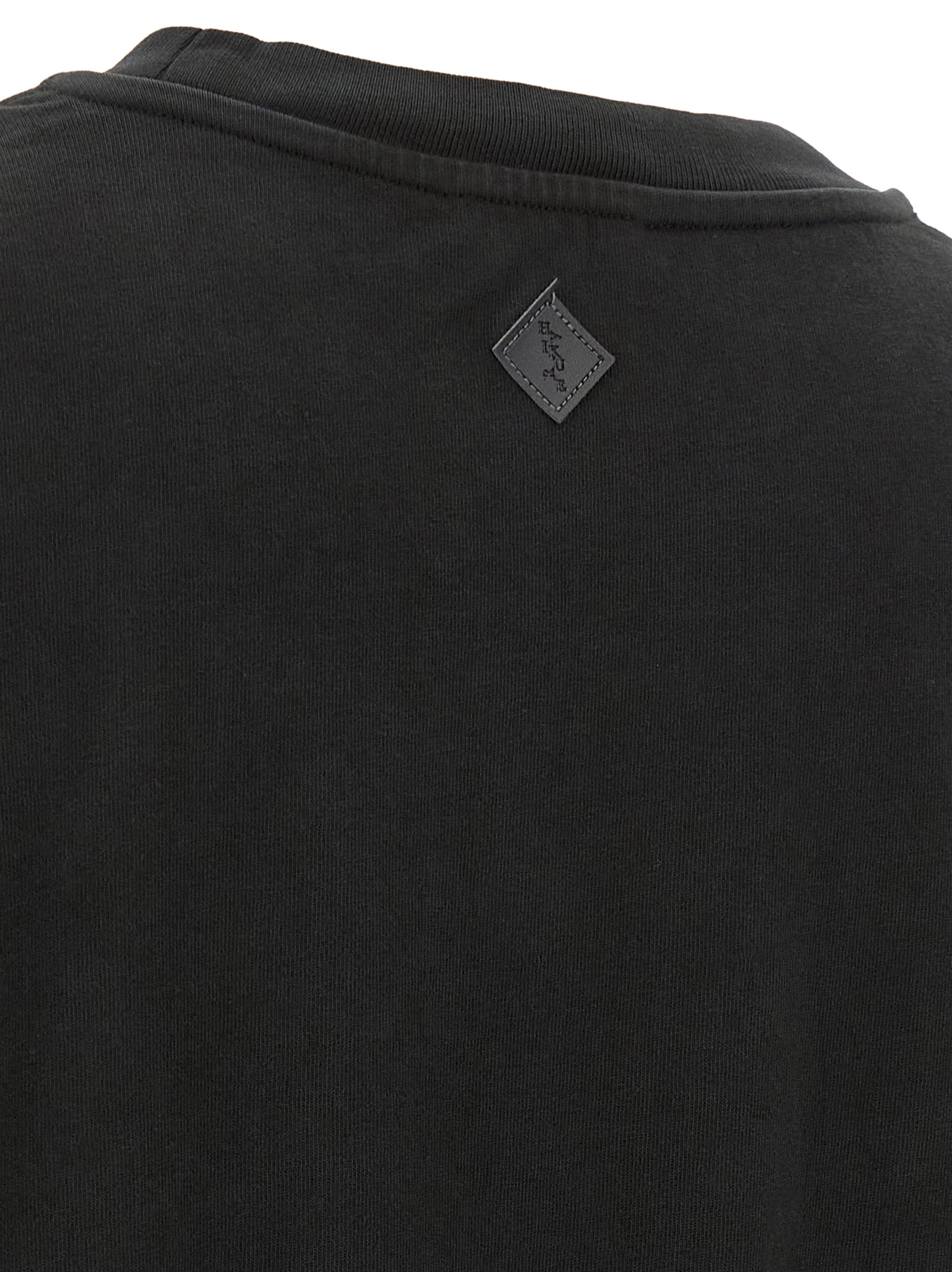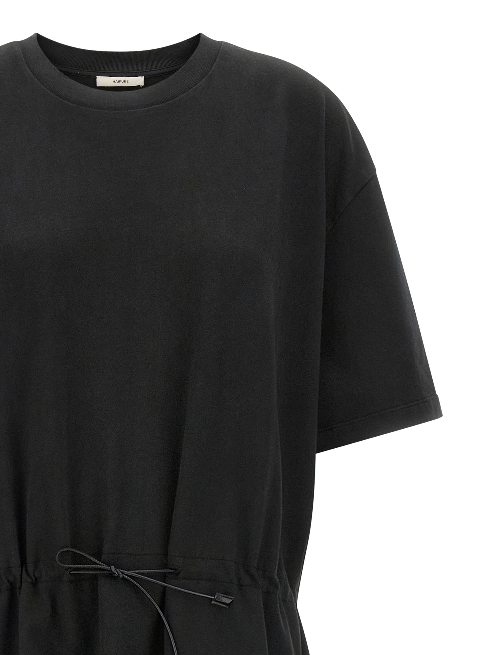 Long 'Joopy' dress consisting of cotton jersey t-shirt on top, crew neck, short sleeves with dropped shoulders, drawstring at the waist and lower part in wrinkled satin-effect fabric, wide and straight silhouette, wide side split, garment with raw cut hem.