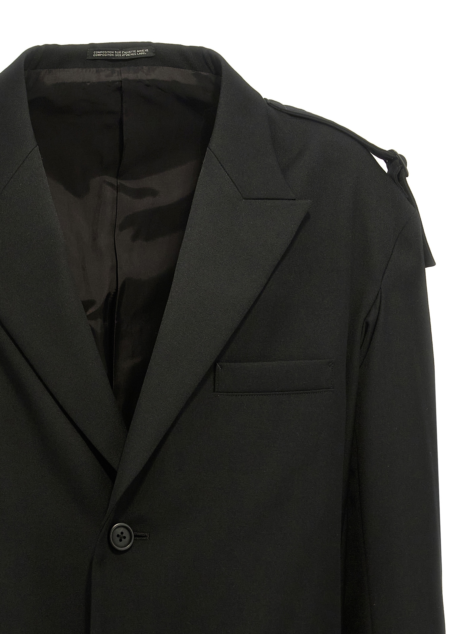 Single-breasted wool blazer with strap detail on shoulders, button closure, pockets, long sleeves, back vents.