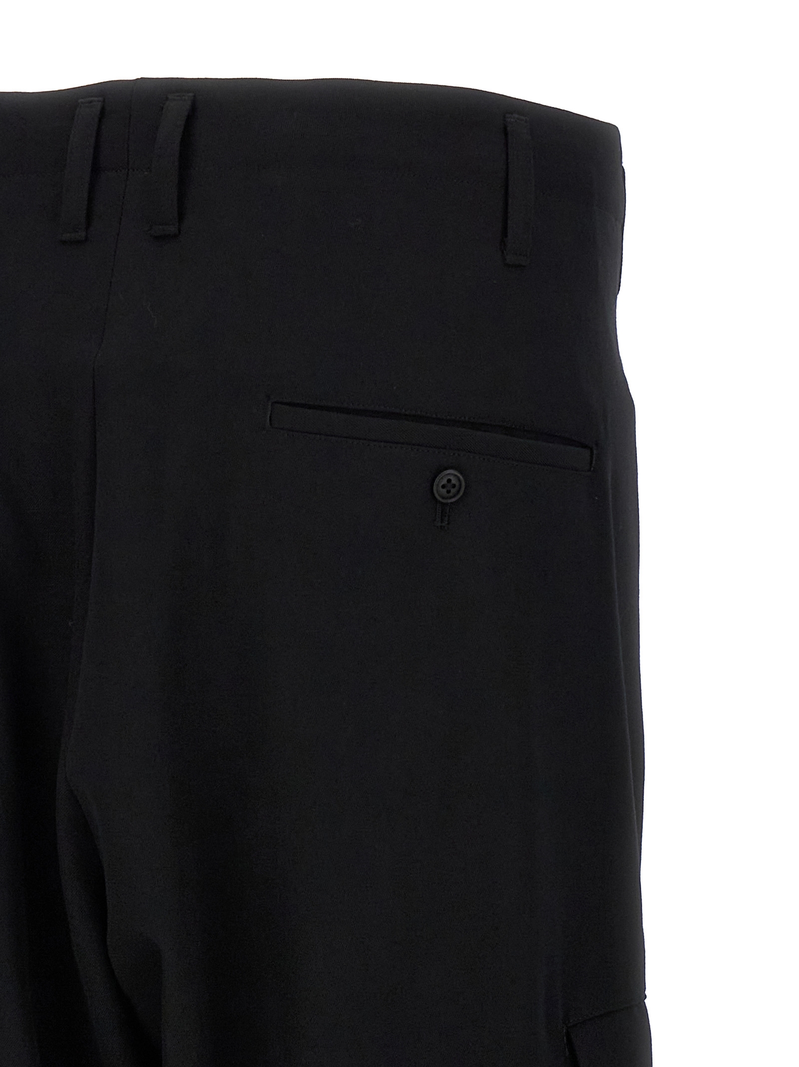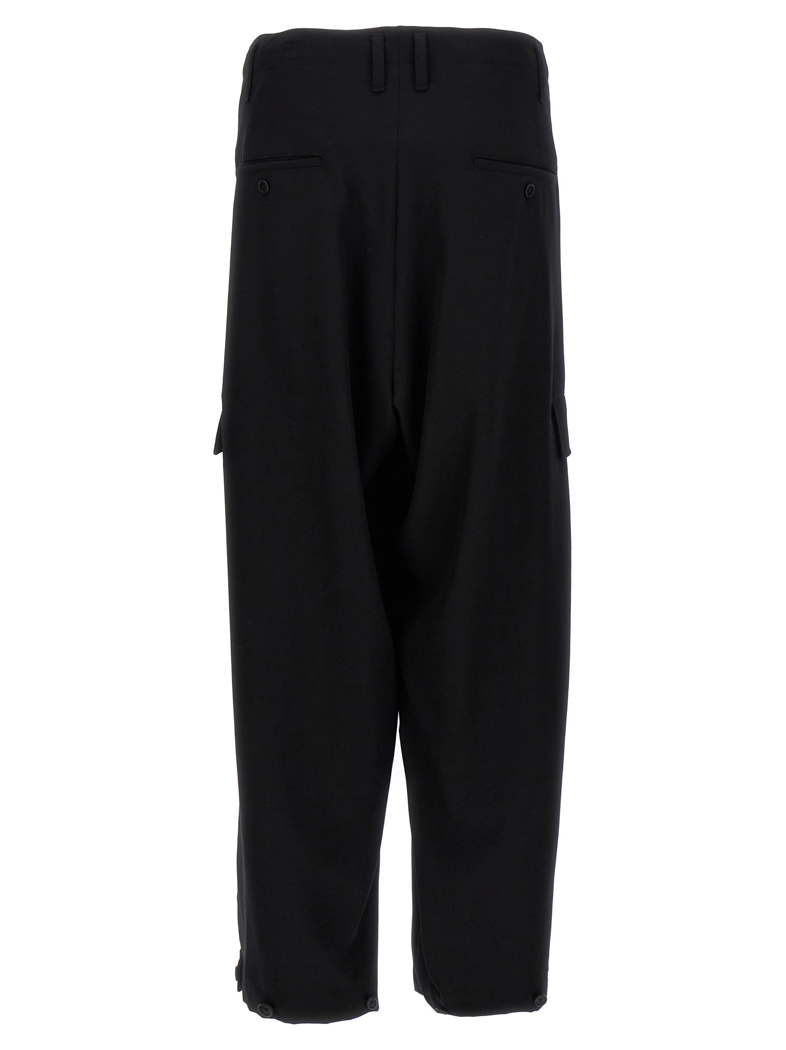 'Tab Wide P' wool pants, zip and button closure, adjustable drawstring at the waist, pockets, adjustable strap detail with ankle buttons.