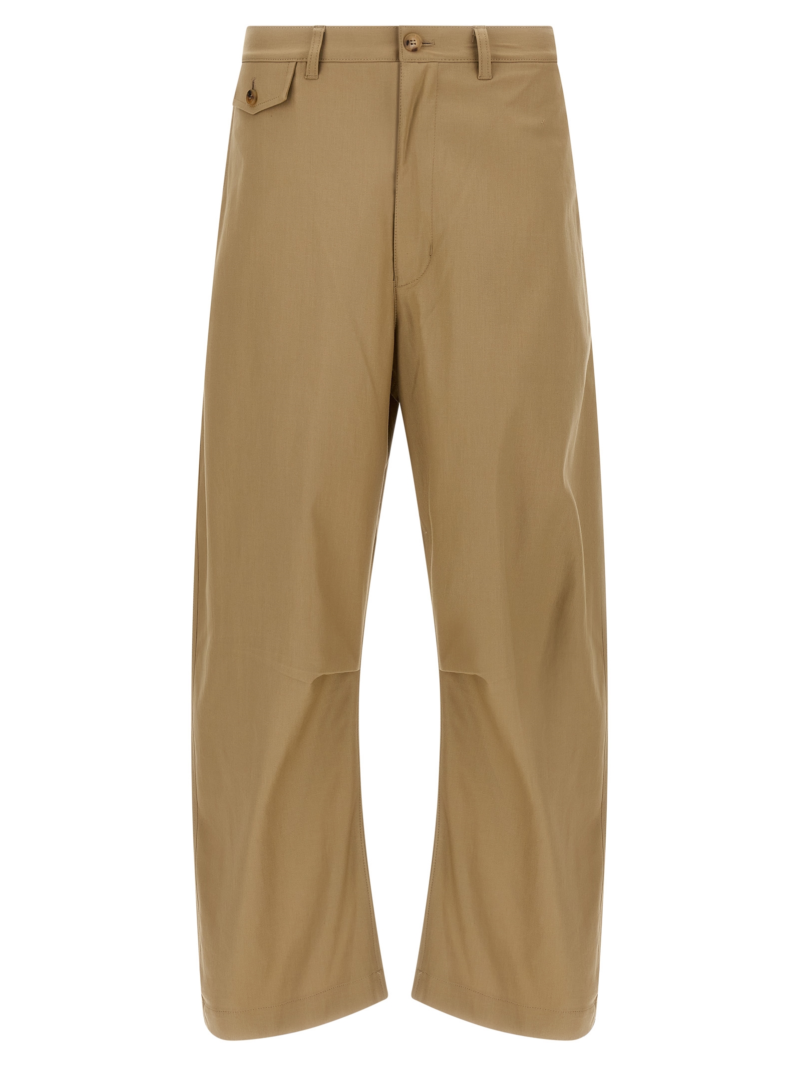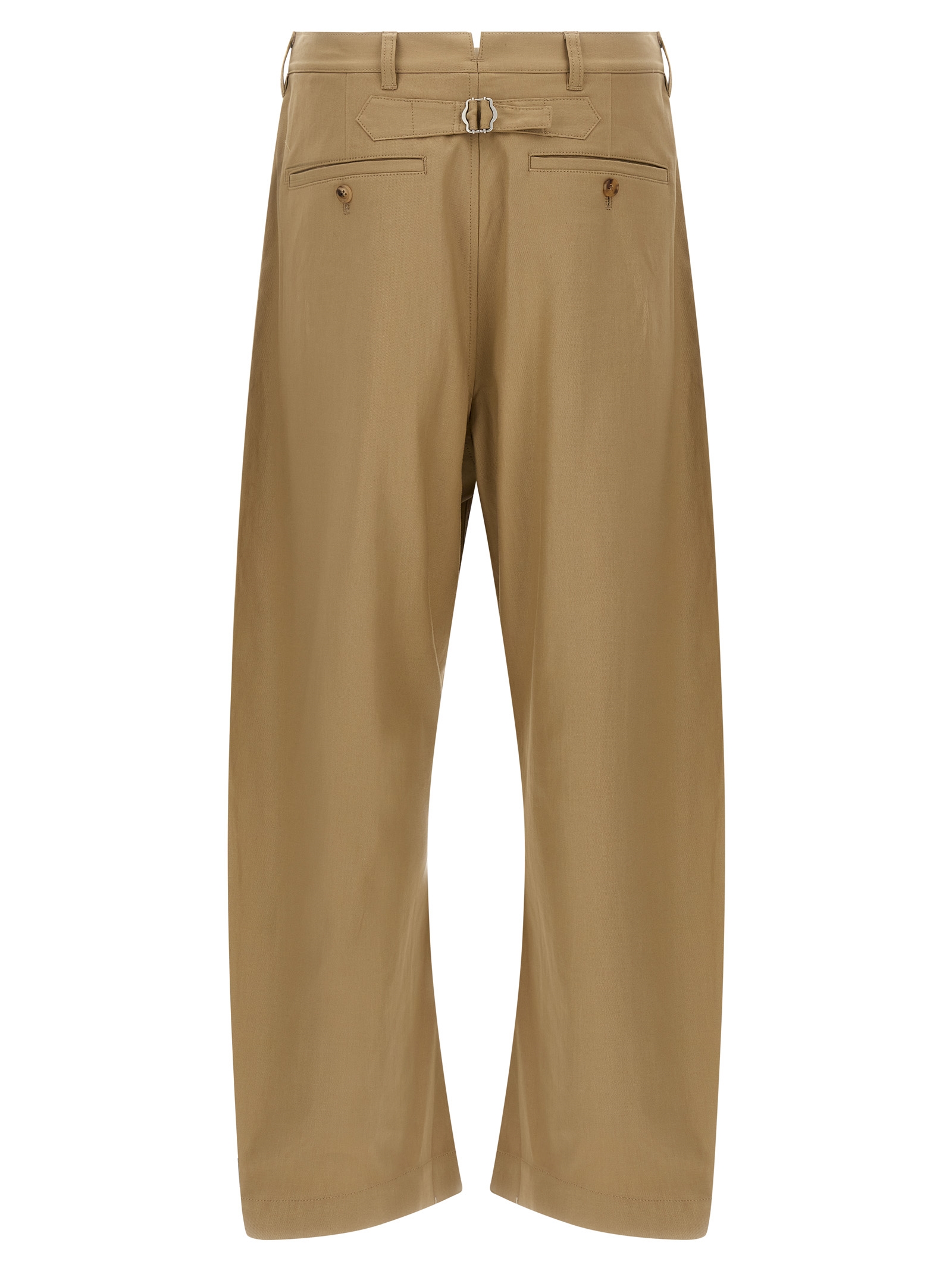 Light cotton trousers, curved leg with knee pincer, low crotch, front zip and button closure, adjustable back strap, pockets.