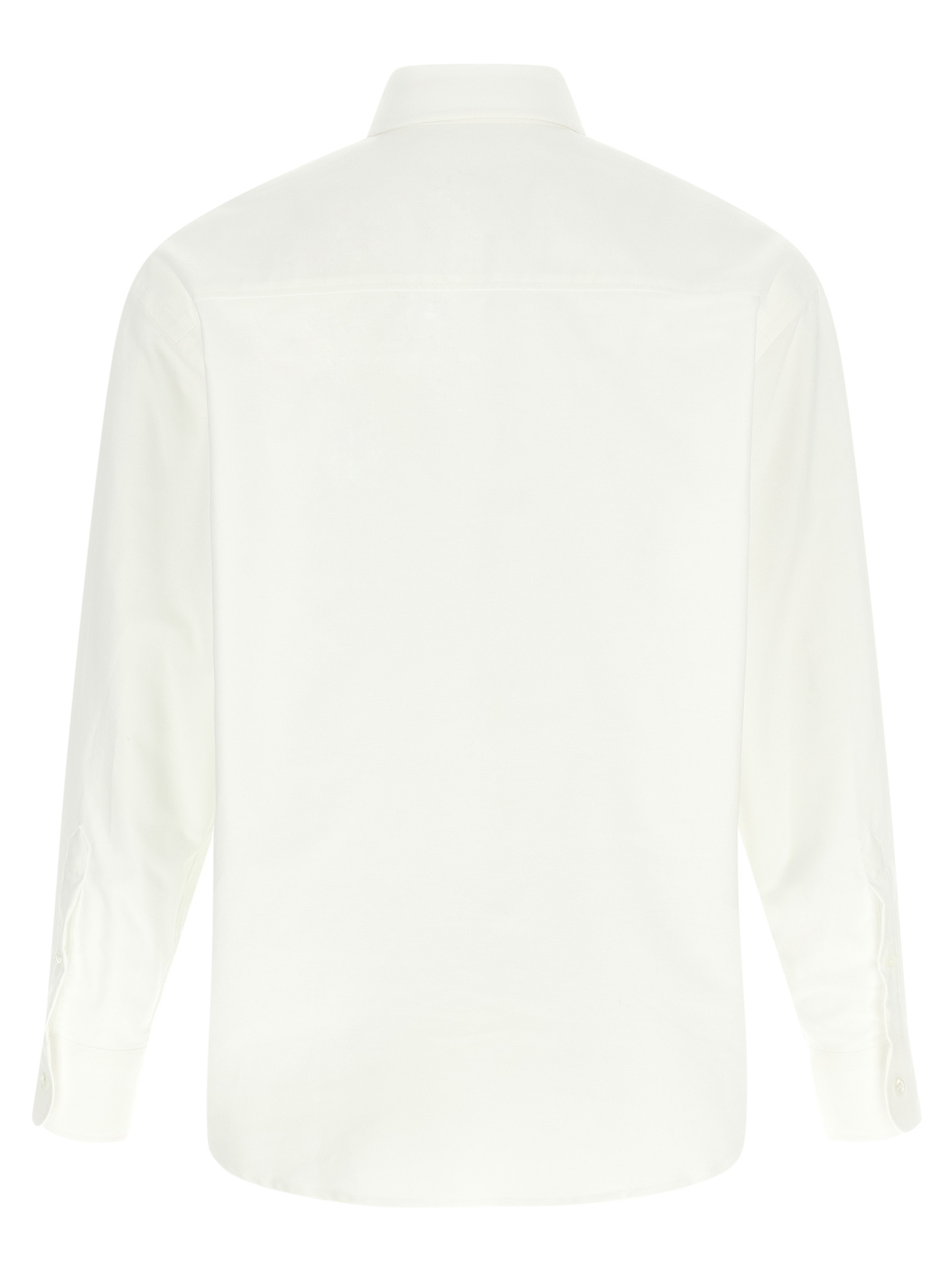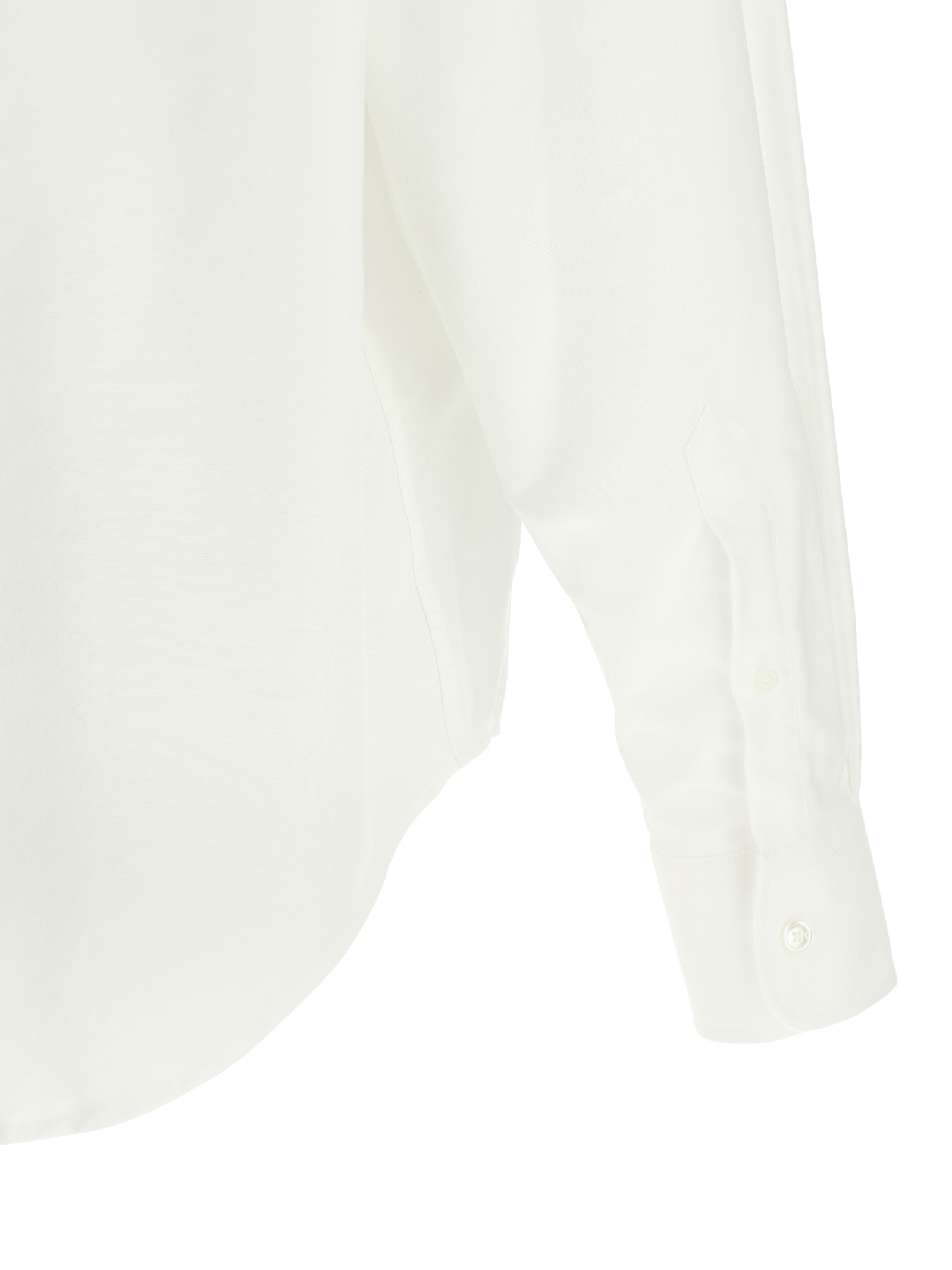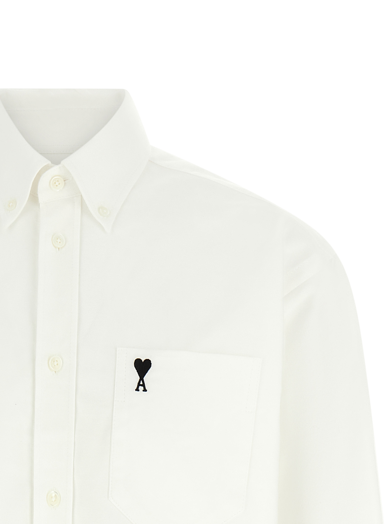 Oxford cotton shirt with button-down style, pocket with contrasting 'Ami de Coeur' embroidery, front button closure, long sleeves with cuffs and dropped shoulders, asymmetrical and rounded hem.