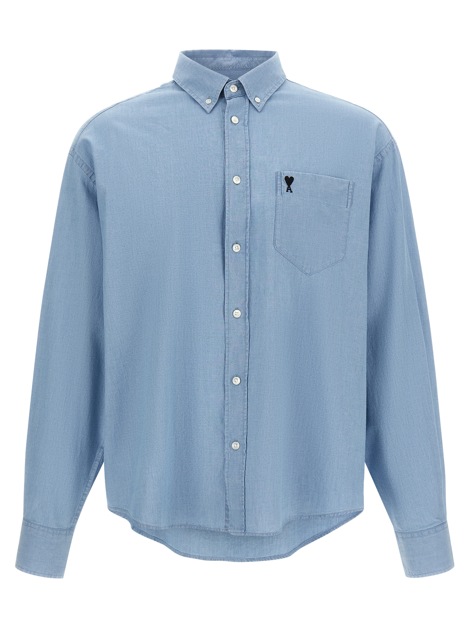 Denim-effect Oxford cotton shirt, pocket with 'Ami de Coeur' embroidery, button-down style, front button closure, long sleeves with cuffs and dropped shoulders, rounded and asymmetrical hem.