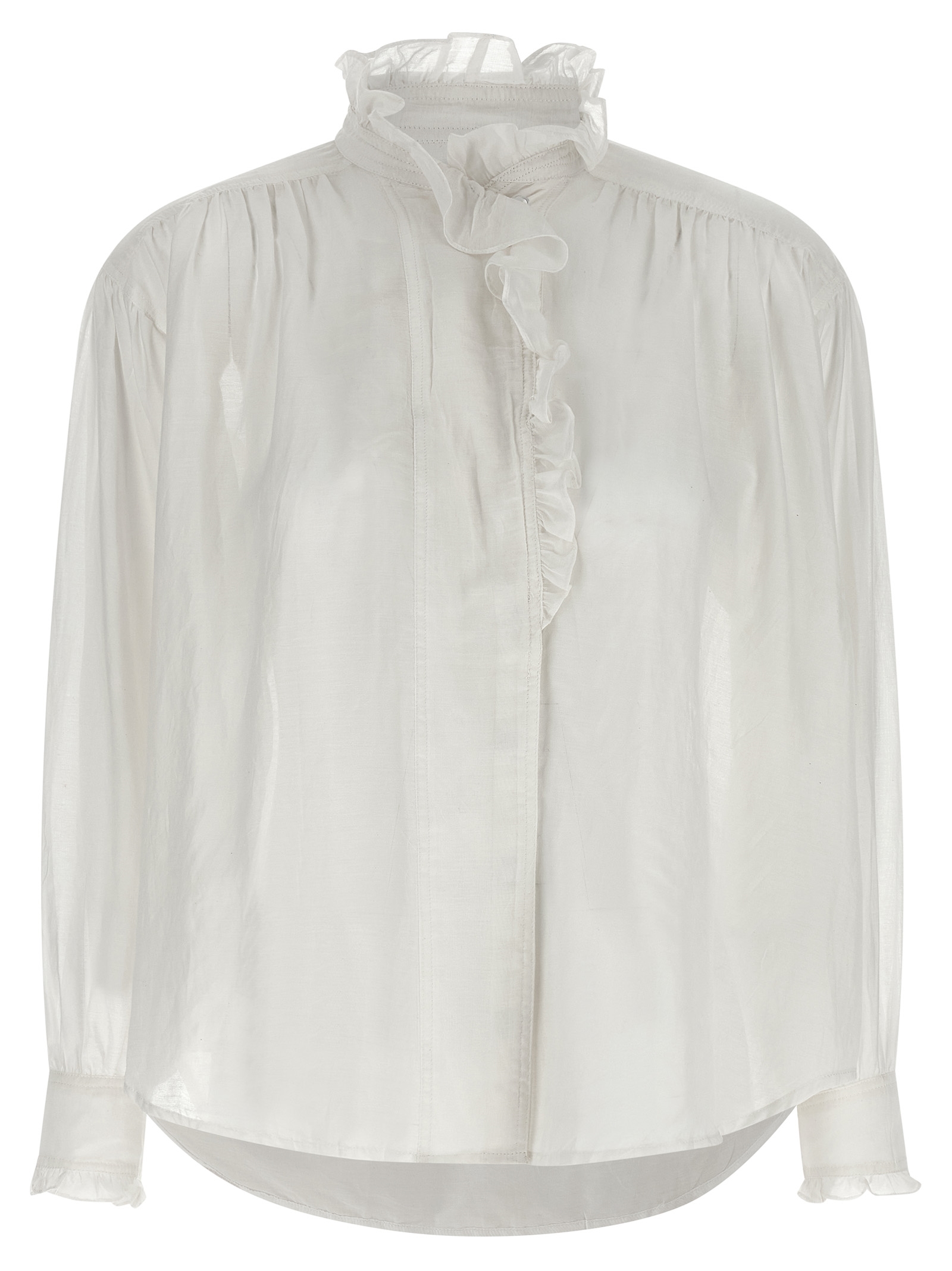 'Pamias' cotton blend voile top with ruffles, front asymmetric snap button closure, long cuffed sleeves, and asymmetrical collar.