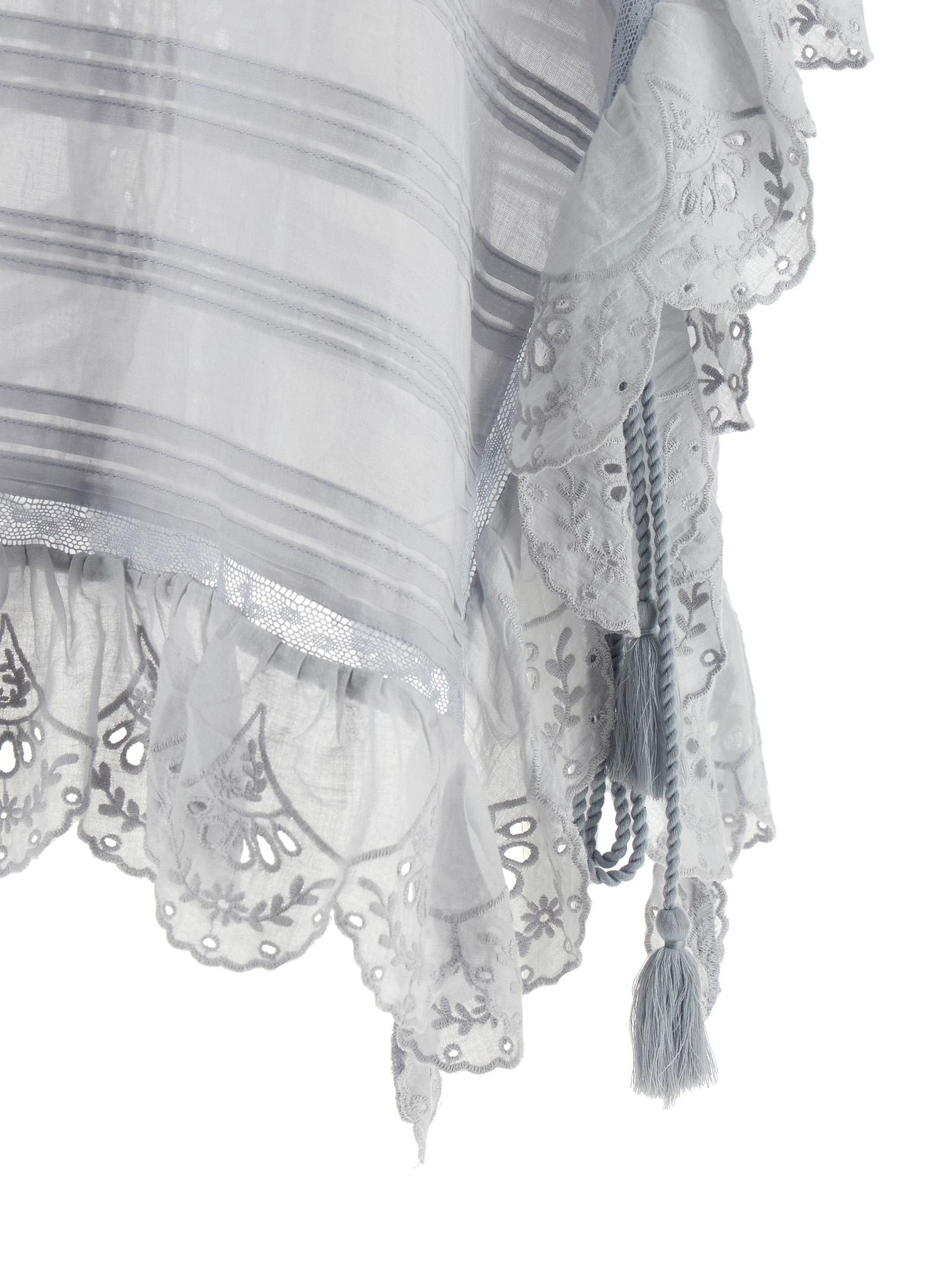 'Payton' sangallo cotton top with tone-on-tone floral lace insert, ruffles at the edges, round neckline with tie-up cord, wide short sleeves, side lanyards with tassels to tie, asymmetrical hem.