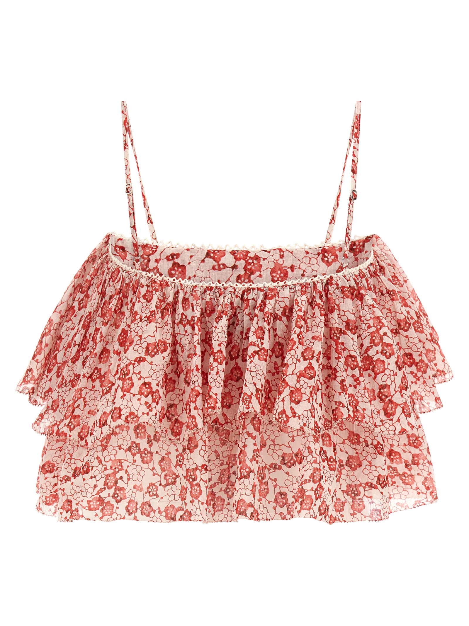 'Erisa' all-over flower-print cotton top, double flounce crop model with curls, lace insert on the neckline, thin and adjustable straps.